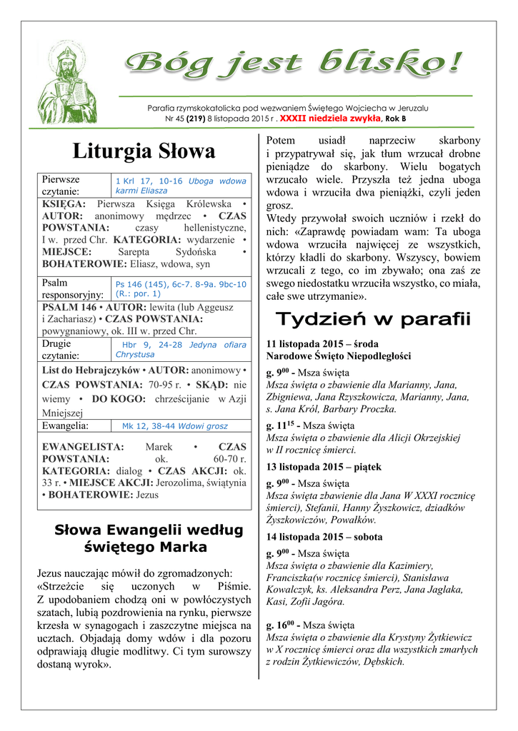 Parafia rzymskokatolicka pod wezwaniem Świętego Wojciecha w Jeruzalu Nr 45 (219) 8 listopada 2015 r . XXXII niedziela zwykła, Rok B Liturgia Słowa Pierwsze 1 Krl 17, 10-16 Uboga wdowa karmi Eliasza czytanie: KSIĘGA: Pierwsza Księga Królewska • AUTOR: anonimowy mędrzec • CZAS POWSTANIA: czasy hellenistyczne, I w. przed Chr. KATEGORIA: wydarzenie • MIEJSCE: Sarepta Sydońska • BOHATEROWIE: Eliasz, wdowa, syn Psalm Ps 146 (145), 6c-7. 8-9a. 9bc-10 responsoryjny: (R.: por. 1) PSALM 146 • AUTOR: lewita (lub Aggeusz i Zachariasz) • CZAS POWSTANIA: powygnaniowy, ok. III w. przed Chr. Drugie Hbr 9, 24-28 Jedyna ofiara Chrystusa czytanie: List do Hebrajczyków • AUTOR: anonimowy • CZAS POWSTANIA: 70-95 r. • SKĄD: nie wiemy • DO KOGO: chrześcijanie w Azji Mniejszej Mk 12, 38-44 Wdowi grosz Ewangelia: EWANGELISTA: Marek • CZAS POWSTANIA: ok. 60-70 r. KATEGORIA: dialog • CZAS AKCJI: ok. 33 r. • MIEJSCE AKCJI: Jerozolima, świątynia • BOHATEROWIE: Jezus Słowa Ewangelii według świętego Marka Jezus nauczając mówił do zgromadzonych: «Strzeżcie się uczonych w Piśmie. Z upodobaniem chodzą oni w powłóczystych szatach, lubią pozdrowienia na rynku, pierwsze krzesła w synagogach i zaszczytne miejsca na ucztach. Objadają domy wdów i dla pozoru odprawiają długie modlitwy. Ci tym surowszy dostaną wyrok». Potem usiadł naprzeciw skarbony i przypatrywał się, jak tłum wrzucał drobne pieniądze do skarbony. Wielu bogatych wrzucało wiele. Przyszła też jedna uboga wdowa i wrzuciła dwa pieniążki, czyli jeden grosz. Wtedy przywołał swoich uczniów i rzekł do nich: «Zaprawdę powiadam wam: Ta uboga wdowa wrzuciła najwięcej ze wszystkich, którzy kładli do skarbony. Wszyscy, bowiem wrzucali z tego, co im zbywało; ona zaś ze swego niedostatku wrzuciła wszystko, co miała, całe swe utrzymanie». Tydzień w parafii 11 listopada 2015 – środa Narodowe Święto Niepodległości g. 900 - Msza święta Msza święta o zbawienie dla Marianny, Jana, Zbigniewa, Jana Rzyszkowicza, Marianny, Jana, s. Jana Król, Barbary Proczka. g. 1115 - Msza święta Msza święta o zbawienie dla Alicji Okrzejskiej w II rocznicę śmierci. 13 listopada 2015 – piątek g. 900 - Msza święta Msza święta zbawienie dla Jana W XXXI rocznicę śmierci), Stefanii, Hanny Żyszkowicz, dziadków Żyszkowiczów, Powałków. 14 listopada 2015 – sobota g. 900 - Msza święta Msza święta o zbawienie dla Kazimiery, Franciszka(w rocznicę śmierci), Stanisława Kowalczyk, ks. Aleksandra Perz, Jana Jaglaka, Kasi, Zofii Jagóra. g. 1600 - Msza święta Msza święta o zbawienie dla Krystyny Żytkiewicz w X rocznicę śmierci oraz dla wszystkich zmarłych z rodzin Żytkiewiczów, Dębskich. 15 listopada 2015 – XXXIII niedziela zwykła dostrzegł w świątyni ignorowaną przez wszystkich ubogą g. - Msza święta. Msza święta o zbawienie dla Stanisława, Mariannę Ćwiek, Józefa, Aleksandry Rojek, dziadków Rojków i Ćwieków. i pokorną wdowę” – piszą polscy biskupi w liście pasterskim g. – Spotkanie dzieci przygotowujących się do I Komunii świętej. Przypominają też o ginących za wiarę misjonarzach. Wśród g. - Msza święta wspólna - o obfite Boże błogosławieństwo dla parafian. - o zbawienie dla Piotra Owczarczyka - o zbawienie dla Krzysztofa Osińskiego - o zbawienie dla Barbary Świątek - o zbawienie dla Barbary Ośko - o zbawienie dla Adama Wróblewskiego. - o zbawienie dla Ryszarda Kostyry - o zbawienie dla Mieczysława Ostrowskiego Tomaszek, którzy zostali zamordowani 20 lat temu przez 900 1000 1115 na najbliższą niedzielę. Pasterze Kościoła w Polsce przywołują w nim m.in. ludobójstwo ormian w Turcji, którego setną rocznicę w tym roku przeżywamy. nich są franciszkanie o. Zbigniew Strzałkowski i o. Michał terrorystów marksistowskiego ruchu „Świetlisty Szlak”, a którzy w grudniu br. będą beatyfikowani. Według Raportu Papieskiego Stowarzyszenia Pomoc Kościołowi w Potrzebie w 2014 roku do łamania wolności religijnej dochodziło w 116 krajach świata, a w dwudziestu z nich sytuacja jest dramatyczna. „Jako chrześcijanie nie możemy patrzeć na te wydarzenia obojętnie. Społeczny wymiar zła i grzechu, prowadzący do * * * * * Zachęcam do nabywania tygodnika Idziemy oraz zabierania do domu naszej gazetki parafialnej. Dziś przed kościołem prowadzona jest zbiórka na gazetkę parafialną. Za tydzień prowadzona będzie zbiórka na wsparcie Światowych Dni Młodzieży nadto taca zbierana w przyszłą niedzielę przeznaczona będzie na ten właśnie cel. prześladowań chrześcijan, domaga się odpowiedzi ze strony wierzących. Musimy zająć stanowisko zaangażowane i ewangeliczne” – apelują biskupi. Proszą o solidarność z prześladowanym Kościołem. Zachęcają też do tego, by i wspólnotach w rodzinach wiernych kształtować postawy miłości, braterstwa i szacun ku dla innych ludzi. „Zło obecne w świecie może być zwyciężone jedynie przez heroiczne dobro i otwarcie na moc Boga, który nigdy nie posługuje się przemocą i agresją” – podkreślają. Kronika parafialna VII Dzień Solidarności z Kościołem Prześladowanym 4 listopada - Na plebanii kręcono sceny do X serii „Rancza” 5 listopada - Zakupiono komplet Lekcjonarzy Mszalnych (350) - Podpisano porozumienie z Urzędem Miejskim w sprawie budowy parkingu - Podpisano porozumienie z Urzędem Miejskim w sprawie udostępnienia miejsca pod przepompownię Stowarzyszenia organizowany dzięki inicjatywie Pomoc Kościołowi Papieskiego w Potrzebie poświęcony jest drugi raz z rzędu Syrii, gdzie od 2011 roku trwa konflikt zbrojny. List pasterski o prześladowaniu chrześcijan to już kolejny głos Episkopatu Polski w tej sprawie. Prezydium KEP w komunikacie z 3 listopada wsparło prośbę Pomocy Kościołowi w Potrzebie o modlitwę i ofiary na rzecz prześladowanych. Pomoc ze strony Kościoła w Polsce dla ofiar walk na Bliskim Wschodzie d