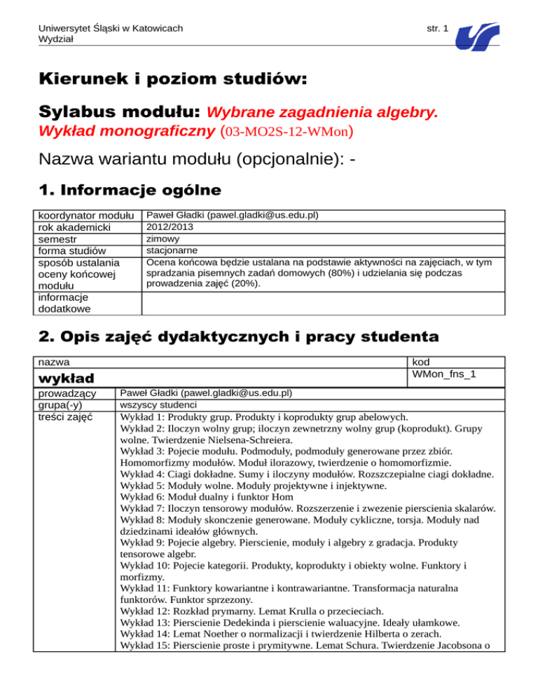 Uniwersytet Śląski w Katowicach Wydział str. 1 Kierunek i poziom studiów: Sylabus modułu: Wybrane zagadnienia algebry. Wykład monograficzny (03-MO2S-12-WMon) Nazwa wariantu modułu (opcjonalnie): 1. Informacje ogólne koordynator modułu rok akademicki semestr forma studiów sposób ustalania oceny końcowej modułu informacje dodatkowe Paweł Gładki ([email protected]) 2012/2013 zimowy stacjonarne Ocena końcowa będzie ustalana na podstawie aktywności na zajęciach, w tym spradzania pisemnych zadań domowych (80%) i udzielania się podczas prowadzenia zajęć (20%). 2. Opis zajęć dydaktycznych i pracy studenta nazwa kod WMon_fns_1 wykład prowadzący grupa(-y) treści zajęć Paweł Gładki ([email protected]) wszyscy studenci Wykład 1: Produkty grup. Produkty i koprodukty grup abelowych. Wykład 2: Iloczyn wolny grup; iloczyn zewnetrzny wolny grup (koprodukt). Grupy wolne. Twierdzenie Nielsena-Schreiera. Wykład 3: Pojecie modułu. Podmoduły, podmoduły generowane przez zbiór. Homomorfizmy modułów. Moduł ilorazowy, twierdzenie o homomorfizmie. Wykład 4: Ciagi dokładne. Sumy i iloczyny modułów. Rozszczepialne ciagi dokładne. Wykład 5: Moduły wolne. Moduły projektywne i injektywne. Wykład 6: Moduł dualny i funktor Hom Wykład 7: Iloczyn tensorowy modułów. Rozszerzenie i zwezenie pierscienia skalarów. Wykład 8: Moduły skonczenie generowane. Moduły cykliczne, torsja. Moduły nad dziedzinami ideałów głównych. Wykład 9: Pojecie algebry. Pierscienie, moduły i algebry z gradacja. Produkty tensorowe algebr. Wykład 10: Pojecie kategorii. Produkty, koprodukty i obiekty wolne. Funktory i morfizmy. Wykład 11: Funktory kowariantne i kontrawariantne. Transformacja naturalna funktorów. Funktor sprzezony. Wykład 12: Rozkład prymarny. Lemat Krulla o przecieciach. Wykład 13: Pierscienie Dedekinda i pierscienie waluacyjne. Ideały ułamkowe. Wykład 14: Lemat Noether o normalizacji i twierdzenie Hilberta o zerach. Wykład 15: Pierscienie proste i prymitywne. Lemat Schura. Twierdzenie Jacobsona o Uniwersytet Śląski w Katowicach Wydział str. 2 gestosci. Pierwsze twierdzenie strukturalne Wedderburna-Artina. metody prowadzenia zajęć liczba godzin dydaktycznych (kontaktowych ) liczba godzin pracy własnej studenta opis pracy własnej studenta organizacja zajęć literatura obowiązkowa literatura uzupełniająca adres strony www zajęć informacje dodatkowe jak w opisie modułu 30 20 samodzielne studiowanie notatek sporządzonych na wykładzie oraz literatury 2 godziny tygodniowo, ul. Bankowa 14, sala 231 1. 2. 3. 4. Białynicki-Birula, Algebra, PWN, Warszawa 2009 A.I. Kostrykin, Wstęp do algebry, t. I, PWN, Warszawa 2004 W. Marzantowski, P. Zarzycki, Elementarna teoria liczb, PWN, Warszawa 2006 Iwaszkiewicz-Rudoszańska, Wstęp do algebry i teorii liczb, Wydawnictwo UAM, Poznań 2009 5. Mostowski, M. Stark, Elementy algebry wyższej, PWN, Warszawa 1968 6. W. Narkiewicz, Teoria liczb, PWN, Warszawa 2003 7. W. Sierpiński, Arytmetyka teoretyczna, PWN, Warszawa 1967 http://www.math.us.edu.pl/~pgladki nazwa konwersatorium prowadzący grupa(-y) treści zajęć metody prowadzenia zajęć liczba godzin dydaktycznych (kontaktowych ) liczba godzin pracy własnej studenta opis pracy własnej studenta kod WMon_fns_2 Paweł Gładki Wszyscy studenci rozwiązywanie zadań z zestawów, z których każdy jest dokładnie dopasowany do każdej z części wykładu (patrz treść wykładów) połączone z dyskusją zadań domowych jak w opisie modułu 30 50 samodzielne rozwiązywania zadań z zestawów zadań dostarczonych przez wykładowcę Uniwersytet Śląski w Katowicach Wydział organizacja zajęć literatura obowiązkowa literatura uzupełniająca adres strony www zajęć informacje dodatkowe str. 3 2 godziny tygodniowo, ul. Bankowa 14, sala 231 jak w przypadku wykładów jak w przypadku wykładów http://www.math.us.edu.pl/~pgladki 3. Opis sposobów weryfikacji efektów kształcenia modułu nazwa aktywność na zajęciach kod WMon_w_1 kod(-y) zajęć osoba(-y) przeprowadzając a(-e) weryfikację grupa(-y) wymagania merytoryczne Paweł Gładki kryteria oceny aktywność na zajęciach będzie głównie dotyczyć przygotowania do zajęć na podstawie pisemnych zadań domowych w każdym z pisemnych zadań domowych można uzyskać 10 punktów; w sumie będzie to stanowiło 80% maksymalnej liczby punktów do zdobycia w trakcie przebieg procesu weryfikacji Wszyscy studenci Znajomość następujących pojęć: 1. Produkty grup. Produkty i koprodukty grup abelowych. 2. Iloczyn wolny grup; iloczyn zewnetrzny wolny grup (koprodukt). Grupy wolne. Twierdzenie Nielsena-Schreiera. 3. Pojecie modułu. Podmoduły, podmoduły generowane przez zbiór. Homomorfizmy modułów. Moduł ilorazowy, twierdzenie o homomorfizmie. 4. Ciagi dokładne. Sumy i iloczyny modułów. Rozszczepialne ciagi dokładne. 5. Moduły wolne. Moduły projektywne i injektywne. 6. Moduł dualny i funktor Hom 7. Iloczyn tensorowy modułów. Rozszerzenie i zwezenie pierscienia skalarów. 8. Moduły skonczenie generowane. Moduły cykliczne, torsja. Moduły nad dziedzinami ideałów głównych. 9. Pojecie algebry. Pierscienie, moduły i algebry z gradacja. Produkty tensorowe algebr. 10. Pojecie kategorii. Produkty, koprodukty i obiekty wolne. Funktory i morfizmy. 11. Funktory kowariantne i kontrawariantne. Transformacja naturalna funktorów. Funktor sprzezony. 12. Rozkład prymarny. Lemat Krulla o przecieciach. 13. Pierscienie Dedekinda i pierscienie waluacyjne. Ideały ułamkowe. 14. Lemat Noether o normalizacji i twierdzenie Hilberta o zerach. 15. Pierscienie proste i prymitywne. Lemat Schura. Twierdzenie Jacobsona o gestosci. Pierwsze twierdzenie strukturalne Wedderburna-Artina. Uniwersytet Śląski w Katowicach Wydział str. 4 konwersatoriów; dodatkowo, wg uznania prowadzącego, za aktywność podczas zajęć będzie można uzyskać do 20% punktów informacje dodatkowe