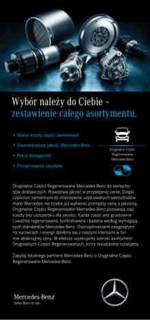 Wybór należy do Ciebie – zestawienie całego asortymentu. • Niskie koszty części zamiennych • Gwarantowana jakość Mercedes-Benz • Pełna dostępność Oryginalne Części Regenerowane Mercedes-Benz • Poszanowanie zasobów Oryginalne Części Regenerowane Mercedes-Benz do samochodów dostawczych. Prawdziwa jakość w przystępnej cenie. Dzięki częściom zamiennym do intensywnie użytkowanych samochodów marki Mercedes nie trzeba już wybierać pomiędzy ceną a jakością. Oryginalne Części Regenerowane Mercedes-Benz pozwalają ciąć koszty bez uszczerbku dla jakości. Każda część jest gruntownie i uważnie regenerowana, kontrolowana i badana według wymagających standardów Mercedes-Benz. Oszczędnościami osiągniętymi na surowcach i energii dzielimy się z naszymi klientami w formie atrakcyjnej ceny. W efekcie uzyskujemy szeroki asortyment Oryginalnych Części Regenerowanych, który nieustannie rozwijamy. Zapytaj lokalnego partnera Mercedes-Benz o Oryginalne Części Regenerowane Mercedes-Benz. Mercedes-Benz Oryginalne Części Regenerowane do samochodów dostawczych. Wiele świetnych powodów, aby obniżyć koszty bez poświęcania jakości. Viano/Vito/V-Class Sprinter Citan Kompletny silnik • • • Głowica cylindra (wstępnie zmontowana) • • • Kadłub silnika (bez głowicy /z głowicą i pokrywą zaworów) • • • Zespoły • Skrzynia rozdzielcza Skrzynia biegów, automatyczna • • Skrzynia biegów, manualna • • • Sprężarka klimatyzacji • • • Zacisk hamulcowy • • • Zestaw sprzęgła • • • Tarcza dociskowa sprzęgła • • • Koło zamachowe • • • Pompa wspomagania układu kierowniczego (hydrauliczna) • • Wał napędowy • • Płyta elektrohydrauliczna automatycznej skrzyni biegów • • Przekładnia kierownicza • • Przemiennik momentu obrotowego • • Wał pośredni skrzyni biegów • • Wał główny skrzyni biegów • • Turbosprężarka • • • Pompa wody • • • Katalizator NOx • • Wtryskiwacz silnika wysokoprężnego • • • Pompa paliwa wysokiego ciśnienia silnika wysokoprężnego • • • Filtr cząstek stałych (DPF) • • EGR valve • • Części mechaniczne Zawór hamulcowy Układy paliwowe i wydechowe Dozownik AdBlue® Moduł pompy AdBlue® Części elektryczne i elektroniczne Alternator • • Moduł silnika • • System nawigacji/COMAND • • Radio • • Rozrusznik • • Moduł sterujący automatycznej skrzyni biegów • • • • Napędy hybrydowe Silnik elektryczny • Akumulator wysokiego napięcia (HV) • Moduł sterujący zarządzania wysokim napięciem • Dostępność dla wszystkich modeli nie jest gwarantowana. W celu potwierdzenia dostępności wybranej części prosimy o kontakt z Autoryzowanym Serwisem Mercedes-Benz.
