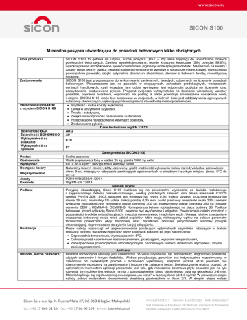 SICON S100 Mineralna posypka utwardzająca do posadzek betonowych lekko obciążonych Opis produktu Zastosowanie Właściwości posadzki z użyciem SICON S100 Ścieralność BCA Ścieralność BOHEMEGO Wytrzymałość na ściskanie Wytrzymałość na zginanie Postać Opakowanie Wydajność Dostępne kolory Magazynowanie Atesty Kontrola Podłoże Realizacja Metoda „suche na mokre” SICON S100 to gotowa do użycia, sucha posypka (DST – dry sake topping) do utwardzania nowych powierzchni betonowych. Zawiera wyselekcjonowane, twarde kruszywa kwarcowe (Si0 2 powyżej 99,8%), wysokosprawne modyfikowane spoiwo cementowe, pigmenty i inne specjalne dodatki. Naniesiona na świeży i zatarty beton tworzy gładką, twardą i odporną na ścieranie warstwę o strukturze marmurkowej. Wzmocniona powierzchnia posadzki, dzięki optymalnie dobranym składnikom, stanowi z betonem trwałą, monolityczną strukturę. SICON S100 jest przeznaczona do wykonywania zacieranych, twardych, odpornych na ścieranie posadzek betonowych. Przeznaczona jest na posadzki w magazynach, zakładach produkcyjnych, warsztatach, centrach handlowych, czyli wszędzie tam gdzie wymagana jest odporność podłoża na ścieranie oraz zdecydowanie zredukowane pylenie. Preparat zwiększa wytrzymałości na ściskanie wierzchniej warstwy posadzki, poprawia twardości, odporności na poślizg a także powoduje zmniejszenie nasiąkania wodą i olejem. SICON S100 może być stosowana w miejscach, w których brak jest oddziaływania agresywnych substancji chemicznych, wpływających korozyjnie na stwardniałą matrycę cementową. Szybkość i niskie koszty wykonania, Łatwa w utrzymaniu czystości, Trwała i estetyczna, Zwiększona odporność na ścieranie i uderzenia, Przeznaczona na stosowanie wewnątrz obiektów, Zredukowane pylenie. Dane techniczne wg EN 13813 AR 2 A9 C70 F7 Dane produktu SICON S100 Sucha zaprawa Worki papierowe z folią o wadze 25 kg, paleta 1000 kg netto Ok. 4 do 6 kg/m2, przy grubości warstwy 3 mm Naturalny /szary/, zielony, żółty, czerwony, grafit, możliwość wykonania koloru na indywidualne zamówienie okres 9-ciu miesięcy w fabrycznie zamkniętych opakowaniach w chłodnym i suchym miejscu (temp. 5°C do 40°C) PZH HK/B/0538/01/2014 Wg PN-EN 13813 Sposób użycia Posypkę utwardzającą Sicon S100 rozkłada się na powierzchni wykonanej ze świeżo rozłożonego i zagęszczonego betonu niskoskurczowego, według poniższych zaleceń: min. klasa mieszanki C20/25 według PN-EN 206-1:2003; stosunek w/c mniejszy lub równy 0,50; frakcja użytego kruszywa mniejsza lub równa 16 mm; minimalny 5% udział frakcji poniżej 0,25 mm; punkt piaskowy mieszanki około 33%; cement wyłącznie niskoalkaliczny, minimalny udział cementu 300 kg; maksymalny udział cementu 350 kg; rodzaje cementu CEM I, CEMII/A-S, CEMII/B-S. Konsystencja betonu rozkładanego na placu budowy S3. Podłoże betonowe, przed aplikacją Sicon S100, powinno być wyrównane i wilgotne. Powierzchnie należy oczyścić z pozostałości środków antyadhezyjnych, mleczka cementowego i nadmiaru wody. Uwaga: Istotne znaczenie w mieszance betonowej może mieć udział popiołów, które mają niekorzystny wpływ na celowe parametry techniczne powierzchni płyty betonowej oraz dodatkowo obniżają przyczepność warstwy posypki utwardzającej, doprowadzając do pylenia lub jej odspajania. Prace należy rozpocząć od zagwarantowania poniższych optymalnych czynników roboczych w trakcie realizacji procesu wykonawczego oraz przez kolejnych kilka dni po jego zakończeniu: Odpowiednia temperatura, wynosząca min. 5⁰C, Ochrona przed nadmiernym nasłonecznieniem, przeciągami, wysokimi temperaturami, Zabezpieczenie przed opadami atmosferycznymi, nanoszonym kurzem, drobinkami styropianu i innymi zanieczyszczeniami. Aplikacja Moment rozpoczęcia aplikacji jest uzależniony od wielu czynników, np. temperatury, wilgotności powietrza, użytych cementów i innych dodatków. Wobec powyższego, powinien być indywidualnie rozpatrywany, w zależności od konkretnych potrzeb i możliwości wykonawcy. Preparat SICON S100 powinien być równomiernie rozsypany na zawibrowany i jeszcze nie związany beton. Doświadczalnie można przyjąć, że optymalnym momentem aplikacji preparatów jest taki, gdy mieszanka betonowa płyty posadzki jest na tyle sztywna, że możliwe jest wejście na nią z pozostawieniem śladu odciśniętego buta na głębokości 3-6 mm. Materiał aplikuje się najskuteczniej dwuetapowo „na krzyż” w łącznej ilości od 4-6 kg/m2. W pierwszym etapie należy pokryć materiałem równomiernie obrabianą powierzchnie w ilości 2/3. W drugim etapie należy SICON S100 Metoda „mokre na mokre” Warunki BHP Uwagi końcowe rozsypać pozostałą część materiału tj. 1/3 i zacierać aż do momentu uzyskania odpowiedniej struktury gładkości posadzki. Proces rozpoczęcia zacierania mechanicznego jest uzależniony od szybkości zawilgocenia się zaaplikowanego materiału. Mieszanka musi równomiernie zaabsorbować wilgoć z podłoża betonowego, co skutkuje, zmianą barwy preparatu na ciemniejszą. Bezpośrednio po wykonaniu posadzki należy ją zabezpieczyć przed czynnikami zewnętrznymi, przede wszystkim przed odparowaniem wilgoci z betonu. Zaleca się stosowanie preparatów impregnacyjnych i/lub powłokowych stosownych do danego sytemu Sicon. W celu właściwego dojrzewania i uzyskania oczekiwanych parametrów zaleca się zastosowanie preparatu pielęgnująco-uszczelniającego MELAXIL. W przypadku posadzek dylatacyjnych do 24 godzin od wykonania posadzki (stosując standardowe cementy portlandzkie) powinny być nacięte szczeliny dylatacyjne zgodnie z projektem, które w zależności od przeznaczenia oraz późniejszych warunków eksploatacyjnych posadzki wypełnia się odpowiednimi masami dylatacyjnymi. Dodatkowo należy pamiętać, iż aplikacja utwardzacza na zastoiny wody oraz używanie wody w trakcie zacierania powierzchni powoduje obniże
