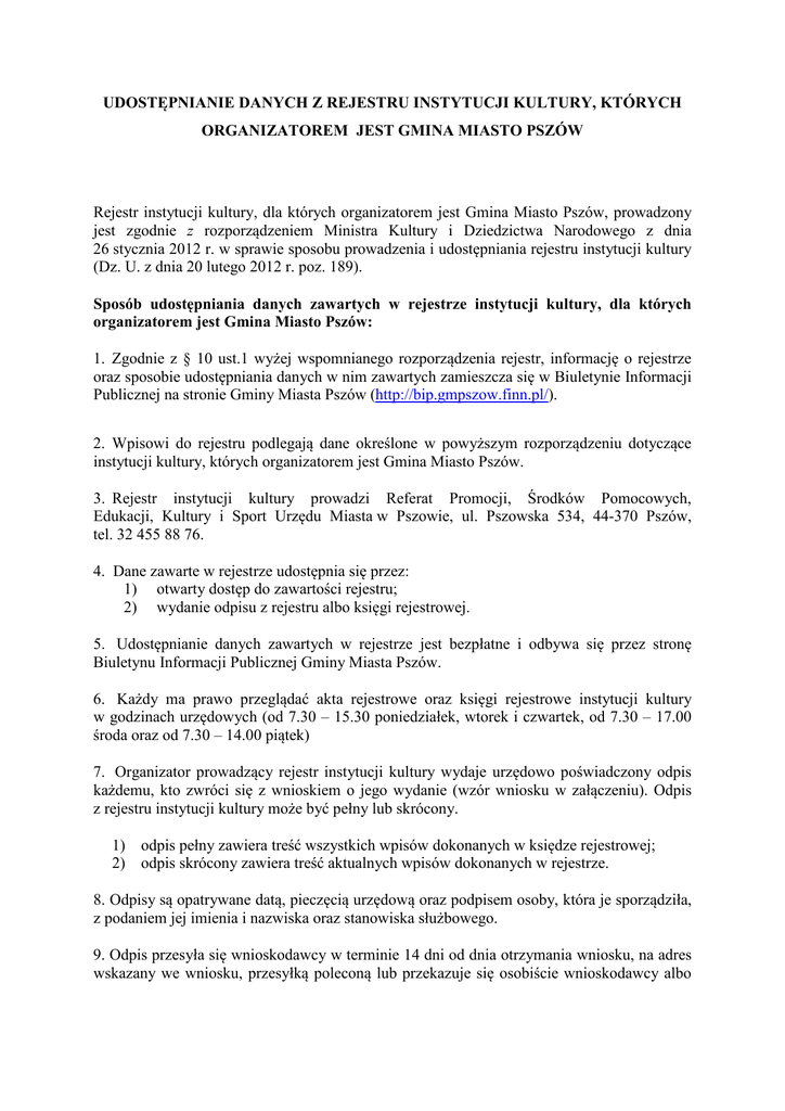 UDOSTĘPNIANIE DANYCH Z REJESTRU INSTYTUCJI KULTURY, KTÓRYCH ORGANIZATOREM JEST GMINA MIASTO PSZÓW Rejestr instytucji kultury, dla których organizatorem jest Gmina Miasto Pszów, prowadzony jest zgodnie z rozporządzeniem Ministra Kultury i Dziedzictwa Narodowego z dnia 26 stycznia 2012 r. w sprawie sposobu prowadzenia i udostępniania rejestru instytucji kultury (Dz. U. z dnia 20 lutego 2012 r. poz. 189). Sposób udostępniania danych zawartych w rejestrze instytucji kultury, dla których organizatorem jest Gmina Miasto Pszów: 1. Zgodnie z § 10 ust.1 wyżej wspomnianego rozporządzenia rejestr, informację o rejestrze oraz sposobie udostępniania danych w nim zawartych zamieszcza się w Biuletynie Informacji Publicznej na stronie Gminy Miasta Pszów (http://bip.gmpszow.finn.pl/). 2. Wpisowi do rejestru podlegają dane określone w powyższym rozporządzeniu dotyczące instytucji kultury, których organizatorem jest Gmina Miasto Pszów. 3. Rejestr instytucji kultury prowadzi Referat Promocji, Środków Pomocowych, Edukacji, Kultury i Sport Urzędu Miasta w Pszowie, ul. Pszowska 534, 44-370 Pszów, tel. 32 455 88 76. 4. Dane zawarte w rejestrze udostępnia się przez: 1) otwarty dostęp do zawartości rejestru; 2) wydanie odpisu z rejestru albo księgi rejestrowej. 5. Udostępnianie danych zawartych w rejestrze jest bezpłatne i odbywa się przez stronę Biuletynu Informacji Publicznej Gminy Miasta Pszów. 6. Każdy ma prawo przeglądać akta rejestrowe oraz księgi rejestrowe instytucji kultury w godzinach urzędowych (od 7.30 – 15.30 poniedziałek, wtorek i czwartek, od 7.30 – 17.00 środa oraz od 7.30 – 14.00 piątek) 7. Organizator prowadzący rejestr instytucji kultury wydaje urzędowo poświadczony odpis każdemu, kto zwróci się z wnioskiem o jego wydanie (wzór wniosku w załączeniu). Odpis z rejestru instytucji kultury może być pełny lub skrócony. 1) odpis pełny zawiera treść wszystkich wpisów dokonanych w księdze rejestrowej; 2) odpis skrócony zawiera treść aktualnych wpisów dokonanych w rejestrze. 8. Odpisy są opatrywane datą, pieczęcią urzędową oraz podpisem osoby, która je sporządziła, z podaniem jej imienia i nazwiska oraz stanowiska służbowego. 9. Odpis przesyła się wnioskodawcy w terminie 14 dni od dnia otrzymania wniosku, na adres wskazany we wniosku, przesyłką poleconą lub przekazuje się osobiście wnioskodawcy albo osobie przez niego upoważnionej, za pisemnym potwierdzeniem odbioru. Odpis może być przesłany również w postaci dokumentu elektronicznego. 10. Wydanie urzędowo poświadczonego odpisu z rejestru albo księgi rejestrowej podlega opłacie skarbowej w wysokości 5 zł od każdej pełnej lub zaczętej strony zgodnie z art. 4 ustawy o opłacie skarbowej (Dz. U. z 2006r. Nr 225, poz. 1635 z późn. zm.). 11. Wpłaty z tytułu opłaty skarbowej za wydanie poświadczonego odpisu z rejestru albo księgi rejestrowej należy dokonywać na konto Gminy Miasta Pszów: Bank Spółdzielczy w Jastrzębiu Zdroju nr 34 8470 0001 2038 0026 2352 0001. 12. Do wniosku o wydanie poświadczonego odpisu z rejestru albo księgi rejestrowej należy dołączyć dowód wpłaty z tytułu opłaty skarbowej. Pszów, dnia………………………… ……………………………… (Imię i nazwisko/nazwa instytucji) ……………………………… …………………………..….. (Adres) WNIOSEK o odpis z rejestru instytucji kultury Na podstawie § 10 ust. 5 rozporządzenia Ministra Kultury i Dziedzictwa Narodowego z dnia 26 stycznia 2012r. w sprawie sposobu prowadzenia i udostępniania rejestru instytucji kultury, wnoszę o wydanie urzędowo poświadczonego odpisu pełnego/skróconego* z rejestru instytucji kultury. Cel wydania: …………………………………………………………………………............. ………………………………………………………………………………………………... Odpis proszę przesłać* - na adres……………………………………………………………………………………….. - elektronicznie na adres:………………………………………………………………………. - odbiór osobisty. Załączniki: 1. Dowód zapłaty opłaty skarbowej ……………………….. (Czytelny podpis wnioskodawcy) Składający wniosek zobowiązany jest dołączyć do wniosku dowód zapłaty należnej opłaty skarbowej. Opłatę należy uiścić w Punkcie Kasowym Banku Spółdzielczego znajdującym się przy ul. Pszowskiej 530 lub na rachunek bankowy Gminy Miasta Pszów: Bank Spółdzielczy w Jastrzębiu Zdroju nr 34 8470 0001 2038 0026 2352 0001. Pisemne potwierdzenie odbioru. Potwierdzam odbiór wymienionego we wniosku odpisu składającego się z ……stron/y. ……………………….. (Czytelny podpis wnioskującego) *- niepotrzebne skreślić