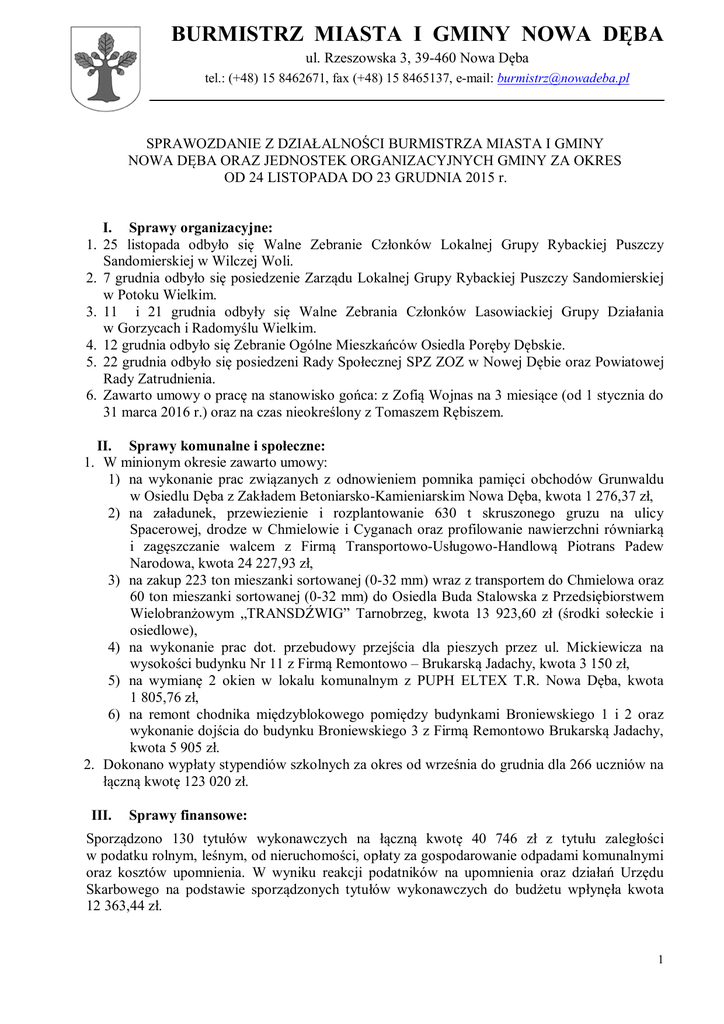 BURMISTRZ MIASTA I GMINY NOWA DĘBA ul. Rzeszowska 3, 39-460 Nowa Dęba tel.: (+48) 15 8462671, fax (+48) 15 8465137, e-mail: [email protected] SPRAWOZDANIE Z DZIAŁALNOŚCI BURMISTRZA MIASTA I GMINY NOWA DĘBA ORAZ JEDNOSTEK ORGANIZACYJNYCH GMINY ZA OKRES OD 24 LISTOPADA DO 23 GRUDNIA 2015 r. 1. 2. 3. 4. 5. 6. I. Sprawy organizacyjne: 25 listopada odbyło się Walne Zebranie Członków Lokalnej Grupy Rybackiej Puszczy Sandomierskiej w Wilczej Woli. 7 grudnia odbyło się posiedzenie Zarządu Lokalnej Grupy Rybackiej Puszczy Sandomierskiej w Potoku Wielkim. 11 i 21 grudnia odbyły się Walne Zebrania Członków Lasowiackiej Grupy Działania w Gorzycach i Radomyślu Wielkim. 12 grudnia odbyło się Zebranie Ogólne Mieszkańców Osiedla Poręby Dębskie. 22 grudnia odbyło się posiedzeni Rady Społecznej SPZ ZOZ w Nowej Dębie oraz Powiatowej Rady Zatrudnienia. Zawarto umowy o pracę na stanowisko gońca: z Zofią Wojnas na 3 miesiące (od 1 stycznia do 31 marca 2016 r.) oraz na czas nieokreślony z Tomaszem Rębiszem. II. Sprawy komunalne i społeczne: 1. W minionym okresie zawarto umowy: 1) na wykonanie prac związanych z odnowieniem pomnika pamięci obchodów Grunwaldu w Osiedlu Dęba z Zakładem Betoniarsko-Kamieniarskim Nowa Dęba, kwota 1 276,37 zł, 2) na załadunek, przewiezienie i rozplantowanie 630 t skruszonego gruzu na ulicy Spacerowej, drodze w Chmielowie i Cyganach oraz profilowanie nawierzchni równiarką i zagęszczanie walcem z Firmą Transportowo-Usługowo-Handlową Piotrans Padew Narodowa, kwota 24 227,93 zł, 3) na zakup 223 ton mieszanki sortowanej (0-32 mm) wraz z transportem do Chmielowa oraz 60 ton mieszanki sortowanej (0-32 mm) do Osiedla Buda Stalowska z Przedsiębiorstwem Wielobranżowym „TRANSDŹWIG” Tarnobrzeg, kwota 13 923,60 zł (środki sołeckie i osiedlowe), 4) na wykonanie prac dot. przebudowy przejścia dla pieszych przez ul. Mickiewicza na wysokości budynku Nr 11 z Firmą Remontowo – Brukarską Jadachy, kwota 3 150 zł, 5) na wymianę 2 okien w lokalu komunalnym z PUPH ELTEX T.R. Nowa Dęba, kwota 1 805,76 zł, 6) na remont chodnika międzyblokowego pomiędzy budynkami Broniewskiego 1 i 2 oraz wykonanie dojścia do budynku Broniewskiego 3 z Firmą Remontowo Brukarską Jadachy, kwota 5 905 zł. 2. Dokonano wypłaty stypendiów szkolnych za okres od września do grudnia dla 266 uczniów na łączną kwotę 123 020 zł. III. Sprawy finansowe: Sporządzono 130 tytułów wykonawczych na łączną kwotę 40 746 zł z tytułu zaległości w podatku rolnym, leśnym, od nieruchomości, opłaty za gospodarowanie odpadami komunalnymi oraz kosztów upomnienia. W wyniku reakcji podatników na upomnienia oraz działań Urzędu Skarbowego na podstawie sporządzonych tytułów wykonawczych do budżetu wpłynęła kwota 12 363,44 zł. 1 BURMISTRZ MIASTA I GMINY NOWA DĘBA ul. Rzeszowska 3, 39-460 Nowa Dęba tel.: (+48) 15 8462671, fax (+48) 15 8465137, e-mail: [email protected] IV. Sprawy inwestycyjne: Zakończono i odebrano prace dotyczące budowy parkingu wraz z chodnikiem przy drodze Siarkowej – Strefowej w Chmielowie. V. Sprawy z zakresu rozwoju lokalnego i współpracy: 1. Prowadzone jest postępowanie o udzielenie zamówień publicznego: kompleksowe świadczenie usług ubezpieczeniowych. 2. Wsparto akcję pomocy „Paczka Świąteczna dla Polaków na Kresach”, organizowaną przez Komitet Społeczny „Nowodębianie – Rodakom na Kresach” poprzez koordynację zbiórki żywności w sołectwach i osiedlach i pomoc w transporcie darów do Przemyśla (ponad 1250 kg). VI. Sprawy z zakresu gospodarki nieruchomościami i melioracji: 1. 23 listopada gmina nabyła działkę nr 405/5 w Tarnowskiej Woli zajętą pod chodnik za kwotę 1770 zł. 2. 25 listopada rozwiązana została w części umowa użytkowania wieczystego z Tarnobrzeską Spółdzielnią Mieszkaniową, dotycząca działek położonych w Nowej Dębie obejmujących drogi, chodniki, tereny zielone o łącznej powierzchni 2,5358 ha. 3. 15 grudnia dokonano sprzedaży w trybie bezprzetargowym wraz z udzieleniem 90 % bonifikaty, w celu poprawy warunków zagospodarowania nieruchomości sąsiedniej działki 1650/10 i 1650/12 położone w Chmielowie za kwotę 516 zł. 4. Zawarto umowy: 1) z Zakładem Usług Leśnych i Melioracyjnych Jamnica na wykonanie remontu drogi wewnętrznej w zakresie odprowadzenia wód opadowych i roztopowych z pobocza tej drogi do prawego dopływu rz. Przyrwa na działce nr ewid. 2038/1 w miejscowości Jadachy-etap IV, kwota 74 024,61 zł, 2) z firmą TWZ Tadeusz Żak, Wojciech Dryś, Zbigniew Kotulski S.C. Tarnobrzeg w zakresie nadzoru nad IV etapem prac odwodnienia drogi w Jadachach, kwota 1 845 zł. VII. Sprawy z zakresu bezpieczeństwa publicznego i profilaktyki: 1. W okresie sprawozdawczym Straż Miejska przeprowadziła 50 interwencji, ujawniono 88 sprawców wykroczeń, 42 sprawców ukarano mandatami karnymi na łączną kwotę 5 000 zł, 39 sprawców pouczono, do Sądu Rejonowego skierowano 7 wniosków o ukaranie. 2. Funkcjonariusze przeprowadzili 14 wspólnych służb z policją. 3. 11 grudnia odbyło się posiedzenie M-GKRPA, na które wezwano 4 osoby w celu przeprowadzenia z nimi rozmów motywacyjnych. Komisja zaopiniowała 6 wniosków i wydała 10 postanowień w sprawie sprzedaży napojów alkoholowych. VIII. Sprawy obywatelskie i zarządzanie kryzysowe: 1. Rozpoczęto prace związane z kwalifikacją wojskową. 2. 26 listopada odbyło się posiedzenie Gminnego Zespołu Zarządzania Kryzysowego, którego tematem było omówienie zadań mających na celu zapewnienie bezpieczeństwa mieszkańcom gminy w okresie zimowym. 3. 30 listopada odbył się trening łączności radiowej sieci zarządzania kryzysowego. IX. Sprawy z zakresu pomocy społecznej: 1. W ramach działalności Miejsko-Gminnego Ośrodka Pomocy Społecznej: 2 BURMISTRZ MIASTA I GMINY NOWA DĘBA ul. Rzeszowska 3, 39-460 Nowa Dęba tel.: (+48) 15 8462671, fax (+48) 15 8465137, e-mail: [email protected] 1) zawarto