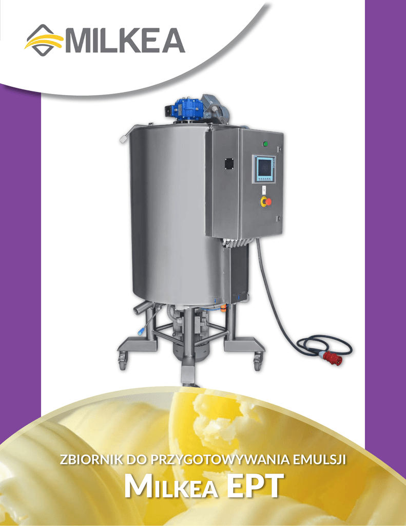 ZBIORNIK DO PRZYGOTOWYWANIA EMULSJI Milkea EPT Zbiornik do przygotowywania emulsji Milkea EPT jest przeznaczony do tworzenia silnie zdyspergowanych emulsji typu woda / tłuszcz w trybie wsadowym. W zależności od potrzeb klienta zbiornik może zostać wyposażony w homogenizator – emulgator zanurzeniowy wbudowanego w dno lub w ścianę boczną zbiornika lub pętlę recyrkulacyjną. W zależności od oczekiwanej wydajności oraz konkretnego procesu technologicznego zbiornik do przygotowywania emulsji może realizować różne czynności. Podczas przeprowadzania niskokosztowej produkcji margaryny w niewielkich ilościach w zbiorniku do przygotowywania emulsji Milkea ET można wykonywać procesy takie, jak topienie tłuszczów stałych lub pasteryzację gotowej emulsji w trybie wsadowym. W przypadku linii produkcyjnych margaryny o wysokiej wydajności cechujących się wysokimi wymaganiami dotyczących organizacji procesu przetwórczego zbiornik do przygotowywania emulsji Milkea ET pozwala na uzyskanie wysokiej jakości emulsji utworzonej poprzez zmieszanie fazy wodnej i tłuszczowej, po czym gotowa emulsja może zostać do jednostki pasteryzującej oraz chłodzącej. W takim przypadku linia produkcyjna jest wyposażona w pracujące na przemian co najmniej dwa zbiorniki do przygotowywania emulsji zapewniające ciągły przebieg procesu przetwórczego. Dodawanie składników do emulsji odbywa się przy użyciu systemu opartego na pomiarze masy oraz wykorzystującego przepływomierze. ZALETY ✔ Możesz wybrać odpowiednią dla Twoich potrzeb konfigurację urządzenia w oparciu o oczekiwaną wydajność oraz Twój proces technologiczny. ✔ Urządzenie tworzy wysokiej jakości, stabilne i jednolite emulsje do produkcji margaryny i innych produktów o wysokiej jakości. ✔ Przetwarzane produkty mają jedynie minimalny kontakt z powietrzem. ✔ Konstrukcja urządzenia spełnia standardy sanitarne, jest ono pozbawione stref martwych i łatwe do czyszczenia. ✔ Urządzenie może zostać uzupełnione o dodatkowe wyposażenie, takie jak systemy czyszczenia metodą CIP lub dozowania składników... Model Сałkowita objętość, l Material Moc homogenizatora, kW Typ homogenizatora Opcje 30 30 50 50 100 100 500 1000 2000 5000 10000 500 1000 2000 5000 10000 AISI304/AISI316L Depends on product 1.1kW-132 kW Dół / zamontowane z boku lub w pętli recyrkulacji Ogrzewanie (płaszcz, bezpośredni wtrysk pary), próżnia, górne mieszadło, zaawansowany system sterowania, itp FIRMA EMA EUROPE PROJEKTUJE I WYTWARZA SZEROKĄ GAMĘ URZĄDZEŃ NA POTRZEBY PRZEMYSŁU NABIAŁOWEGO, PRZETWÓRSTWA MARGARYNY, OLEJU I TŁUSZCZU POD MARKĄ MILKEA. Oferujemy zarówno pojedyncze urządzenia marki Milkea, jak również kompletne linie produkcyjne do wytwarzania takich wyrobów jak: argaryny utwardzanej, margaryny płynnej, margaryny do pieczenia ciasta M francuskiego, różnych smarowideł na bazie tłuszczu oraz monoenowych kwasów tłuszczowych. asła uzyskanego poprzez przetwarzanie lub ubijanie śmietany o wysokiej M zawartości tłuszczu, smarowideł zawierających naturalne masło. Majonezu i innych sosów. Bezwodnego tłuszczu mlecznego. óżnego rodzaju nadzień na bazie tłuszczów, wytwarzanych przy użyciu różnych R technologii, z dodatkiem wody lub bez. Różnych emulsji I innych produktów. Wszystkie urządzenia wytwarzane są w naszym własnym zakładzie produkcyjnym wyposażonym w najnowocześniejsze maszyny przemysłowe, przy użyciu wysokiej jakości podzespołów i materiałów. Specjaliści firmy EMA Europe dysponują wieloletnim praktycznym doświadczeniem w produkcji różnych produktów w przemyśle mleczarskim oraz przetwórstwie margaryny, oleju i tłuszczu, a także udzielają wskazówek na temat opracowania optymalnych rozwiązań projektowych i wyboru urządzeń w celu zapewnienia maksymalnej wydajności planowanej produkcji. Nasza własna produkcja wewnętrzna i wieloletnie doświadczenie w produkcji urządzeń dla przemysłu przetwórstwa mleka i margaryny pozwala nam oferować skuteczne rozwiązania dla firm każdej wielkości, począwszy od niewielkiej skali produkcji o niskiej wartości i niewielkim stopniu automatyzacji, na wysokowydajnych liniach produkcyjnych działających bez przerwy skończywszy. Utrzymywany przez nas zespół techników przeprowadza instalację oraz wstępną konfigurację i dostosowanie każdego z urządzeń do pracy, realizuje również serwis gwarancyjny i pogwarancyjny. e-mail: [email protected] Znajdź najbliższego przedstawiciela handlowego http://milkea.com/ pl/kontakt