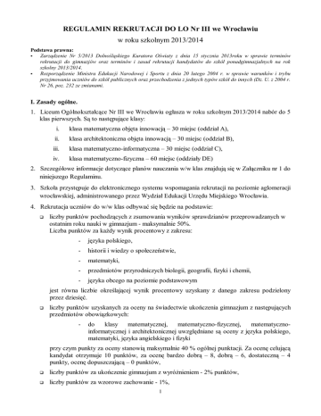 REGULAMIN REKRUTACJI DO LO Nr III we Wrocławiu w roku szkolnym 2013/2014 Podstawa prawna: Zarządzenie Nr 5/2013 Dolnośląskiego Kuratora Oświaty z dnia 15 stycznia 2013roku w sprawie terminów rekrutacji do gimnazjów oraz terminów i zasad rekrutacji kandydatów do szkół ponadgimnazjalnych na rok szkolny 2013/2014. Rozporządzenie Ministra Edukacji Narodowej i Sportu z dnia 20 lutego 2004 r. w sprawie warunków i trybu przyjmowania uczniów do szkół publicznych oraz przechodzenia z jednych typów szkół do innych (Dz. U. z 2004 r. Nr 26, poz. 232 ze zmianami. I. Zasady ogólne. 1. Liceum Ogólnokształcące Nr III we Wrocławiu ogłasza w roku szkolnym 2013/2014 nabór do 5 klas pierwszych. Są to następujące klasy: i. klasa matematyczna objęta innowacją – 30 miejsc (oddział A), ii. klasa architektoniczna objęta innowacją – 30 miejsc (oddział B), iii. klasa matematyczno-informatyczna – 30 miejsc (oddział C), iv. klasa matematyczno-fizyczna – 60 miejsc (oddziały DE) 2. Szczegółowe informacje dotyczące planów nauczania w/w klas znajdują się w Załączniku nr 1 do niniejszego Regulaminu. 3. Szkoła przystępuje do elektronicznego systemu wspomagania rekrutacji na poziomie aglomeracji wrocławskiej, administrowanego przez Wydział Edukacji Urzędu Miejskiego Wrocławia. 4. Rekrutacja uczniów do w/w klas odbywać się będzie na podstawie: liczby punktów pochodzących z zsumowania wyników sprawdzianów przeprowadzanych w ostatnim roku nauki w gimnazjum - maksymalnie 50%. Liczba punktów za każdy wynik procentowy z zakresu: - języka polskiego, - historii i wiedzy o społeczeństwie, - matematyki, - przedmiotów przyrodniczych biologii, geografii, fizyki i chemii, - języka obcego na poziomie podstawowym jest równa liczbie określającej wynik procentowy uzyskany z danego zakresu podzielony przez dziesięć. liczby punktów uzyskanych za oceny na świadectwie ukończenia gimnazjum z następujących przedmiotów obowiązkowych: - do klasy matematycznej, matematyczno-fizycznej, matematycznoinformatycznej i architektonicznej uwzględniane są oceny z języka polskiego, matematyki, języka angielskiego i fizyki przy czym punkty za oceny stanowią maksymalnie 40 % ogólnej punktacji. Za ocenę celującą kandydat otrzymuje 10 punktów, za ocenę bardzo dobrą – 8, dobrą – 6, dostateczną – 4 punkty, ocenę dopuszczającą – 0 punktów, liczby punktów za ukończenie gimnazjum z wyróżnieniem - 2% punktów, liczby punktów za wzorowe zachowanie - 1%, 1 liczby punktów za osiągnięcia w konkursach przedmiotowych, artystycznych i zawodach sportowych na poziomie co najmniej powiatowym, odnotowanych na świadectwie ukończenia gimnazjum i potwierdzonych zaświadczeniem odpowiedniej komisji konkursowej – 7 % punktów (szczegółowe zasady naliczania punktów za konkursy są podane w punktach 5 i 6). 5. Kandydat otrzymuje maksymalnie 5 punktów za wybitne osiągnięcia w konkursach o zasięgu co najmniej wojewódzkim. Szczegółowa lista konkursów i osiągnięć, które brane są pod uwagę podana jest w Załączniku nr 4. Punkty przyznawane są według zasady: 1 konkurs – 2 punkty, 2 konkursy – 4 punkty, 3 i więcej konkursów 5 punktów (max 5). 6. Kandydat otrzymuje maksymalnie 2 punkty za osiągnięcia w konkursach wiedzy, konkursach artystycznych i zawodach sportowych organizowanych przez kuratora oświaty albo organizowanych co najmniej na szczeblu powiatowym przez inne podmioty działające na terenie szkół według zasady: 1 osiągnięcie – 1 punkt, 2 i więcej – 2 punkty (max 2). Punkty przysługują za: a. zajęcie od I do III miejsca w zawodach sportowych, b. zajęcie od I do III miejsca lub uzyskanie tytułu laureata w konkursach lub zawodach artystycznych, c. zajęcie od I do III miejsca lub uzyskanie tytułu laureata w konkursach lub zawodach wiedzy lub innych konkursach tematycznych. 7. W II lub III naborze do szkoły przyjmowani są kandydaci, którzy spełniają wszystkie kryteria rekrutacyjne obowiązujące do danej klasy oraz uzyskali liczbę punktów rekrutacyjnych nie mniejszą niż najniższy wynik punktowy ucznia przyjętego do klasy w I-szym naborze. 8. Szkolna komisja rekrutacyjna może w szczególnie uzasadnionych przypadkach odstąpić w II lub III naborze od wymogu punktowego określonego w punkcie 7. W takim przypadku przyjmowani są kandydaci o najwyższym wyniku punktowym, spełniający pozostałe kryteria rekrutacyjne. 9. Uzupełnienie wolnych miejsc do limitu ustalonego przez organ prowadzący szkołę następuje w ostatnim tygodniu sierpnia. 10. Dodatkowymi kryteriami różnicującymi kandydatów, w przypadku posiadania równej liczby punktów rekrutacyjnych są (dodatkowe kryteria brane są pod uwagę kolejno do momentu zróżnicowania kandydatów): a. łączna liczba punktów za wyniki na egzaminie gimnazjalnym, b. ocena z zachowania, c. liczba punktów za wyniki na egzaminie gimnazjalnym w części zbieżnej z kierunkiem kształcenia w wybranym przez kandydata oddziale, d. średnia ocen z przedmiotów obowiązkowych na świadectwie ukończenia gimnazjum. W przypadkach uczniów zwolnionych przez Dyrektora Okręgowej Komisji Egzaminacyjnej z obowiązku przystąpienia do egzaminu gimnazjalnego z przyczyn losowych lub zdrowotnych, (zgodnie § 49 ust. 4 rozporządzenia MEN z dnia 30 kwietnia 2007 r. w sprawie warunków i sposobu oceniania, klasyfikowania i promowania uczniów…), ustala się następujące zasady wyznaczania liczby punktów odpowiadającej liczbie punktów możliwych do uzyskania za poszczególne zakresy egzaminu gimnazjalnego: 1. z języka polskiego - liczba punktów za ocenę na świadectwie z języka polskiego, 2 2. z historii i wiedzy o społeczeństwie - średnia liczby punktów za oceny na świadectwie z historii i wiedzy o społeczeństwie, 3. z matematyki - liczba punktów za ocenę na świadectwie z matematyki, 4. z przedmiotów przyrodniczych - średnia liczby punktów za oceny na świa