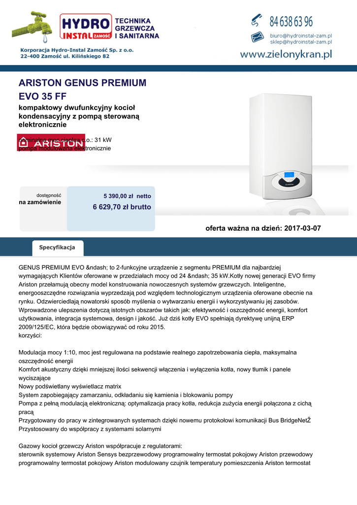 ARISTON GENUS PREMIUM EVO 35 FF kompaktowy dwufunkcyjny kocioł kondensacyjny z pompą sterowaną elektronicznie nominalna moc cieplna c.o.: 31 kW pompa modulowana elektronicznie dostępność na zamówienie 5 390,00 zł netto 6 629,70 zł brutto oferta ważna na dzień: 2017-03-07 GENUS PREMIUM EVO – to 2-funkcyjne urządzenie z segmentu PREMIUM dla najbardziej wymagających Klientów oferowane w przedziałach mocy od 24 – 35 kW.Kotły nowej generacji EVO firmy Ariston przełamują obecny model konstruowania nowoczesnych systemów grzewczych. Inteligentne, energooszczędne rozwiązania wyprzedzają pod względem technologicznym urządzenia oferowane obecnie na rynku. Odzwierciedlają nowatorski sposób myślenia o wytwarzaniu energii i wykorzystywaniu jej zasobów. Wprowadzone ulepszenia dotyczą istotnych obszarów takich jak: efektywność i oszczędność energii, komfort użytkowania, integracja systemowa, design i jakość. Już dziś kotły EVO spełniają dyrektywę unijną ERP 2009/125/EC, która będzie obowiązywać od roku 2015. korzyści: Modulacja mocy 1:10, moc jest regulowana na podstawie realnego zapotrzebowania ciepła, maksymalna oszczędność energii Komfort akustyczny dzięki mniejszej ilości sekwencji włączenia i wyłączenia kotła, nowy tłumik i panele wyciszające Nowy podświetlany wyświetlacz matrix System zapobiegający zamarzaniu, odkładaniu się kamienia i blokowaniu pompy Pompa z pełną modulacją elektroniczną: optymalizacja pracy kotła, redukcja zużycia energii połączona z cichą pracą Przygotowany do pracy w zintegrowanych systemach dzięki nowemu protokołowi komunikacji Bus BridgeNetŽ Przystosowany do współpracy z systemami solarnymi Gazowy kocioł grzewczy Ariston współpracuje z regulatorami: sterownik systemowy Ariston Sensys bezprzewodowy programowalny termostat pokojowy Ariston przewodowy programowalny termostat pokojowy Ariston modulowany czujnik temperatury pomieszczenia Ariston termostat pokojowy Ariston komora spalania: zamknięta nominalna moc cieplna c.o.: 31,0/3,5 kW (max/min) sprawność spalania (60/80oC): 97,2 % sprawność spalania (30/50oC): 107,0 % sprawność spalania przy 30% mony nom.: 108,0 % ilość gwiazdek sprawności (92/42/EEC): 4 kategoria SEBUK: klasa A temp. w obiegu c.o. (wysokotemp.): 82/35 oC (max/min) temp. w obiegu c.o. (niskotemp.): 45/20 oC (max/min) temperatura w obiegu c.w.u.: 60/36 oC (max/min) ilość ciepłej wody ΔT=25oC: 19,4 l/min ilość ciepłej wody ΔT=35oC: 13,8 l/min napięcie: 230V/50Hz całkowity pobór mocy elektrycznej: 74 W klasa ochrony: IPX5D wysokość: 770 mm głębokość: 385 mm szerokość: 400 mm waga: 35,5 kg gwarancja: 60 m-cy Opiekun produktu: Andrzej Iwicki [email protected] 609 700 070