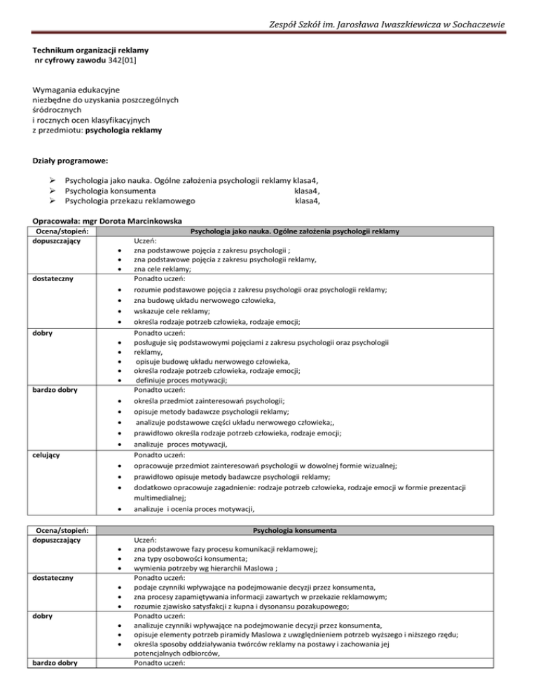 Zespół Szkół im Jarosława Iwaszkiewicza w Sochaczewie Technikum organizacji reklamy nr cyfrowy zawodu 342[01] Wymagania edukacyjne n i rocznych ocen klasyfikacyjnych z przedmiotu: psychologia reklamy D programowe: P O Psychologia konsumenta Psychologia przekazu reklamowego O O D , klasa4, klasa4, Marcinkowska : dostateczny dobry bardzo dobry U P O z zakresu psychologii ; psychologii reklamy, zna cele reklamy; Ponadto z zakresu psychologii oraz psychologii reklamy; zna wskazuje cele reklamy; rodzaje P ocji; z zakresu psychologii oraz psychologii reklamy, opisuje rodzaje definiuje proces motywacji; P opisuje metody badawcze psychologii reklamy; , rodzaje analizuje proces motywacji, P O : dostateczny dobry bardzo dobry ; ; dowolnej formie wizualnej; multimedialnej; analizuje i ocenia proces motywacji, Psychologia konsumenta U zna podstawowe fazy procesu komunikacji reklamowej; wymienia potrzeby wg hierarchii Maslowa ; P rozumie zjawisko satysfakcji z kupna i dysonansu pozakupowego; P analizuje M w reklamy na postawy i zachowania jej P Zespół Szkół im Jarosława Iwaszkiewicza w Sochaczewie przewiduje warunki, u niego dysonans poznawczy; opisuje schemat podejmowania decyzji przez konsumenta oraz proces kupowania; definiuje dysonans poznawczy oraz wskazanie przyczyny satysfakcji konsumenta; P nie satysfakcje z kupna wyrobu a kiedy pojawi analizuje i ocenia schemat podejmowania decyzji przez konsumenta oraz proces kupowania; kulturowej polskiego konsumenta; O dostateczny dobry Psychologia przekazu reklamowego U zna typy zna metody przekonywania konsumenta do produktu; P zna rodzaje argumentacji stosowanych w przekazie reklamowym; ocenia o; P zna proces wzbudzania, ukierunkowywania i utrzymywania uwagi odbiorcy przekazu reklamowego; reklamowym a kiedy racjonalne argumentacje, bardzo dobry P reklamowego; jest niedozwolone; Dostrzega P rynkiem; rynkiem; przekazie reklamowym; wykorzystuje zasady tworzenia copywritingu i sloganu reklamowego; reklamowego; em w tworzeniu pomocy dydaktycznych; Dodatkowe warunki: O U PPP