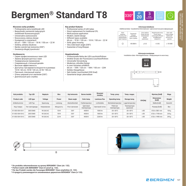 Kluczowe cechy produktu • Profesjonalna seria świetlówek LED • Bezpośredni zamiennik tradycyjnych świetlówek fluorescencyjnych • Uniwersalne zastosowanie • Nowoczesny, stylowy design • Dostępność w wariantach: 60 cm – 10W / 120 cm – 18 W / 150 cm – 22 W • Solidna, szklana obudowa • Bardzo szeroki kąt świecenia (330°) • Gwarancja długiej żywotności Key product features • Professional series of LED tubes • Direct replacement for traditional CFL • Multi-purpose application • Modern, stylish design • Different types available: 60 cm – 10 W / 120 cm – 18 W / 150 cm – 22 W • Solid, glass housing • Very wide beam angle (330°) • Guarantee of long lifespan Oсобенности • Серия профессиональных ламп LED • Замена флуоресцентных ламп • Универсальное применение • Современный, стильный дизайн • Высокая эффективность • Доступны три варианта мощности и размера: 10 W / 60 cm, 18 W/ 120 cm, 22 W/ 150 cm • Прочный, стекланный корпус • Очень широкий угол свечения (330°) • Длительный срок службы Hauptmerkmale • Professionelle Reihe der LED-Leuchtstoffröhren • Direkter Ersatz der Fluoreszenz-Leuchtstoffröhren • Universelle Verwendung • Modernes, stilvolles Design • In zwei Varianten erhältlich 60 cm – 10W / 120 cm – 18W / 150 cm – 22W • Solides Glasgehäuse • Sehr breiter Leuchtwinkel (330 Grad) • Garantierte lange Lebensdauer Kod produktu Typ LED Napięcie Moc Kąt świecenia Barwa światła Strumień świetlny 3 IP 330° 20 YEAR WARRANTY - GLASS Informacje dodatkowe Additional data • Zusätzliche Informationen • Дополнительная информация Kolor obudowy Housing color Gehäusefarbe Цвет корпуса Żywotność Lifespan Lebensdauer Срок службы Czas zapłonu Power up time Zündungszeit Время зажигания Współczynnik mocy Power factor Leistungskoeffizient Коэффициент мощности Ilość cykli Cycle number Zyklenzahl Количество циклов 45 000 h ≤ 0.5 > 0.92 ≥ 10 000 Informacje montażowe Installation data • Montagehinweise • Информация по монтажу G13 Temp. pracy Temp. magaz. Product code LED type Voltage Power Beam angle Color temp. Luminous flux Operating temp. Storage temp. Artikelnummer LED-Typ Spannung Leistung Abstrahlwinkel Farbtemperatur Lichtstärke Betriebstemperatur Lagertemperatur Код товара Тип светодиода Напряжение Мощность Угол свечения Цветовая температура Световой поток Рабочая температура Температура хранения 01-003-004-04-1 2835 SMD 90-265 AC 10 W 330° 4000 K 1000 lm -20~50°C -20~50°C Wymiary [AxB] CRI [Ra] ≥ 80 Waga Dimensions [AxB] Weight Maße [AxB] Gewicht Размер [AxB] Bec Ø 26 x 588 mm 130 g 01-003-004-04-2 2835 SMD 90-265 AC 18 W 330° 4000 K 1800 lm -20~50°C -20~50°C ≥ 80 Ø 26 x 1198 mm 230 g 01-003-004-04-3 2835 SMD 90-265 AC 22 W 330° 4000 K 2200 lm -20~50°C -20~50°C ≥ 80 Ø 26 x 1498 mm 290 g A Źródła światła LED • LED Light sources LED Leuchtmittel • Источники света Bergmen® Standard T8 B * Do produktu rekomendowane są oprawy BERGMEN® Clare (str. 132). * Perfect match with BERGMEN® Clare tri-proof (p. 132). * Für das Produkt werden die Fassungen BERGMEN® Clare empfohlen (S. 132). * К продукту рекомендуются алюминиевые держатели BERGMEN® Clare (п 133). 127