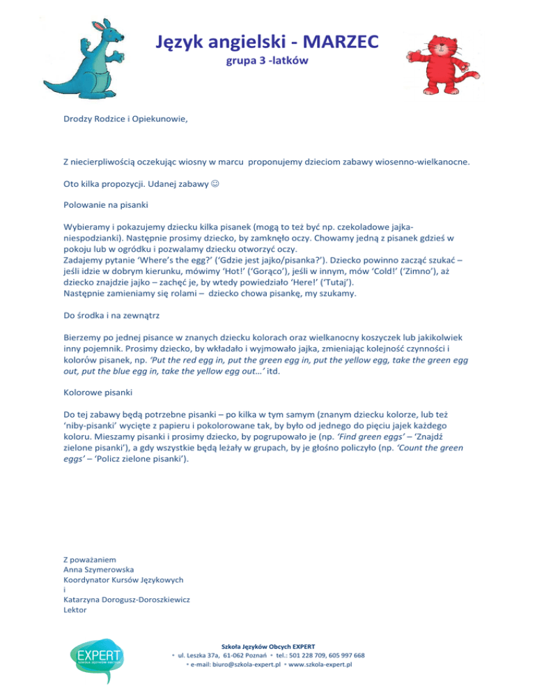Język angielski - MARZEC grupa 3 -latków Drodzy Rodzice i Opiekunowie, Z niecierpliwością oczekując wiosny w marcu proponujemy dzieciom zabawy wiosenno-wielkanocne. Oto kilka propozycji. Udanej zabawy ☺ Polowanie na pisanki Wybieramy i pokazujemy dziecku kilka pisanek (mogą to też być np. czekoladowe jajkaniespodzianki). Następnie prosimy dziecko, by zamknęło oczy. Chowamy jedną z pisanek gdzieś w pokoju lub w ogródku i pozwalamy dziecku otworzyć oczy. Zadajemy pytanie ‘Where’s the egg?’ (‘Gdzie jest jajko/pisanka?’). Dziecko powinno zacząć szukać – jeśli idzie w dobrym kierunku, mówimy ‘Hot!’ (‘Gorąco’), jeśli w innym, mów ‘Cold!’ (‘Zimno’), aż dziecko znajdzie jajko – zachęć je, by wtedy powiedziało ‘Here!’ (‘Tutaj’). Następnie zamieniamy się rolami – dziecko chowa pisankę, my szukamy. Do środka i na zewnątrz Bierzemy po jednej pisance w znanych dziecku kolorach oraz wielkanocny koszyczek lub jakikolwiek inny pojemnik. Prosimy dziecko, by wkładało i wyjmowało jajka, zmieniając kolejność czynności i kolorów pisanek, np. ‘Put the red egg in, put the green egg in, put the yellow egg, take the green egg out, put the blue egg in, take the yellow egg out…’ itd. Kolorowe pisanki Do tej zabawy będą potrzebne pisanki – po kilka w tym samym (znanym dziecku kolorze, lub też ‘niby-pisanki’ wycięte z papieru i pokolorowane tak, by było od jednego do pięciu jajek każdego koloru. Mieszamy pisanki i prosimy dziecko, by pogrupowało je (np. ‘Find green eggs’ – ‘Znajdź zielone pisanki’), a gdy wszystkie będą leżały w grupach, by je głośno policzyło (np. ‘Count the green eggs’ – ‘Policz zielone pisanki’). Z poważaniem Anna Szymerowska Koordynator Kursów Językowych i Katarzyna Dorogusz-Doroszkiewicz Lektor Szkoła Języków Obcych EXPERT ◦ ul. Leszka 37a, 61-062 Poznań ◦ tel.: 501 228 709, 605 997 668 ◦e-mail: [email protected] ◦www.szkola-expert.pl Język angielski - MARZEC grupa 3 -latków Słowa i zwroty, które pojawią się na spotkaniach w przedszkolu w MARCU: Easter - Wielkanoc Easter Bunny Song Easter eggs - pisanki Easter bunny – zajączek wielkanocny chick - kurczaczek lamb - baranek basket – koszyk Easter Bunny is fat, fat, fat. His soft little hands go pat, pat, pat. His soft little ears go flop, flop, flop. And when he runs he goes hop, hop, hop. spring - wiosna chocolate - czekolada cake - ciasto Easter Eggs Song Zwroty i wyrażenia: Happy Easter – Wesołych Świąt Wielkanocnych Spring is here! - Jest wiosna! What colour is...? - Jakiego koloru jest...? What's this? - Co to jest? Do you like...? - Czy lubisz...? ----------------------------------------------------------------------- Ester Eggs, Easter Eggs. Can you see in the tree Ester Eggs. Mmm chocolate, mmm chocolate. Can you see in the tree Mmm chocolate! Yummy cakes, yummy cakes. Can you see in the tree Yummy cakes! Hello Song Hello everyone, tra la la la la! Hello everyone, tra la la la la! Hello everyone, tra la la la la! Hello everyone! Bye bye Song Bye bye everyone, tra la la la la! Bye bye everyone, tra la la la la! Bye bye everyone, tra la la la la! Bye bye everyone! Szkoła Języków Obcych EXPERT ◦ ul. Leszka 37a, 61-062 Poznań ◦ tel.: 501 228 709, 605 997 668 ◦e-mail: [email protected] ◦www.szkola-expert.pl