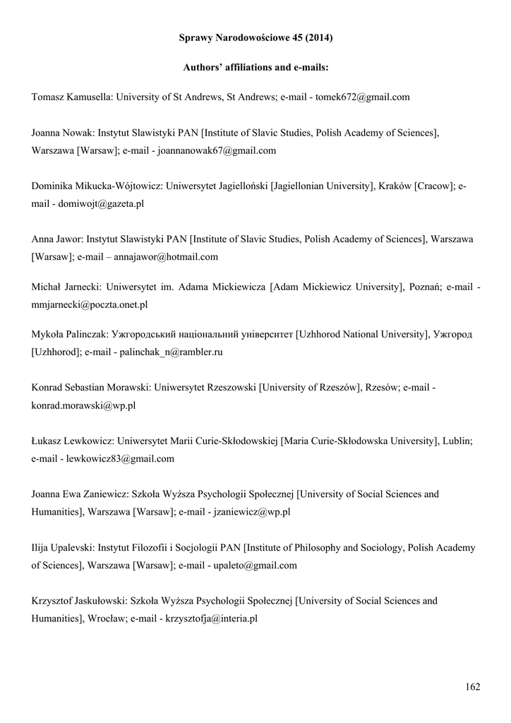 Sprawy Narodowościowe 45 (2014) Authors’ affiliations and e-mails: Tomasz Kamusella: University of St Andrews, St Andrews; e-mail - [email protected] Joanna Nowak: Instytut Slawistyki PAN [Institute of Slavic Studies, Polish Academy of Sciences], Warszawa [Warsaw]; e-mail - [email protected] Dominika Mikucka-Wójtowicz: Uniwersytet Jagielloński [Jagiellonian University], Kraków [Cracow]; email - [email protected] Anna Jawor: Instytut Slawistyki PAN [Institute of Slavic Studies, Polish Academy of Sciences], Warszawa [Warsaw]; e-mail – [email protected] Michał Jarnecki: Uniwersytet im. Adama Mickiewicza [Adam Mickiewicz University], Poznań; e-mail [email protected] Mykoła Palinczak: Ужгородський національний університет [Uzhhorod National University], Ужгород [Uzhhorod]; e-mail - [email protected] Konrad Sebastian Morawski: Uniwersytet Rzeszowski [University of Rzeszów], Rzesów; e-mail [email protected] Łukasz Lewkowicz: Uniwersytet Marii Curie-Skłodowskiej [Maria Curie-Skłodowska University], Lublin; e-mail - [email protected] Joanna Ewa Zaniewicz: Szkoła Wyższa Psychologii Społecznej [University of Social Sciences and Humanities], Warszawa [Warsaw]; e-mail - [email protected] Ilija Upalevski: Instytut Filozofii i Socjologii PAN [Institute of Philosophy and Sociology, Polish Academy of Sciences], Warszawa [Warsaw]; e-mail - [email protected] Krzysztof Jaskułowski: Szkoła Wyższa Psychologii Społecznej [University of Social Sciences and Humanities], Wrocław; e-mail - [email protected] 162
