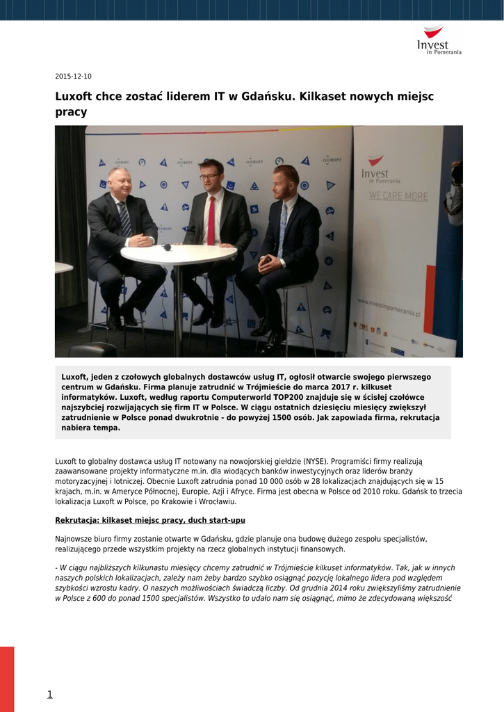 2015-12-10 Luxoft chce zostać liderem IT w Gdańsku. Kilkaset nowych miejsc pracy Luxoft, jeden z czołowych globalnych dostawców usług IT, ogłosił otwarcie swojego pierwszego centrum w Gdańsku. Firma planuje zatrudnić w Trójmieście do marca 2017 r. kilkuset informatyków. Luxoft, według raportu Computerworld TOP200 znajduje się w ścisłej czołówce najszybciej rozwijających się firm IT w Polsce. W ciągu ostatnich dziesięciu miesięcy zwiększył zatrudnienie w Polsce ponad dwukrotnie - do powyżej 1500 osób. Jak zapowiada firma, rekrutacja nabiera tempa. Luxoft to globalny dostawca usług IT notowany na nowojorskiej giełdzie (NYSE). Programiści firmy realizują zaawansowane projekty informatyczne m.in. dla wiodących banków inwestycyjnych oraz liderów branży motoryzacyjnej i lotniczej. Obecnie Luxoft zatrudnia ponad 10 000 osób w 28 lokalizacjach znajdujących się w 15 krajach, m.in. w Ameryce Północnej, Europie, Azji i Afryce. Firma jest obecna w Polsce od 2010 roku. Gdańsk to trzecia lokalizacja Luxoft w Polsce, po Krakowie i Wrocławiu. Rekrutacja: kilkaset miejsc pracy, duch start-upu Najnowsze biuro firmy zostanie otwarte w Gdańsku, gdzie planuje ona budowę dużego zespołu specjalistów, realizującego przede wszystkim projekty na rzecz globalnych instytucji finansowych. - W ciągu najbliższych kilkunastu miesięcy chcemy zatrudnić w Trójmieście kilkuset informatyków. Tak, jak w innych naszych polskich lokalizacjach, zależy nam żeby bardzo szybko osiągnąć pozycję lokalnego lidera pod względem szybkości wzrostu kadry. O naszych możliwościach świadczą liczby. Od grudnia 2014 roku zwiększyliśmy zatrudnienie w Polsce z 600 do ponad 1500 specjalistów. Wszystko to udało nam się osiągnąć, mimo że zdecydowaną większość 1 kadry Luxoft stanowią wysokiej klasy specjaliści – mówi Wojciech Mach, Dyrektor Zarządzający Luxoft Poland. Na zatrudnienie w gdańskim centrum Luxoft mogą liczyć informatycy z co najmniej kilkuletnim stażem zawodowym m.in. programiści Java, Net, C++, a także specjaliści QA i analitycy biznesowi. Do zespołów poszukiwani są także kierownicy projektów i doświadczeni menedżerowie, którzy będą rozwijać szybko rozrastający się oddział w Trójmieście. - Przyciągamy informatyków, bo wiedzą, że z nami będą się rozwijać tak szybko, jak sama firma. Oferujemy nie tylko wysokie płace, ale także duże szanse na awans i pracę przy projektach, które mają wpływ na użytkowników na całym świecie. Dajemy możliwości działania równe najbardziej znanym markom IT, ale nie straciliśmy ducha start-upu. Dobrze się ze sobą bawimy, robiąc ciekawe projekty – przekonuje Wojciech Mach. - Pojawienie się kolejnej dużej firmy informatycznej w Gdańsku, takiej jak Luxoft, to dowód na utrzymujący się trend na pomorskim rynku inwestycji zagranicznych, który kojarzony jest z bardzo dobrą kadrą i perspektywami rozwoju firm IT w regionie. Dzięki temu na trójmiejskim rynku pracy pojawia się wiele nowych i ciekawych ofert dla specjalistów o zupełnie różnych profilach z tej branży - dodaje Andrzej Bojanowski, Zastępca Prezydenta Miasta Gdańska. Wyjątkowe biuro: z widokiem na morze i dla aktywnych Centrum Luxoft zlokalizowane zostało w nowoczesnym biurowcu Alchemia gdzie firma zajmuje obecnie 670 mkw. Wraz z rozwojem oddziału powierzchnia ta ma zostać zwiększona docelowo do 2 200 mkw. Programiści Luxoft pracować będą na ostatnim piętrze biurowca, z widokiem na morze. Nowoczesne biuro wyposażone jest m.in. w pokoje i strefę do relaksu, sale konferencyjne, oraz pomieszczenia do spotkań i pracy zespołowej. W kompleksie biurowym znajduje się także wyjątkowa przestrzeń rekreacyjno-sportowa na którą składa się m.in. pływalnia, kąpiele solankowe, hala sportowa, siłownia i ścianka wspinaczkowa. Planowane jest również otwarcie placówki medycznej i punktu przedszkolnego. Trójmasto – znaczący punkt na biznesowej mapie Polski Wejście Luxoftu do Trójmiasta to mocny dowód na inwestycyjny i technologiczny potencjał regionu Pomorza. Swoje centra w mieście prowadzą już obecnie m.in. Arla Foods, Intel, Lufthansa Systems, Nordea IT, PwC, Sony Pictures, Thomson Reuters. Według raportu ABSL już w kwietniu 2015 r. w centrach biznesowych ulokowanych w Trójmieście zatrudnionych było 13 700 osób, co dało mu pod tym względem czwartą lokatę w Polsce. - Luxoft to znana marka oraz znaczący gracz w sektorze IT dlatego decyzja firmy o wyborze Gdańska na swoją kolejną siedzibę wskazuje, że jako region mamy wiele do zaoferowania. Inwestycja firmy to nie tylko nowe oferty pracy dla naszych mieszkańców, ale również wzbogacenie portfolio projektów IT obsługiwanych w naszym województwie – mówi Wicemarszałek Województwa Pomorskiego Ryszard Świlski Od samego początku inwestycja wspierana była przez inicjatywę Invest in Pomerania, w szczególności przez Agencję Rozwoju Pomorza oraz Gdańską Agencję Rozwoju Gospodarczego (InvestGDA). - Pomorze staje się coraz silniejszym ośrodkiem, który przyciąga firmy z branży technologicznej. W ostatnim czasie swoje biura w Trójmieście otworzyły Epam z Krakowa, PGS Software z Wrocławia czy ukraińska firma Ciklum. Teraz Luxoft, wykorzystując doskonałe warunki biurowe oraz potencjał kadrowy regionu będzie mógł swobodnie rozwijać najnowocześniejsze technologie dla międzynarodowych korporacji - podsumowuje Anton Koval, Project Manager w Invest In Pomerania. 2