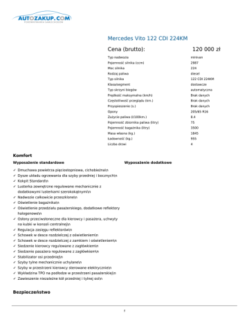 Mercedes Vito 122 CDI 224KM Cena (brutto): 120 000 zł Typ nadwozia minivan Pojemność silnika (ccm) 2987 Moc silnika 224 Rodzaj paliwa diesel Typ silnika 122 CDI 224KM Klasa/segment dostawcze Typ skrzyni biegów automatyczna Prędkość maksymalna (km/h) Brak danych Częstotliwość przeglądu (km.) Brak danych Przyspieszenie (s.) Brak danych Opony 205/65 R16 Zużycie paliwa (l/100km.) 8.4 Pojemność zbiornika paliwa (litry) 75 Pojemność bagażnika (litry) 3500 Masa własna (kg.) 1845 Ładowność (kg.) 955 Liczba drzwi 4 Komfort Wyposażenie standardowe Wyposażenie dodatkowe ✓ Dmuchawa powietrza pięciostopniowa, cichobieżna\n ✓ Dysze układu ogrzewania dla szyby przedniej i bocznych\n ✓ Kokpit Standard\n ✓ Lusterka zewnętrzne regulowane mechanicznie z dodatkowymi lusterkami szerokokątnymi\n ✓ Nadwozie całkowicie przeszklone\n ✓ Oświetlenie bagażnika\n ✓ Oświetlenie przedziału pasażerskiego, dodatkowe reflektory halogenowe\n ✓ Osłony przeciwsłoneczne dla kierowcy i pasażera, uchwyty na kubki w konsoli centralnej\n ✓ Regulacja zasięgu reflektorów\n ✓ Schowek w desce rozdzielczej z oświetleniem\n ✓ Schowek w desce rozdzielczej z zamkiem i oświetleniem\n ✓ Siedzenie kierowcy regulowane z zagłówkiem\n ✓ Siedzenie pasażera regulowane z zagłówkiem\n ✓ Stabilizator osi przedniej\n ✓ Szyby tylne mechanicznie uchylane\n ✓ Szyby w przestrzeni kierowcy sterowane elektrycznie\n ✓ Wykładzina TPO na podłodze w przestrzeni pasażerskiej\n ✓ Zawieszenie niezależne kół przedniej i tylnej osi\n Bezpieczeństwo 1 Wyposażenie standardowe Wyposażenie dodatkowe ✓ Elektroniczny układ stabilizacji toru jazdy ADAPTIVE ESP ✓ Hamulce (R)\n tarczowe przód i tył\n ✓ Światła przeciwmgielne halogenowe\n ✓ Trójkąt ostrzegawczy\n ✓ Trzypunktowe pasy bezpieczeństwa dla wszystkich miejsc\n ✓ Trzypunktowe pasy bezpieczeństwa z regulacją wysokości\n ✓ Zabezpieczenie drzwi przed otwarciem od wewnątrz\n Dodatki Wyposażenie standardowe Wyposażenie dodatkowe ✓ 4 uchwyty do mocowania ładunku\n ✓ Akumulator 12 V/74 Ah\n ✓ Alternator 14 V/150 A (Vito 126)\n ✓ Alternator 14 V/180 A (110/113)\n ✓ Alternator 14 V/180 A (110/113/116/120 CDI)\n ✓ Alternator 14 V/200 A (4x4)\n ✓ Antena w szybie przedniej\n ✓ Apteczka\n ✓ Automatyczna 5-biegowa przekładnia w połączeniu z silnikami 6-cylindrowymi\n ✓ Dopuszczalna masa całkowita pojazdu: 3050 kg\n ✓ Dostępny tylko z silnikami wysokoprężnymi CDI o mocy70 oraz 100 kW w połączeniu z napędem na tylną oś\n ✓ Dostępny z silnikami wysokoprężnymi o mocy 70 kW, 100 kW,120 kW, 165 kW oraz silnikiem benzynowym o mocy 190 kW\n ✓ Drewniana podłoga w przestrzeni pasażerskiej\n ✓ Drzwi przesuwne z prawej strony\n ✓ Dwie standardowe 3-osobowe kanapy z tyłu\n ✓ Ekopompa wspomagania układu kierowniczego\n ✓ Filtr paliwa z separatorem wody\n ✓ Filtr przeciwpyłkowy i układ wewnętrznego obiegu\n ✓ Homologacja osobowa\n ✓ Immobilizer\n ✓ Indywidualne nawiewy w podsufitce\n ✓ Kierownica regulowana w dwu płaszczyznach\n ✓ Klapa tylna nieprzeszklona\n ✓ Klimatyzacja manualna „Tempmatik" (Vito 120 CDI i 126)\n ✓ Komfortowe opony o zmniejszonym oporze toczenia\n ✓ lusterka zewnętrzne regulowane elektrycznie i podgrzewane\n ✓ Lusterko wsteczne wewnętrzne\n ✓ Manualna 6-biegowa przekładnia ECO Gear 360\n ✓ Materiał obiciowy „Lima" czarny\n ✓ 2 Norma emisji spalin EU5 Gr I (silniki benzynowe)\n 3 ✓ Norma emisji spalin EU5 gr. 3 (silniki CDI)\n ✓ Obręcze kół stalowe 6,5 J x 16\n ✓ Obręcze kół stalowe 6,5 J x 16 (Vito 120 CDI)\n ✓ Obręcze kół ze stopów lekkich 7 J x 17 (Vito 126)\n ✓ Ogumienie 205/65 R16\n ✓ Ogumienie 225/55 R17 (Vito 126)\n ✓ Ogumienie 225/60 R16 (Vito 120 CDI)\n ✓ Pakiet BlueEFFICIENCY zwiększający wydajność\n ✓ Pełna tapicerka przestrzeni pasażerskiej\n ✓ Pełnowymiarowe koło zapasowe\n ✓ Podsufitka tapicerowana w przestrzeni pasażerskiej\n ✓ Poduszka powietrzna kierowcy i pasażera\n ✓ Punkty mocowania kanap w drugim i trzecim rzędzie\n ✓ Reflektory halogenowe\n ✓ Siedzenie pasażera nieregulowane z zagłówkiem\n ✓ System „ASSYST"\n ✓ System „Tirefi t" (dla pojazdu Standard)\n ✓ Szyba przednia ze szkła klejonego\n ✓ Szyby przyciemnione: wszystkie szyby w obszarze kabiny\n ✓ Trzecie światło stop\n ✓ Układ hamulcowy hydrauliczny dwuobwodowy\n ✓ Wskaźnik przepalonej żarówki\n ✓ Wykładzina gumowa na podłodze w przestrzeni kierowcy\n ✓ Zaczep holowniczy z przodu/tyłu wkręcany\n ✓ Zamek centralny sterowany falami radiowymi\n ✓ Zbiornik paliwa 75 l\n ✓ Zestaw narzędzi fabrycznych\n Doprecyzowanie oferty Kontakt: Nazwa użytkownika: admin Nazwa firmy: qqq Adres: qqq 12, 41-706 qqq1, NIP: 954 REGON: 1 Telefon: 123, 1 Fax: 1 Email: 1 www: 4