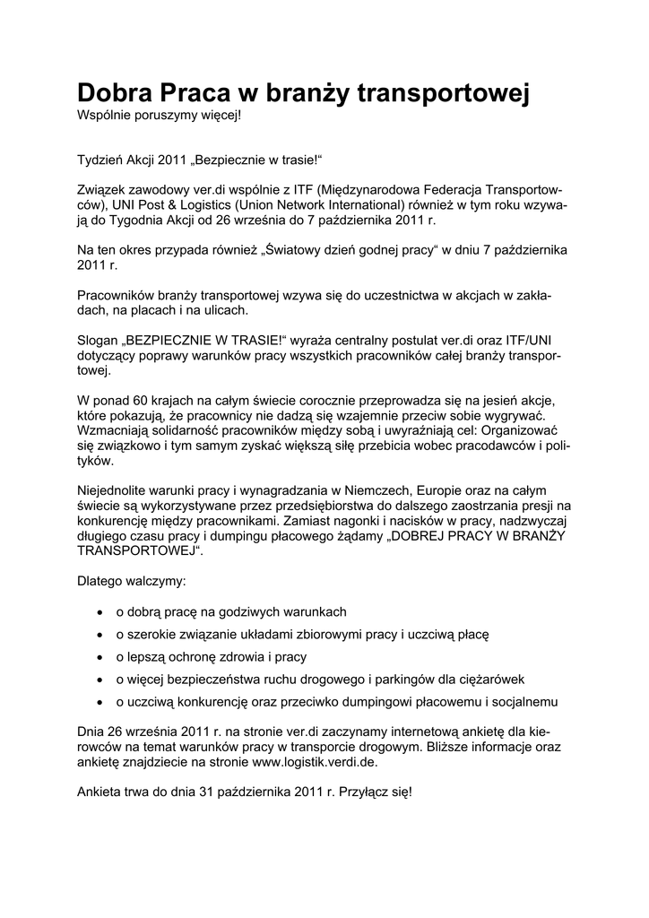 Dobra Praca w branży transportowej Wspólnie poruszymy więcej! Tydzień Akcji 2011 „Bezpiecznie w trasie!“ Związek zawodowy ver.di wspólnie z ITF (Międzynarodowa Federacja Transportowców), UNI Post & Logistics (Union Network International) również w tym roku wzywają do Tygodnia Akcji od 26 września do 7 października 2011 r. Na ten okres przypada również „Światowy dzień godnej pracy“ w dniu 7 października 2011 r. Pracowników branży transportowej wzywa się do uczestnictwa w akcjach w zakładach, na placach i na ulicach. Slogan „BEZPIECZNIE W TRASIE!“ wyraża centralny postulat ver.di oraz ITF/UNI dotyczący poprawy warunków pracy wszystkich pracowników całej branży transportowej. W ponad 60 krajach na całym świecie corocznie przeprowadza się na jesień akcje, które pokazują, że pracownicy nie dadzą się wzajemnie przeciw sobie wygrywać. Wzmacniają solidarność pracowników między sobą i uwyraźniają cel: Organizować się związkowo i tym samym zyskać większą siłę przebicia wobec pracodawców i polityków. Niejednolite warunki pracy i wynagradzania w Niemczech, Europie oraz na całym świecie są wykorzystywane przez przedsiębiorstwa do dalszego zaostrzania presji na konkurencję między pracownikami. Zamiast nagonki i nacisków w pracy, nadzwyczaj długiego czasu pracy i dumpingu płacowego żądamy „DOBREJ PRACY W BRANŻY TRANSPORTOWEJ“. Dlatego walczymy: • o dobrą pracę na godziwych warunkach • o szerokie związanie układami zbiorowymi pracy i uczciwą płacę • o lepszą ochronę zdrowia i pracy • o więcej bezpieczeństwa ruchu drogowego i parkingów dla ciężarówek • o uczciwą konkurencję oraz przeciwko dumpingowi płacowemu i socjalnemu Dnia 26 września 2011 r. na stronie ver.di zaczynamy internetową ankietę dla kierowców na temat warunków pracy w transporcie drogowym. Bliższe informacje oraz ankietę znajdziecie na stronie www.logistik.verdi.de. Ankieta trwa do dnia 31 października 2011 r. Przyłącz się! DOBRA PRACA W BRANŻY TRANSPORTOWEJ! – Wspólnie poruszymy więcej! Pracownicy w transporcie drogowym wykonują swą pracę z dużą odpowiedzialnością i często w trudnych warunkach Regulacje czasu pracy muszą obowiązywać wszystkich kierowców zawodowych Niestety w branży transportowej rzeczywistość wygląda jeszcze inaczej: Parlament Europejski w czerwcu 2010 r. uchwalił unijną dyrektywę w sprawie czasu pracy dla wszystkich kierowców zawodowych. Tym samym dyrektywa w sprawie czasu pracy od 23.09.2009 obowiązuje też samozatrudnionych kierowców. • Cele dyrektywy to: Jakość pracy istotnie kształtuje jakość życia. Dobra jest ta praca, która odpowiada aspiracjom pracowników. Dobre warunki pracy możliwe są wszędzie. • • • Wysokie obciążenie pracą wskutek niekorzystnego i zbyt długiego czasu pracy Częste jazdy nocą i praca w weekendy Stale rosnąca presja terminów wskutek następujących blisko po sobie dyspozycji wyjazdów Niepotrzebne czasy oczekiwania na rampach załadunkowych przy załadunku wzgl. rozładunku • Rosnące wymogi wskutek zastosowania techniki w ciężarówkach • Technika wykorzystywana jest do stałego monitorowania i kontroli kierowcy • Duże natężenie ruchu, przeciążona sieć dróg i zbyt mało parkingów dla ciężarówek Zleceniodawcy i dysponenci często wywierają na kierowców nacisk, by nie przestrzegali ustawowych przepisów ochronnych – np. czasów prowadzenia pojazdu i okresów odpoczynku. • Ochrona zdrowia i bezpieczeństwa kierowców • Koniec z „niekończącym się” czasem pracy poza czasami prowadzenia pojazdu i okresami odpoczynku • • Uczciwe warunki konkurencji w Europie Zwiększenie bezpieczeństwa w ruchu drogowym ver.di żąda dostosowanego do człowieka stanowiska pracy, dobrych warunków pracy i ochrony przed przemęczeniem Pozytywny wkład może na przykład wnieść: • • • Chcemy w transporcie drogowym trwale poprawić warunki pracy i wynagrodzenia ver.di angażuje się na rzecz „Dobrej Pracy“ w branży transportowej: • Zastosowanie systemów asystujących kierowcy i systemów telematycznych dla podniesienia bezpieczeństwa ruchu Sprawiedliwych warunków pracy i wynagrodzenia • Na stałe zabezpieczonych stosunków zatrudnienia Nowe pojazdy mechaniczne w transporcie towarowym muszą silniej uwzględniać potrzeby kierowców • Uczciwych regulacji czasu pracy • Kwalifikowanego kształcenia i doskonalenia zawodowego • Zakładowego bezpieczeństwa i higieny pracy • Silnych rad pracowników, forsujących przestrzeganie warunków ochrony pracy Inteligentne wykorzystanie możliwości technicznych w celu zapobiegania zagrożeniom • Technika pojazdu powinna sensownie wspierać kierowcę a nie dodatkowo go obciążać • NIE dla długich ciężarówek w Niemczech i NIE dla gigalinerów w Europie ver.di oraz ETF – Europejska Federacja Transportowców wspólnie walczyły o to, by wewnątrz Unii Europejskiej obowiązywały takie same warunki czasu pracy dla wszystkich kierowców zawodowych. Dostateczne przerwy i okresy odpoczynku oraz ograniczenie dziennego i tygodniowego czasu pracy dla wszystkich kierowców zawodowych chroni przed „sekundowym snem“ i zwiększa bezpieczeństwo w ruchu drogowym. ver.di postuluje, by niemiecki rząd federalny wreszcie przejął do prawa krajowego zapis dot. samozatrudnionych kierowców zgodnie z unijną dyrektywą w sprawie czasu pracy. Żądamy: Więcej bezpieczniejszych parkingów i MOP’ów, aby narzucone przerwy i okresy odpoczynku można było wykorzystać jako prawdziwy czas odpoczynku. Działamy: Przeciwko pracy na czarno, nielegalnemu zatrudnieniu i dumpingowi socjalnemu. Na rzecz uczciwej konkurencji w branży transportowej.