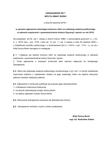 ZARZĄDZENIE NR 7 WÓJTA GMINY BORKI z dnia 25 stycznia 2016 r. w sprawie ogłoszenia otwartego konkursu ofert na realizację zadania publicznego w zakresie wspierania i upowszechniania kultury fizycznej i sportu na rok 2016 Na podstawie art.30 ust.1 ustawy z dnia 8 marca 1990r. o samorządzie gminnym ( t. j. Dz. U. z 2015 roku, poz. 1515 ) oraz art. 13 ust. 1 i ust. 3 ustawy z dnia 24 kwietnia 2003 r. o działalności pożytku publicznego i o wolontariacie (Dz.U. z 2014 r. poz. 1118 – t.j. ze zm.) Wójt Gminy Borki zarządza co następuje : § 1. 1.Ogłasza się otwarty konkurs ofert na realizację zadania publicznego w zakresie wspierania i upowszechniania kultury fizycznej i sportu. 2. Treść ogłoszenia o otwartym konkursie ofert stanowi załącznik do niniejszego Zarządzenia. § 2. Zleca się realizację zadania publicznego wymienionego w §1 ust.1 w formie wspierania wykonania zadania z udzieleniem dotacji na jego realizację, która nie będzie pokrywać pełnych kosztów realizacji zadania. § 3. Ogłoszenie o konkursie publikuje się poprzez jego zamieszczenie: 1. w Biuletynie Informacji Publicznej, 2. na stronie internetowej Urzędu Gminy Borki, 3. na tablicy ogłoszeń Urzędu Gminy Borki. § 4. Wykonanie Zarządzenia powierza się Sekretarzowi Gminy. § 5. Zarządzenie wchodzi z życie z dniem podpisania. Wójt Gminy Borki mgr inż. Radosław Sałata WÓJT GMINY BORKI ogłasza otwarty konkurs ofert na realizację zadań publicznych Gminy Borki w 2016 roku Działając na podstawie art. 13 ust. 1-5 ustawy z dnia 24 kwietnia 2003 roku o działalności pożytku publicznego i o wolontariacie (Dz.U. z 2014 r. poz. 1118 j.t. ze zm.) oraz Uchwały Rady Gminy Borki Nr XI/66/2015 z dnia 20 listopada 2015 r. w sprawie uchwalenia rocznego programu współpracy Gminy Borki z organizacjami pozarządowymi w roku 2016, ogłasza otwarty konkurs ofert na realizację zadań publicznych Gminy Borki w zakresie wspierania i upowszechniania kultury fizycznej i sportu w 2016 r. i jednocześnie zaprasza do składania ofert. Konkurs ma na celu wybór ofert i zlecenie w formie wspierania realizacji zadań publicznych w zakresie wspierania i upowszechniania kultury fizycznej, podejmowanych na rzecz zaspokajania potrzeb społecznych i podnoszenia poziomu życia mieszkańców regionu. I. Rodzaj zadania objętego konkursem : Rodzajem zadania realizowanego w ramach konkursu jest wspieranie i upowszechnianie kultury fizycznej i sportu, w szczególności szkolenie dzieci i młodzieży, uczestnictwo we współzawodnictwie sportowym oraz organizowanie imprez sportowo-rekreacyjnych. II. Wysokość środków przeznaczonych na realizację programu wynosi 35 000 zł. III. Zasady przyznawania dotacji: 1) Do konkursu mogą przystąpić podmioty określone w art. 3 ust. 2 i ust. 3 ustawy z dnia 24 kwietnia 2003 r. o działalności pożytku publicznego i o wolontariacie. 2) Oferty konkursowe powinny zawierać w szczególności: a) szczegółowy zakres rzeczowy zadania publicznego proponowanego do realizacji, b) termin i miejsce realizacji zadania publicznego, c) kalkulację przewidywanych kosztów realizacji zadania publicznego, d) informację o wcześniejszej działalności podmiotu składającego ofertę w zakresie, której dotyczy zadanie, e) informację o posiadanych zasobach rzeczowych i kadrowych zapewniających wykonanie zadania, w tym wysokość środków własnych, oraz wysokość środków finansowych uzyskanych na realizację danego zadania z innych źródeł, f) deklarację o zamiarze odpłatnego lub nieodpłatnego wykonania zadania. 3) Prawidłowo złożone oferty staną się przedmiotem oceny Komisji powołanej przez Wójta Gminy w zakresie opiniowania wniosków o przyznanie środków, co będzie podstawą wyboru przez Wójta Gminy ofert, na które przyznana zostanie dotacja. 4) Szczegółowe warunki realizacji zadania zostaną określone w umowie na wykonanie zadania publicznego. 5) Z dotacji Gminy Borki mogą być pokryte następujące rodzaje kosztów: 1. Przejazd 2. Transport sprzętu niezbędnego do udziału w zawodach 3. Wyżywienie (zakup artykułów spożywczych) 4. Woda 5. Wpisowe + startowe 6. 7. Obsługa techniczna (np. sekretariat zawodów, spiker, obsługa i ochrona zawodów, przygotowanie trasy) Opieka medyczna 8. Dyplomy, puchary, medale, statuetki, trofea 9. Delegacje sędziowskie (ekwiwalent sędziowski + zwrot kosztów przejazdu) 10. Wynajem obiektu 11. Najem i transport sprzętu niezbędnego do przeprowadzenia zawodów 12. Zakup sprzętu niezbędnego do przeprowadzenia zawodów 6) Z dotacji Gminy Borki przyznanej w ramach otwartego konkursu ofert nie mogą być pokrywane wydatki: a) poniesione przed terminem zawarcia umowy, b) niezwiązane bezpośrednio z realizacją danego zadania, c) z tytułu podatku od towarów i usług, jeżeli podmiot ma prawo do jego odliczenia, d) z tytułu opłat i kar umownych, e) poniesione na przygotowanie oferty, f) związane z nabyciem lub dzierżawą gruntów, g) poniesione po terminie realizacji zadania 7) Kosztorys w ofercie musi być czytelny i logiczny. W kosztorysie należy szczegółowo wykazać koszty rodzajowe z kosztami jednostkowymi planowanego zadania. Wydatki przedstawione w kosztorysie muszą znajdować pełne uzasadnienie w opisie zadania. 8) Podpisy pod ofertą, dołączonymi załącznikami składają osoby upoważnione do składania oświadczeń woli, zgodnie z danymi z Krajowego Rejestru Sądowego. Wszystkie złożone własnoręczne podpisy oraz pieczątki muszą być czytelne. W razie zaistnienia zmian upoważnień w trakcie procedury wyłaniania ofert do realizacji należy niezwłocznie, w formie pisemnej, poinformować o tym fakcie Sekretarza Gminy lub Referat Społeczno-Obywatelski Urzędu Gminy Borki. 9) Organizator konkursu zastrzega sobie prawo do wskazania przeznaczenia dotacji na pokrycie kosztów innych niż proponowane przez wnioskodawcę w kosztorysie, a także prawo do przyznania mniejszej kwoty dotacji niż wnioskowana. 