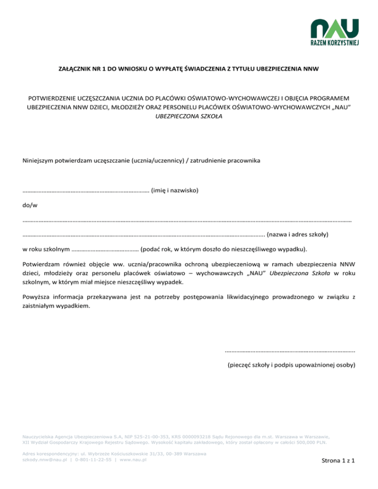 ZAŁĄCZNIK NR 1 DO WNIOSKU O WYPŁATĘ ŚWIADCZENIA Z TYTUŁU UBEZPIECZENIA NNW POTWIERDZENIE UCZĘSZCZANIA UCZNIA DO PLACÓWKI OŚWIATOWO-WYCHOWAWCZEJ I OBJĘCIA PROGRAMEM UBEZPIECZENIA NNW DZIECI, MŁODZIEŻY ORAZ PERSONELU PLACÓWEK OŚWIATOWO-WYCHOWAWCZYCH „NAU” UBEZPIECZONA SZKOŁA Niniejszym potwierdzam uczęszczanie (ucznia/uczennicy) / zatrudnienie pracownika ……………………………………………………………………. (imię i nazwisko) do/w .…………………………………………………………………………………………………………………………………………………………………………………… ……………………………………………………………………………………………………………………………………. (nazwa i adres szkoły) w roku szkolnym …………………………………… (podać rok, w którym doszło do nieszczęśliwego wypadku). Potwierdzam również objęcie ww. ucznia/pracownika ochroną ubezpieczeniową w ramach ubezpieczenia NNW dzieci, młodzieży oraz personelu placówek oświatowo – wychowawczych „NAU” Ubezpieczona Szkoła w roku szkolnym, w którym miał miejsce nieszczęśliwy wypadek. Powyższa informacja przekazywana jest na potrzeby postępowania likwidacyjnego prowadzonego w związku z zaistniałym wypadkiem. .…………………………………………………………………….. (pieczęć szkoły i podpis upoważnionej osoby) Nauczycielska Agencja Ubezpieczeniowa S.A, NIP 525-21-00-353, KRS 0000093218 Sądu Rejonowego dla m.st. Warszawa w Warszawie, XII Wydział Gospodarczy Krajowego Rejestru Sądowego. Wysokość kapitału zakładowego, który został opłacony w całości 500,000 PLN. Adres korespondencyjny: ul. Wybrzeże Kościuszkowskie 31/33, 00-389 Warszawa [email protected] | 0-801-11-22-55 | www.nau.pl Strona 1 z 1