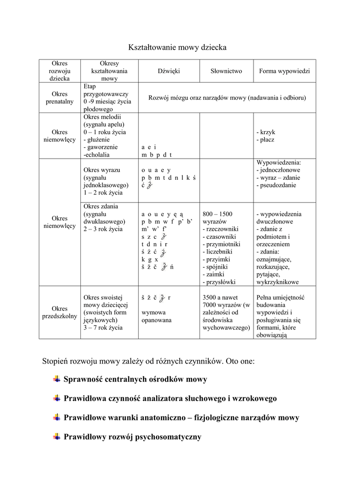 Kształtowanie mowy dziecka Okres rozwoju dziecka Okres prenatalny Okres niemowlęcy Okresy kształtowania mowy Etap przygotowawczy 0 -9 miesiąc życia płodowego Okres melodii (sygnału apelu) 0 – 1 roku życia - głużenie - gaworzenie -echolalia Okres wyrazu (sygnału jednoklasowego) 1 – 2 rok życia Okres niemowlęcy Okres zdania (sygnału dwuklasowego) 2 – 3 rok życia Okres swoistej mowy dziecięcej Okres (swoistych form przedszkolny językowych) 3 – 7 rok życia Dźwięki Słownictwo Forma wypowiedzi Rozwój mózgu oraz narządów mowy (nadawania i odbioru) - krzyk - płacz a e i m b p d t Wypowiedzenia: - jednoczłonowe - wyraz – zdanie - pseudozdanie o u a e y p b m t d n l k ś ć a o u e y ę ą p b m w f p’ b’ m’ w’ f’ s z c t d n i r ś ź ć k g x š ž č ń 800 – 1500 wyrazów - rzeczowniki - czasowniki - przymiotniki - liczebniki - przyimki - spójniki - zaimki - przysłówki - wypowiedzenia dwuczłonowe - zdanie z podmiotem i orzeczeniem - zdania: oznajmujące, rozkazujące, pytające, wykrzyknikowe š ž č 3500 a nawet 7000 wyrazów (w zależności od środowiska wychowawczego) Pełna umiejętność budowania wypowiedzi i posługiwania się formami, które obowiązują r wymowa opanowana Stopień rozwoju mowy zależy od różnych czynników. Oto one: Sprawność centralnych ośrodków mowy Prawidłowa czynność analizatora słuchowego i wzrokowego Prawidłowe warunki anatomiczno – fizjologiczne narządów mowy Prawidłowy rozwój psychosomatyczny Motywacja do mowy Prawidłowy rozwój emocjonalny Kontakty społeczne – mowa jest zależna od jakości kontaktów społecznych; nie rozwija się, jeżeli dziecko jest ich pozbawione PAMIĘTAJ!1 1. Rozwój każdej funkcji, a więc i mowy, trwa od poczęcia. 2. Każde dziecko w tej samej kolejności przechodzi przez wszystkie etapy rozwoju, jednak w indywidualnym tempie. 3. Pierwsze (szczególnie trzy pierwsze) lata życia dziecka mają szczególne znaczenie dla rozwoju mowy. 4. Najkorzystniejszy z punktu widzenia przyszłości dziecka jest rozwój wszechstronny i harmonijny. 5. Sprawność wypowiadania się zależy od pierwszych kontaktów z najbliższym otoczeniem; od rodzaju, ilości i jakości bodźców słownych, od prawidłowego związku emocjonalnego ze wszystkimi członkami rodziny. 6. Wszelkie niepokojące rodziców zachowania dziecka powinny być konsultowane logopedów, przez psychologów, specjalistów pedagogów), (ortodontów, w celu ich wyjaśnienia. 7. Ważna jest wczesna wykrywalność zaburzeń mowy, kompleksowe ustalenie przyczyn oraz podjęcie terapii. 1 (za: K. Datkun – Czerniak „Jak usprawniać mowę dziecka”, Kielce 2004, str.16) Jak stymulować prawidłowy rozwój mowy małego dziecka?2 • O Zanim zacznie mówić ile to możliwe, należy karmić dziecko piersią, a później łyżeczką • Wcześnie przyuczać do picia z kubeczka • Jak najwcześniej odstawić smoczek i butelkę • Nie dopuszczać do ssania kciuka • Gdy wyrzną się ząbki, podawać twarde pokarmy do gryzienia i przeżuwania np. marchewkę, jabłko • Utrzymywać drożny nos – uczyć dziecko oddychania przez nos • Dbać o dobry kontakt emocjonalny z dzieckiem – często je przytulać, głaskać. śpiewać, czytać, naśladować jego wokalizację • Mówić do dziecka prostym językiem, nie zdrabniać, patrzeć w oczy dziecka używając gestów i mimiki (opr. na podstawie plakatu „Aby twoje dziecko mówiło pięknie” Fundacji Szansa) 2 A także: UCZYĆ SŁUCHANIA Słuch rozwijaj od pierwszych chwil po urodzeniu, mówiąc do dziecka, naśladując jego odgłosy. Zacznij od najprostszych zabaw poszukiwania dźwięku (pozytywka, tykający zegar). Kołysz się z maleństwem trzymanym w ramionach w rytm śpiewanej melodii. Pytaj „Kto to?”, „Co to?”. W ten sposób uczysz koncentracji na dźwiękach. Dobry słuch, to dobry start do poprawnego mówienia. GIMNASTYKOWAĆ BUZIĘ DZIECKA Opowiadaj historyjki ilustrując je ruchami języka i warg. Zachęcaj dziecko do naśladowania. Sprawna buzia, to w przyszłości poprawna wymowa. DMUCHAĆ I CHUCHAĆ Bawcie się w dmuchanie wiatraczka, robienie baniek mydlanych, nadmuchiwanie balonów, dmuchanie przez rurkę. Pamiętaj zawsze o wietrzeniu pomieszczeń do takich zabaw. BAWIĆ SIĘ Z DZIECKIEM, ŚPIEWAĆ, TAŃCZYĆ Baw się „Idzie kominiarz...”, „Warzyła sroczka..”, „Burza na morzu...”, „Jedzie, jedzie pan...”, „Ele mele dutki...”. Wyliczanki wypowiadane wielokrotnie, to doskonały trening pamięci słuchowej, wyrabiają poczucie rytmu. UCZYĆ PROSTYCH WIERSZYKÓW I PIOSENEK Recytuj wierszyki z dużą liczbą wyrazów dźwiękonaśladowczych. Wspólna recytacja cieszy dziecko i pozwala nawiązać rozmowę, oswaja z rytmem WYMYŚLAĆ PROSTE ZAGADKI Opisuj przedmioty i proś dziecko, aby odgadło, o czym mówisz. Czytaj popularne zagadki. CZYTAĆ DZIECKU Czytaj dziecku codziennie. Pamiętaj, aby treść książki była dostosowana do wieku dziecka. RUSZAĆ SIĘ Z DZIECKIEM Zadbaj o aktywność ruchową. Sprawność fizyczna jest bardzo ważna dla harmonijnego rozwoju. Zachęcaj do raczkowania, skakania na jednej nodze, chodzenia po murku. Ucz jazdy na hulajnodze, rowerku, wrotkach. Bawcie się na śniegu, w piasku, w wodzie. Manipulujcie przedmiotami, lepcie, wydzierajcie, malujcie, rysujcie.
