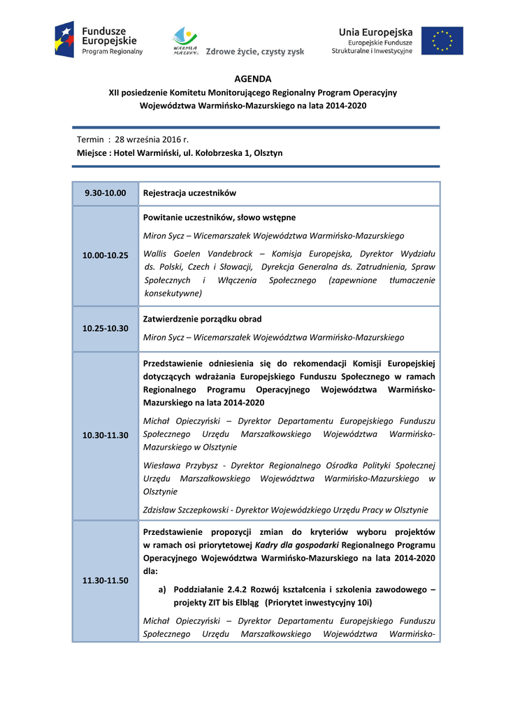 AGENDA XII posiedzenie Komitetu Monitorującego Regionalny Program Operacyjny Województwa Warmińsko-Mazurskiego na lata 2014-2020 Termin : 28 września 2016 r. Miejsce : Hotel Warmiński, ul. Kołobrzeska 1, Olsztyn 9.30-10.00 Rejestracja uczestników Powitanie uczestników, słowo wstępne Miron Sycz – Wicemarszałek Województwa Warmińsko-Mazurskiego 10.00-10.25 Wallis Goelen Vandebrock – Komisja Europejska, Dyrektor Wydziału ds. Polski, Czech i Słowacji, Dyrekcja Generalna ds. Zatrudnienia, Spraw Społecznych i Włączenia Społecznego (zapewnione tłumaczenie konsekutywne) Zatwierdzenie porządku obrad 10.25-10.30 Miron Sycz – Wicemarszałek Województwa Warmińsko-Mazurskiego Przedstawienie odniesienia się do rekomendacji Komisji Europejskiej dotyczących wdrażania Europejskiego Funduszu Społecznego w ramach Regionalnego Programu Operacyjnego Województwa WarmińskoMazurskiego na lata 2014-2020 10.30-11.30 Michał Opieczyński – Dyrektor Departamentu Europejskiego Funduszu Społecznego Urzędu Marszałkowskiego Województwa WarmińskoMazurskiego w Olsztynie Wiesława Przybysz - Dyrektor Regionalnego Ośrodka Polityki Społecznej Urzędu Marszałkowskiego Województwa Warmińsko-Mazurskiego w Olsztynie Zdzisław Szczepkowski - Dyrektor Wojewódzkiego Urzędu Pracy w Olsztynie Przedstawienie propozycji zmian do kryteriów wyboru projektów w ramach osi priorytetowej Kadry dla gospodarki Regionalnego Programu Operacyjnego Województwa Warmińsko-Mazurskiego na lata 2014-2020 dla: 11.30-11.50 a) Poddziałanie 2.4.2 Rozwój kształcenia i szkolenia zawodowego – projekty ZIT bis Elbląg (Priorytet inwestycyjny 10i) Michał Opieczyński – Dyrektor Departamentu Europejskiego Funduszu Społecznego Urzędu Marszałkowskiego Województwa Warmińsko- Mazurskiego w Olsztynie Dyskusja i głosowanie nad uchwałą w sprawie przyjęcia zmiany do kryteriów wyboru projektów dla Poddziałania 2.4.2 Przedstawienie propozycji zmian do kryteriów wyboru projektów dla działań/poddziałań osi priorytetowej Kadry dla gospodarki Regionalnego Programu Operacyjnego Województwa Warmińsko-Mazurskiego na lata 2014-2020. 11.50-12.00 Michał Opieczyński – Dyrektor Departamentu Europejskiego Funduszu Społecznego Urzędu Marszałkowskiego Województwa WarmińskoMazurskiego w Olsztynie Dyskusja i głosowanie nad uchwałą w sprawie przyjęcia zmian do kryteriów wyboru projektów dla działań/poddziałań osi priorytetowej Kadry dla gospodarki RPO WiM 2014-2020 Przedstawienie propozycji kryteriów wyboru projektów w ramach osi priorytetowej Regionalny rynek pracy Regionalnego Programu Operacyjnego Województwa Warmińsko-Mazurskiego na lata 2014-2020 dla: 12.00-12.20 a) Działanie 10.7 Aktywne i zdrowe starzenie się (dla typu projektu: Realizacja programów profilaktycznych opracowanych na szczeblu krajowym pod nadzorem Ministerstwa Zdrowia w zakresie raka szyjki macicy, w tym działania zwiększające zgłaszalność na badania profilaktyczne) (Priorytet inwestycyjny 8vi) Wiesława Przybysz - Dyrektor Regionalnego Ośrodka Polityki Społecznej Urzędu Marszałkowskiego Województwa Warmińsko-Mazurskiego w Olsztynie Dyskusja i głosowanie nad uchwałą w sprawie przyjęcia kryteriów wyboru projektów dla Działania 10.7 12.20-12.50 Przerwa kawowa Przedstawienie propozycji kryteriów wyboru projektów w ramach osi priorytetowej Inteligentna gospodarka Warmii i Mazur Regionalnego Programu Operacyjnego Województwa Warmińsko-Mazurskiego na lata 2014-2020 dla: 12.50-13.10 a) Działania 1.1 Nowoczesna infrastruktura badawcza publicznych jednostek naukowych (Priorytet inwestycyjny 1a) Gabriela Zenkner - Kłujszo – Kierownik Biura Przedsiębiorczości w Departamencie Polityki Regionalnej Urzędu Marszałkowskiego Województwa Warmińsko-Mazurskiego w Olsztynie Dyskusja i głosowanie nad uchwałą w sprawie przyjęcia kryteriów wyboru projektów dla Działania 1.1 Przedstawienie propozycji zmian do kryteriów wyboru projektów w ramach osi priorytetowej Inteligentna gospodarka Warmii i Mazur Regionalnego Programu Operacyjnego Województwa WarmińskoMazurskiego na lata 2014-2020 dla: 13.10-13.20 a) Poddziałania 1.3.2 Firmy w początkowej fazie rozwoju (Schemat B) (Priorytet inwestycyjny 3a) Gabriela Zenkner - Kłujszo – Kierownik Biura Przedsiębiorczości w Departamencie Polityki Polityki Regionalnej Urzędu Marszałkowskiego Województwa Warmińsko-Mazurskiego w Olsztynie Dyskusja i głosowanie nad uchwałą w sprawie przyjęcia zmiany do kryteriów wyboru projektów dla Poddziałania 1.3.2 – (Schemat B) Przedstawienie propozycji kryteriów wyboru projektów w ramach osi priorytetowej Cyfrowy region Regionalnego Programu Operacyjnego Województwa Warmińsko-Mazurskiego na lata 2014-2020 dla: 13.20-13.40 a) Działania 3.2 E-zdrowie (Priorytet inwestycyjny 2c) Paweł Kaszubski – Kierownik Biura Programowania w Departamencie Polityki Regionalnej Urzędu Marszałkowskiego Województwa WarmińskoMazurskiego w Olsztynie Dyskusja i głosowanie nad uchwałą w sprawie przyjęcia kryteriów wyboru projektów dla Działania 3.2 Przedstawienie propozycji zmian do kryteriów wyboru projektów w ramach osi priorytetowej Efektywność energetyczna Regionalnego Programu Operacyjnego Województwa Warmińsko-Mazurskiego na lata 2014-2020 dla: a) 13.40-13.50 Poddziałania 4.3.1 Efektywność energetyczna w budynkach publicznych, (Priorytet inwestycyjny 4c) a) Poddziałania 4.3.2 Efektywność energetyczna w budynkach mieszkalnych, (Priorytet inwestycyjny 4c) Sebastian Rzodkiewicz – Podinspektor w Biurze Programowania w Departamencie Polityki Regionalnej Urzędu Marszałkowskiego Województwa Warmińsko-Mazurskiego w Olsztynie Dyskusja i głosowanie nad uchwałą w sprawie przyjęcia zmiany do kryteriów wyboru projektów dla Poddziałania 4.3.1 Dyskusja i głosowanie nad uchwałą w sprawie przyjęcia zmiany do kryteriów wyboru projektów dla Poddziałania 4.3.2 Przedstawienie propozycji zmian