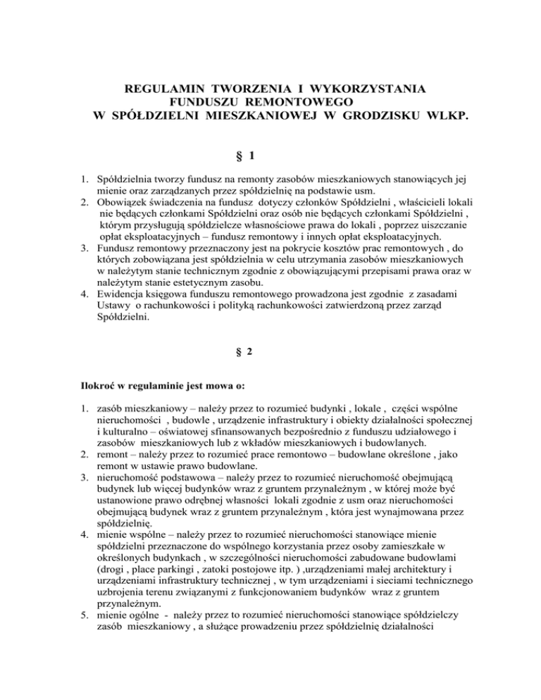 REGULAMIN TWORZENIA I WYKORZYSTANIA FUNDUSZU REMONTOWEGO W SPÓŁDZIELNI MIESZKANIOWEJ W GRODZISKU WLKP. § 1 1. Spółdzielnia tworzy fundusz na remonty zasobów mieszkaniowych stanowiących jej mienie oraz zarządzanych przez spółdzielnię na podstawie usm. 2. Obowiązek świadczenia na fundusz dotyczy członków Spółdzielni , właścicieli lokali nie będących członkami Spółdzielni oraz osób nie będących członkami Spółdzielni , którym przysługują spółdzielcze własnościowe prawa do lokali , poprzez uiszczanie opłat eksploatacyjnych – fundusz remontowy i innych opłat eksploatacyjnych. 3. Fundusz remontowy przeznaczony jest na pokrycie kosztów prac remontowych , do których zobowiązana jest spółdzielnia w celu utrzymania zasobów mieszkaniowych w naleŜytym stanie technicznym zgodnie z obowiązującymi przepisami prawa oraz w naleŜytym stanie estetycznym zasobu. 4. Ewidencja księgowa funduszu remontowego prowadzona jest zgodnie z zasadami Ustawy o rachunkowości i polityką rachunkowości zatwierdzoną przez zarząd Spółdzielni. § 2 Ilokroć w regulaminie jest mowa o: 1. zasób mieszkaniowy – naleŜy przez to rozumieć budynki , lokale , części wspólne nieruchomości , budowle , urządzenie infrastruktury i obiekty działalności społecznej i kulturalno – oświatowej sfinansowanych bezpośrednio z funduszu udziałowego i zasobów mieszkaniowych lub z wkładów mieszkaniowych i budowlanych. 2. remont – naleŜy przez to rozumieć prace remontowo – budowlane określone , jako remont w ustawie prawo budowlane. 3. nieruchomość podstawowa – naleŜy przez to rozumieć nieruchomość obejmującą budynek lub więcej budynków wraz z gruntem przynaleŜnym , w której moŜe być ustanowione prawo odrębnej własności lokali zgodnie z usm oraz nieruchomości obejmującą budynek wraz z gruntem przynaleŜnym , która jest wynajmowana przez spółdzielnię. 4. mienie wspólne – naleŜy przez to rozumieć nieruchomości stanowiące mienie spółdzielni przeznaczone do wspólnego korzystania przez osoby zamieszkałe w określonych budynkach , w szczególności nieruchomości zabudowane budowlami (drogi , place parkingi , zatoki postojowe itp. ) ,urządzeniami małej architektury i urządzeniami infrastruktury technicznej , w tym urządzeniami i sieciami technicznego uzbrojenia terenu związanymi z funkcjonowaniem budynków wraz z gruntem przynaleŜnym. 5. mienie ogólne - naleŜy przez to rozumieć nieruchomości stanowiące spółdzielczy zasób mieszkaniowy , a słuŜące prowadzeniu przez spółdzielnię działalności -2- administracyjnej ,społeczne , oświatowo – kulturalnej i innej , zabudowane budynkami i innymi urządzeniami wraz z gruntami przynaleŜnymi. § 3 1.Spóldzielnia tworzy fundusz remontowy w cięŜar kosztów gospodarki zasobami mieszkaniowymi z podziałem na : a/ fundusz remontowy nieruchomości podstawowych b/ fundusz remontowy na mienie wspólne c/fundusz remontowy na mienie ogólne. 2. Spółdzielnia moŜe tworzyć równieŜ fundusz na inne cele remontowe niŜ określone w niniejszym regulaminie na podstawie odrębnej uchwały walnego zgromadzenia. 3. Fundusz remontowy przeznaczony jest na remonty zasobu mieszkaniowego spółdzielni oraz na : - spłatę odsetek od kredytów zaciągniętych na realizację prac remontowych - pokrycie regresów firm ubezpieczeniowych z tytułu szkód majątkowych powstałych w zasobach mieszkaniowych z przyczyn nizaleŜnych od uŜytkowników lokali 4. Z fundusz remontowego nie finansuje się napraw i remontów obciąŜających uŜytkowników lokali , zgodnie z rozdziałem obowiązków w zakresie napraw i remontów wewnątrz lokali określonych w regulaminach wewnętrznych Spółdzielni i ustawy o ochronie praw lokatora oraz napraw i remontów wewnątrz lokali uŜytkowych na postawie umowy najmu lokalu uŜytkowego , a obciąŜających spółdzielnię. § 4 1. Fundusz remontowy nieruchomości podstawowych tworzony jest z : a) odpisów od m2 powierzchni uŜytkowej lokali w wysokości ustalonej w zatwierdzony rocznym planie finansowo – gospodarczym spółdzielni ; b) dofinansowanie z fundusz remontowego na mienie ogólne ; c) dodatkowych wpłat uŜytkowników lokali w przypadku wniosku wyraŜenia zgody przez co najmniej 50 % uŜytkowników lokali w nieruchomości podstawowej ; d) dofinansowany dochodami z działalności gospodarczej spółdzielni na podstawie uchwały walnego zgromadzenia ; e) innych źródeł. 2. Stawki odpisów w cięŜar kosztów mogą być zróŜnicowane dla poszczególnych nieruchomości podstawowych w zaleŜności od ich stanu technicznego , konstrukcji budynków okresu eksploatacji budynków , wyposaŜenia , a wynikających z zatwierdzonego przez Radę Nadzorczą rzeczowego planu remontów. JednakŜe dla jednej nieruchomości podstawowej obowiązuje taka sama stawka odpisu na 1 m2 powierzchni uŜytkowej lokali. -33. Zatwierdzone przez Radę Nadzorczą stawki odpisów na fundusz remontowy nieruchomości podstawowej stanowią jednocześnie oddzielną , obowiązującą w tej samej wysokości opłatę eksploatacyjna – fundusz remontowy. 4. Fundusz remontowy nieruchomości przeznaczony jest na pokrycie kosztów i wydatków określonych w § 3 ust. 3 regulaminu a dotyczących budynków i ich części oraz infrastruktury zaliczonych do nieruchomości p[odstawowej i nie przeznaczonych do wyłącznego korzystania przez poszczególnych uŜytkowników lokali , czyli stanowiące części wspólne nieruchomości. 5. W przypadku konieczności wykonania pilnych prac remontowych na poszczególnych nieruchomościach podstawowych oraz jednoczesnym braku wystarczających wolnych środków finansowych wynikających z ewidencji prowadzonej zgodnie z § 8 , na ten cel w danej nieruchomości podstawowej dopuszcza się na wniosek zarządu przesunięcie (poŜyczenie) wolnych środków innych nieruchomości w oparciu o uchwałę Rady Nadzorczej , w której określone zostaną zasady i termin zwr