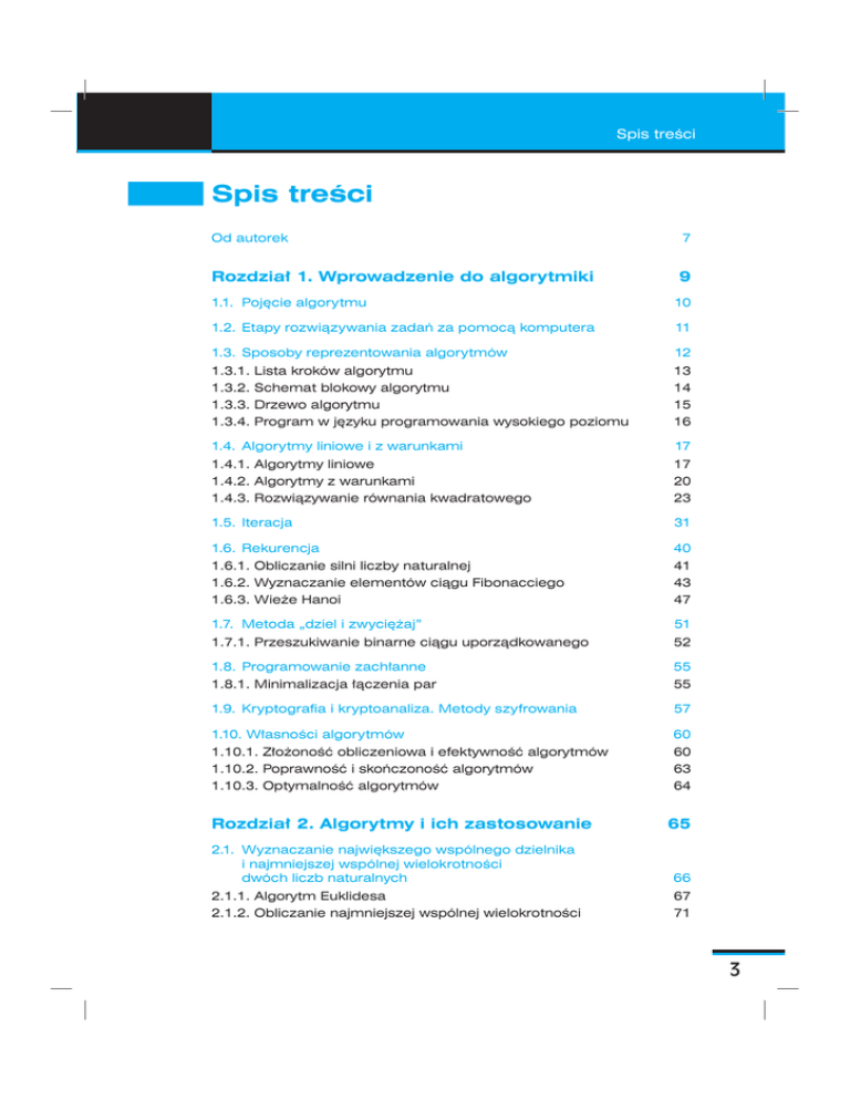 Spis treści Spis treści Od autorek 7 Rozdział 1. Wprowadzenie do algorytmiki 9 1.1. Pojęcie algorytmu 10 1.2. Etapy rozwiązywania zadań za pomocą komputera 11 1.3. Sposoby reprezentowania algorytmów 1.3.1. 1.3.2. 1.3.3. 1.3.4. Lista kroków algorytmu Schemat blokowy algorytmu Drzewo algorytmu Program w języku programowania wysokiego poziomu 12 13 14 15 16 1.4. Algorytmy liniowe i z warunkami 17 1.4.1. Algorytmy liniowe 1.4.2. Algorytmy z warunkami 1.4.3. Rozwiązywanie równania kwadratowego 17 20 23 1.5. Iteracja 31 1.6. Rekurencja 40 1.6.1. Obliczanie silni liczby naturalnej 1.6.2. Wyznaczanie elementów ciągu Fibonacciego 1.6.3. Wieże Hanoi 41 43 47 1.7. Metoda „dziel i zwyciężaj” 51 1.7.1. Przeszukiwanie binarne ciągu uporządkowanego 52 1.8. Programowanie zachłanne 55 1.8.1. Minimalizacja łączenia par 55 1.9. Kryptografia i kryptoanaliza. Metody szyfrowania 57 1.10. Własności algorytmów 60 1.10.1. Złożoność obliczeniowa i efektywność algorytmów 1.10.2. Poprawność i skończoność algorytmów 1.10.3. Optymalność algorytmów 60 63 64 Rozdział 2. Algorytmy i ich zastosowanie 65 2.1. Wyznaczanie największego wspólnego dzielnika i najmniejszej wspólnej wielokrotności dwóch liczb naturalnych 66 2.1.1. Algorytm Euklidesa 2.1.2. Obliczanie najmniejszej wspólnej wielokrotności 67 71 3 2.2. Wyznaczanie wartości wielomianu, pozycyjne systemy liczbowe i reprezentacja danych liczbowych w komputerze 2.2.1. Systemy liczbowe 2.2.2. Konwersje pozycyjnych systemów liczbowych 2.2.3. Operacje arytmetyczne wykonywane w różnych systemach liczbowych 2.2.4. Wyznaczanie wartości wielomianu za pomocą schematu Hornera 2.2.5. Zamiana liczb z dowolnego pozycyjnego systemu liczbowego na system dziesiętny z zastosowaniem schematu Hornera 2.2.6. Reprezentacja danych liczbowych w komputerze 2.3. Generowanie liczb pierwszych i badanie, czy liczba jest pierwsza 81 85 89 91 97 2.3.1. Badanie, czy liczba jest pierwsza 2.3.2. Sito Eratostenesa 97 100 2.4. Przeszukiwanie ciągu liczbowego — metody liniowe 103 2.4.1. Liniowe przeszukiwanie ciągu liczbowego 2.4.2. Liniowe przeszukiwanie ciągu liczbowego z wartownikiem 103 108 2.5. Znajdowanie najmniejszego lub największego elementu w ciągu liczbowym 110 2.6. Znajdowanie lidera w zbiorze 113 2.7. Sprawdzanie monotoniczności ciągu liczbowego 117 2.8. Sortowanie ciągu liczbowego 119 2.8.1. Metody sortowania przez porównania 2.8.2. Sortowanie w czasie liniowym 121 130 2.9. Zastosowanie metody „dziel i zwyciężaj” 136 2.9.1. Jednoczesne znajdowanie najmniejszego i największego elementu 2.9.2. Sortowanie przez scalanie 2.9.3. Sortowanie szybkie 136 140 146 2.10. Metody numeryczne i obliczenia przybliżone 150 2.10.1. Obliczanie wartości pierwiastka kwadratowego z liczby nieujemnej — algorytm Newtona-Raphsona 2.10.2. Obliczanie pola obszaru ograniczonego wykresem funkcji 2.10.3. Znajdowanie przybliżonej wartości miejsca zerowego funkcji — metoda połowienia przedziałów 2.11. Wyznaczanie wartości wyrażenia zapisanego w odwrotnej notacji polskiej ONP 4 72 72 75 150 154 162 166 Spis treści 2.12. Zastosowanie programowania zachłannego 169 2.12.1. Problem plecakowy 2.12.2. Algorytm wydawania reszty 169 179 2.13. Wybrane algorytmy kryptograficzne 182 2.13.1. Szyfrowanie symetryczne 2.13.2. Szyfrowanie asymetryczne 182 194 Rozdział 3. Programowanie w języku C++ 197 3.1. Języki programowania — pojęcia, klasyfikacja, przykłady 198 3.2. Wprowadzenie do programowania 200 3.2.1. 3.2.2. 3.2.3. 3.2.4. 3.2.5. 3.2.6. 201 204 209 213 221 222 Struktura programu Operacje wejścia-wyjścia Zmienne, stałe, wskaźniki i referencje Wyrażenia arytmetyczne, relacje i operatory logiczne Liczby losowe Komentarze 3.3. Podstawowe konstrukcje algorytmiczne 223 3.3.1. 3.3.2. 3.3.3. 3.3.4. 3.3.5. 3.3.6. 3.3.7. 223 223 224 224 227 230 235 Instrukcja Instrukcja Instrukcja Instrukcje Instrukcja Instrukcje Instrukcje pusta przypisania złożona warunkowe wyboru iteracyjne sterujące 3.4. Proste typy danych 236 3.5. Strukturalizacja programu 238 3.5.1. 3.5.2. 3.5.3. 3.5.4. 238 240 241 248 Struktura funkcji Zmienne lokalne i globalne Przekazywanie parametrów w funkcjach Przeładowanie funkcji 3.6. Strukturalne typy danych 254 3.6.1. Tablice 3.6.2. Łańcuchy 3.6.3. Struktury 254 262 268 3.7. Dynamiczne struktury danych 272 3.7.1. Stos 3.7.2. Kolejka 3.7.3. Lista 273 275 276 3.8. Plikowe operacje wejścia-wyjścia 279 5