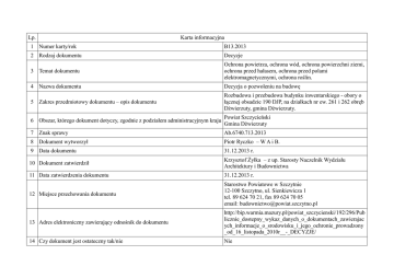 Lp. Karta informacyjna 1 Numer karty/rok B13.2013 2 Rodzaj dokumentu Decyzje 3 Temat dokumentu Ochrona powietrza, ochrona wód, ochrona powierzchni ziemi, ochrona przed hałasem, ochrona przed polami elektromagnetycznymi, ochrona roślin. 4 Nazwa dokumentu Decyzja o pozwoleniu na budowę 5 Zakres przedmiotowy dokumentu – opis dokumentu Rozbudowa i przebudowa budynku inwentarskiego - obory o łącznej obsadzie 190 DJP, na działkach nr ew. 261 i 262 obręb Dźwierzuty, gmina Dźwierzuty. 6 Obszar, którego dokument dotyczy, zgodnie z podziałem administracyjnym kraju Powiat Szczycieński Gmina Dźwierzuty 7 Znak sprawy Ab.6740.713.2013 8 Dokument wytworzył Piotr Ryczko – W A i B. 9 Data dokumentu 31.12.2013 r. 10 Dokument zatwierdził Krzysztof Żyłka – z up. Starosty Naczelnik Wydziału Architektury i Budownictwa 11 Data zatwierdzenia dokumentu 31.12.2013 r. 12 Miejsce przechowania dokumentu Starostwo Powiatowe w Szczytnie 12-100 Szczytno, ul. Sienkiewicza 1 tel. 89 624 70 21, fax 89 624 70 05 email: [email protected] 13 Adres elektroniczny zawierający odnośnik do dokumentu http://bip.warmia.mazury.pl/powiat_szczycienski/192/296/Pub licznie_dostepny_wykaz_danych_o_dokumentach_zawierajac ych_informacje_o_srodowisku_i_jego_ochronie_prowadzony _od_16_listopada_2010r__-_DECYZJE/ 14 Czy dokument jest ostateczny tak/nie Nie 15 Numer karty innych dokumentów w sprawie A13.2013 16 Data zamieszczenia w wykazie danych o dokumencie 08.01.2014 r. 17 Zastrzeżenia dotyczące nieudostępnienia informacji nie dotyczy 18 Uwagi Decyzja pozwolenia na budowę Nr I/626/13 z dnia 31.12.2013