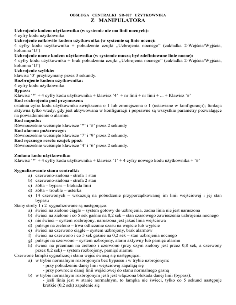 OBSŁUGA CENTRALKI SR-827 UŻYTKOWNIKA Z MANIPULATORA Uzbrojenie kodem użytkownika (w systemie nie ma linii nocnych): 4 cyfry kodu użytkownika Uzbrojenie całkowite kodem użytkownika (w systemie są linie nocne): 4 cyfry kodu użytkownika + pobudzenie czujki „Uzbrojenia nocnego” (zakładka 2-Wejścia/Wyjścia, kolumna ‘U’) Uzbrojenie nocne kodem użytkownika (w systemie muszą być zdefiniowane linie nocne): 4 cyfry kodu użytkownika + brak pobudzenia czujki „Uzbrojenia nocnego” (zakładka 2-Wejścia/Wyjścia, kolumna ‘U’) Uzbrojenie szybkie: klawisz ‘0’ przytrzymany przez 3 sekundy. Rozbrojenie kodem użytkownika: 4 cyfry kodu użytkownika Bypass: Klawisz ‘*’ + 4 cyfry kodu użytkownika + klawisz ‘4’ + nr linii + nr linii + ... + Klawisz ‘#’ Kod rozbrojenia pod przymusem: ostatnia cyfra kodu użytkownika zwiększona o 1 lub zmniejszona o 1 (ustawiane w konfiguracji); funkcja aktywna tylko wtedy, gdy jest aktywowana w konfiguracji i poprawne są wszystkie parametry pozwalające na powiadomienie o alarmie. Kod napadu: Równocześnie wciśnięte klawisze ‘*’ i ‘#’ przez 2 sekundy Kod alarmu pożarowego: Równocześnie wciśnięte klawisze ‘7’ i ‘9’ przez 2 sekundy. Kod ręcznego resetu czujek ppoż: Równocześnie wciśnięte klawisze ‘4’ i ‘6’ przez 2 sekundy. Zmiana kodu użytkownika: Klawisz ‘*’ + 4 cyfry kodu użytkownika + klawisz ‘1’ + 4 cyfry nowego kodu użytkownika + ‘#’ Sygnalizowanie stanu centralki: a) czerwono-zielona - strefa 1 stan b) czerwono-zielona - strefa 2 stan c) żółta – bypass – blokada linii d) żółta – trouble – usterka e) 14 czerwonych – wskazują na pobudzenie przyporządkowanej im linii wejściowej i jej stan bypasu Stany strefy 1 i 2 sygnalizowane są następująco: a) świeci na zielono ciągle – system gotowy do uzbrojenia, żadna linia nie jest naruszona b) świeci na zielono i co 5 sek gaśnie na 0,2 sek – stan czasowego zawieszenia uzbrojenia nocnego c) nie świeci – system rozbrojony, naruszona jest jakaś linia wejściowa d) pulsuje na zielono – trwa odliczanie czasu na wejście lub wyjście e) świeci na czerwono ciągle – system uzbrojony, brak alarmów f) świeci na czerwono i co 5 sek gaśnie na 0,2 sek – stan uzbrojenia nocnego g) pulsuje na czerwono – system uzbrojony, alarm aktywny lub pamięć alarmu h) świeci na przemian na zielono i czerwono (przy czym zielony jest przez 0,8 sek, a czerwony przez 0,2 sek) – system rozbrojony, pamięć alarmu Czerwone lampki sygnalizacji stanu wejść świecą się następująco: a) w trybie normalnym rozbrojonym bez bypassu i w trybie uzbrojonym: - przy pobudzeniu danej linii wejściowej zapalają się - przy powrocie danej linii wejściowej do stanu normalnego gasną b) w trybie normalnym rozbrojonym jeśli jest włączona blokada danej linii (bypass): - jeśli linia jest w stanie normalnym, to lampka nie świeci, tylko co 5 sekund następuje krótkie (0,2 sek) zapalenie się - jeśli linia jest w stanie pobudzonym, to lampka świeci się i co 5 sekund następuje krótkie (0,2 sek) jej zgaszenie c) w trybie zakładania blokad (bypass): - jeśli linia jest niezablokowania i niepobudzona, to lampka jest zgaszona - jeśli linia jest niezablokowania i pobudzona, to lampka szybko mruga - jeśli linia jest zablokowania, to lampka świeci w sposób ciągły Pamięć alarmu wcisnąć klawisz ‘5’ przez 2 sekundy, (wyj po 15 sek bez kasowania) klawisz „*” wyjście bez skasowania pamięci klawisza ‘#’ wyjście ze skasowaniem pamięci alarmu Sprawdzenie pamięci alarmu może nastąpić tylko w trybie rozbrojonym.. Trouble, klawisza ‘6’ przez 2 sekundy. Lampkom przyporządkowane są następujące usterki: 1 – brak zasilania głównego (230 V) 2 – niskie napięcie akumulatora 3 – brak podłączonego akumulatora 4 – brak komunikacji z klawiaturą 1 5 – brak komunikacji z klawiaturą 2 6 – brak komunikacji z klawiaturą 3 7 – błąd PINu karty SIM 8 – brak sygnału GSM 9 – brak zarejestrowania się w sieci GSM 11 – naruszenie wejścia sabotażu klawiatury 1 12 – naruszenie wejścia sabotażu klawiatury 2 13 – naruszenie wejścia sabotażu klawiatury 3 OBSŁUGA CENTRALKI SR-827 UŻYTKOWNIKA ZDALNA Autozałączenie – jeśli w trybie rozbrojonym przez skonfigurowany czas (1-255 min) nie nastąpi naruszenie żadnej linii, to uruchamiany jest proces uzbrajania taki, jak w przypadku wpisania kodu na klawiaturze, ale z czasem wyjścia wydłużonym 2-krotnie. Proces ten można przerwać wprowadzając na klawiaturze poprawny kod użytkownika Uzbrajanie zdalne – kkkkU; „kkkk” – 4-znakowy kod użytkownika; Rozbrajanie zdalne - kkkkR; Centralka po wykonaniu czynności odsyła zwrotnie SMSa o wykonanej czynności na nr telefonu, z którego przyszedł SMSem rozkaz. Zdalne sprawdzanie stanu centralki SR827 - kkkkZ SMSy zwrotne mają następującą strukturę: a) prefix - do 20 znaków identyfikujących obiekt, wpisanych w trakcie konfigurowania urządzenia b) aktualny stan uzbrojenia partycji c) aktualny stan wejść przyporządkowanych do partycji wejścia są podzielone na 3 grupy: przed znakiem ‘/’ są wpisane numery wejść aktualnie naruszonych, pomiędzy znakami ‘/’ i ‘#’ są wpisane numery wejść aktualnie będących w stanie normalnym i nie zablokowanych, po znaku ‘#’ są numery wejść zablokowanych (aktywny bypass) d) aktualny stan wyjść przyporządkowanych do partycji wyjścia są podzielone na 2 grupy: przed znakiem ‘/’ są wpisane numery wyjść aktualnie aktywnych, po znaku ‘/’ są wpisane numery wyjść aktualnie nieaktywnych e) aktualny czas zegara centralki SMSem nie można uzbroić systemu w trybie „nocnym”. Zdalne załączenie wyjścia przez SMS – kkkkZALx; „kkkk” – 4-znakowy kod użytkownika „ZAL” – rozkaz załączenia; ‘x’ – cyfra ‘1’ – ‘4’ oznaczająca nr wyjścia, które ma być załączone Zdalne wyłączen