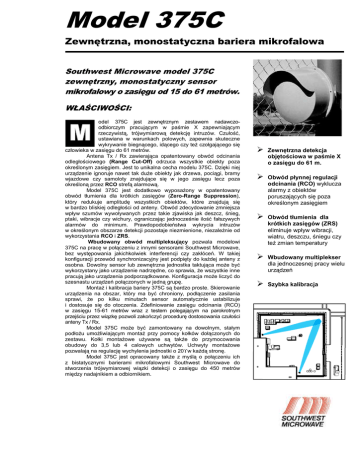 Model 375C Zewnętrzna, monostatyczna bariera mikrofalowa Southwest Microwave model 375C zewnętrzny, monostatyczny sensor mikrofalowy o zasięgu od 15 do 61 metrów. WŁAŚCIWOŚCI: odel 375C jest zewnętrznym zestawem nadawczoodbiorczym pracującym w paśmie X zapewniającym rzeczywistą, trójwymiarową detekcję intruzów. Czułość, ustawiana w warunkach polowych, zapewnia skuteczne wykrywanie biegnącego, idącego czy też czołgającego się człowieka w zasięgu do 61 metrów. Antena Tx / Rx zawierająca opatentowany obwód odcinania odległościowego (Range Cut-Off) odrzuca wszystkie obiekty poza określonym zasięgiem. Jest to unikalna cecha modelu 375C. Dzięki niej urządzenie ignoruje nawet tak duże obiekty jak drzewa, pociągi, bramy wjazdowe czy samoloty znajdujące się w jego zasięgu lecz poza określoną przez RCO strefą alarmową. Model 375C jest dodatkowo wyposażony w opatentowany obwód tłumienia dla krótkich zasięgów (Zero-Range Suppression), który redukuje amplitudę wszystkich obiektów, które znajdują się w bardzo bliskiej odległości od anteny. Obwód zdecydowanie zmniejsza wpływ szumów wywoływanych przez takie zjawiska jak deszcz, śnieg, ptaki, wibracje czy wichury, ograniczając jednocześnie ilość fałszywych alarmów do minimum. Prawdopodobieństwa wykrycia intruzów w określonym obszarze detekcji pozostaje niezmienione, niezależnie od wykorzystania RCO i ZRS. Wbudowany obwód multipleksujący pozwala modelowi 375C na pracę w połączeniu z innymi sensorami Southwest Microwave, bez występowania jakichkolwiek interferencji czy zakłóceń. W takiej konfiguracji przewód synchronizacyjny jest podpięty do każdej anteny z osobna. Dowolny sensor lub zewnętrzna jednostka taktująca może być wykorzystany jako urządzenie nadrzędne, co sprawia, że wszystkie inne pracują jako urządzenia podporządkowane. Konfiguracja może liczyć do szesnastu urządzeń połączonych w jedną grupę. Montaż i kalibracja bariery 375C są bardzo proste. Skierowanie urządzenia na obszar, który ma być chroniony, podłączenie zasilania sprawi, że po kilku minutach sensor automatycznie ustabilizuje i dostosuje się do otoczenia. Zdefiniowanie zasięgu odcinania (RCO) w zasięgu 15-61 metrów wraz z testem polegającym na parokrotnym przejściu przez wiązkę pozwoli zakończyć procedurę dostosowania czułości anteny Tx / Rx. Model 375C może być zamontowany na dowolnym, stałym podłożu umożliwiającym montaż przy pomocy kołków dołączonych do zestawu. Kołki montażowe używane są także do przymocowania obudowy do 3,5 lub 4 calowych uchwytów. Uchwyty montażowe pozwalają na regulację wychylenia jednostki o 20° w każdą stronę. Model 375C jest opracowany także z myślą o połączeniu ich z bistatycznymi barierami mikrofalowymi Southwest Microwave do stworzenia trójwymiarowej wiązki detekcji o zasięgu do 450 metrów między nadajnikiem a odbiornikiem. Zewnętrzna detekcja objętościowa w paśmie X o zasięgu do 61 m. Obwód płynnej regulacji odcinania (RCO) wyklucza alarmy z obiektów poruszających się poza określonym zasięgiem Obwód tłumienia dla krótkich zasięgów (ZRS) eliminuje wpływ wibracji, wiatru, deszczu, śniegu czy też zmian temperatury Wbudowany multiplekser dla jednoczesnej pracy wielu urządzeń Szybka kalibracja Model 375C Zewnętrzna, monostatyczna bariera mikrofalowa Wiązka: Specyfikacja techniczna: Model 375C zapewnia wiązkę detekcji o maksymalnym zasięgu do 61m i maksymalnej szerokości 7,2 metra. Poprzez regulację czułości można zredukować długość wiązki do około 15 metrów i 0,9 metra szerokości. Pozioma i pionowa rozpiętość wiązki sygnału to około 11,5°. Zasięgi takie są ustalone przy montażu bariery na wysokości 0,9-1,2 m. Montaż na innej wysokości zmniejszy maksymalny zasięg. Zakres wiązki i możliwości regulacji RCO są pokazane poniżej. Skład zestawu: model 375C zewnętrzna, monostatyczna bariera mikrofalowa (Tx / Rx) oraz uniwersalne uchwyty montażowe. Zasięg detekcji: zmienny, 15 do 61 metrów zależny od warunków lokalizacyjnych. Szerokość wiązki: zmienna, 0,9 do 7,2 metra zależna od warunków lokalizacyjnych. 2 Wielkość celu: 0,8 m dla obiektów przebiegających i przechodzących. Przy odpowiedniej regulacji na krótszych dystansach możliwa detekcja czołgających 2 się obiektów o wielkości 0,2 m . Prędkość celu: 6cm/sec do 8m/sec. Prawdopodobieństwo wykrycia: minimum 2 99% dla obiektów o wielkości do 0,8 m , zależne od relatywnego poziomu zakłóceń. Samotestowanie: 1) blokada anteny powoduje ciągły alarm. 2) zdalny test sprawdza cały obwód sensora. 3) pełna wydajność bez strat w synchronizacji. Cele odcięte przez RCO nie będą wykrywane poza określonym obszarem (15 do 61m). Moc promieniowania: 32 mWat impulsowo przy 10,525 GHz, dostępne także inne częstotliwości. Emisja promieniowania: homologacja FCC CA6375C. Wybór synchronizacji: wewnętrzna i zewnętrzna. Środowisko pracy: -35ºC do +66ºC, wilgotność do 100%. Napięcie wejściowe: 10,5 – 14 VDC 60 mA bez multipleksera, 100 mA z multiplekserem. Wyjście alarmowe: SPDT typ C, 2A/28VDC. Zabezpieczenia antysabotażowe: SPDT typ C, 2A /28 VDC. Opcjonalny moduł kontrolno-pomiarowy RM82: monitorowanie parametrów wiązki, czułości, stanu zasilania. Wewnętrzne wskaźniki LED: bieżąca informacja o stanie zasilania, alarmie, synchronizacji odbiornika. Waga: 4,5 kg brutto. Wymiary: Działanie: Antena Tx / Rx wysyła wiązkę promieniowania mikrofalowego w kierunku obszaru chronionego. W normalnych warunkach (brak intruzów) odbiornik otrzymuje sygnał zwrotny bazujący na kształcie chronionego obszaru. Poruszający się intruz powoduje relatywną zmianę odbieranego sygnału względem ustalonego progu czułości, co wywołuje alarm. Unikalny obwód odcinania (Range Cut-Off) określa zasięg detekcji w zasięgu od 15 do 61 metrów. Sygnał pozostały po odcięciu 