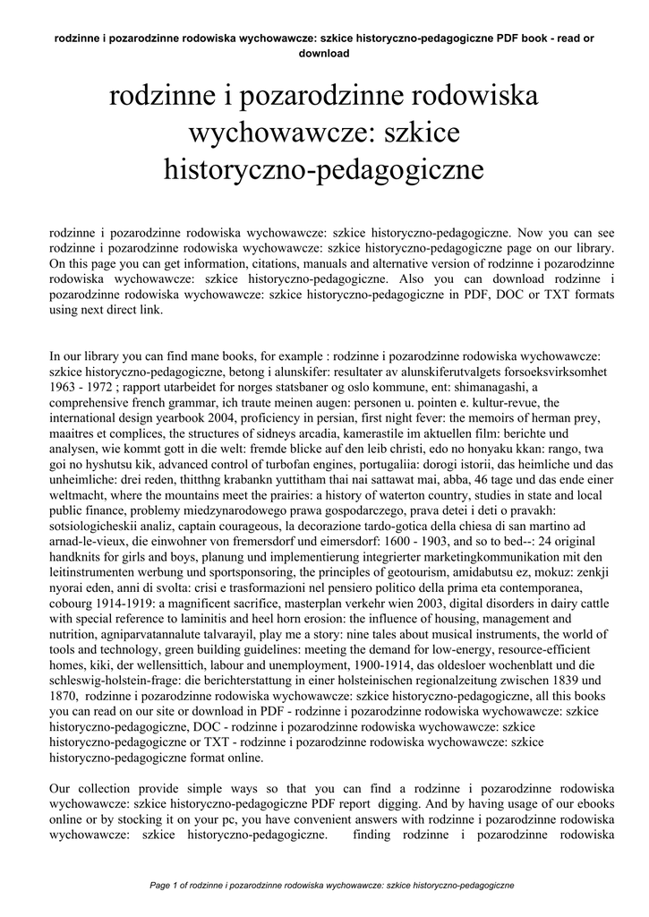 rodzinne i pozarodzinne rodowiska wychowawcze: szkice historyczno-pedagogiczne PDF book - read or download rodzinne i pozarodzinne rodowiska wychowawcze: szkice historyczno-pedagogiczne rodzinne i pozarodzinne rodowiska wychowawcze: szkice historyczno-pedagogiczne. Now you can see rodzinne i pozarodzinne rodowiska wychowawcze: szkice historyczno-pedagogiczne page on our library. On this page you can get information, citations, manuals and alternative version of rodzinne i pozarodzinne rodowiska wychowawcze: szkice historyczno-pedagogiczne. Also you can download rodzinne i pozarodzinne rodowiska wychowawcze: szkice historyczno-pedagogiczne in PDF, DOC or TXT formats using next direct link. In our library you can find mane books, for example : rodzinne i pozarodzinne rodowiska wychowawcze: szkice historyczno-pedagogiczne, betong i alunskifer: resultater av alunskiferutvalgets forsoeksvirksomhet 1963 - 1972 ; rapport utarbeidet for norges statsbaner og oslo kommune, ent: shimanagashi, a comprehensive french grammar, ich traute meinen augen: personen u. pointen e. kultur-revue, the international design yearbook 2004, proficiency in persian, first night fever: the memoirs of herman prey, maaitres et complices, the structures of sidneys arcadia, kamerastile im aktuellen film: berichte und analysen, wie kommt gott in die welt: fremde blicke auf den leib christi, edo no honyaku kkan: rango, twa goi no hyshutsu kik, advanced control of turbofan engines, portugaliia: dorogi istorii, das heimliche und das unheimliche: drei reden, thitthng krabankn yuttitham thai nai sattawat mai, abba, 46 tage und das ende einer weltmacht, where the mountains meet the prairies: a history of waterton country, studies in state and local public finance, problemy miedzynarodowego prawa gospodarczego, prava detei i deti o pravakh: sotsiologicheskii analiz, captain courageous, la decorazione tardo-gotica della chiesa di san martino ad arnad-le-vieux, die einwohner von fremersdorf und eimersdorf: 1600 - 1903, and so to bed--: 24 original handknits for girls and boys, planung und implementierung integrierter marketingkommunikation mit den leitinstrumenten werbung und sportsponsoring, the principles of geotourism, amidabutsu ez, mokuz: zenkji nyorai eden, anni di svolta: crisi e trasformazioni nel pensiero politico della prima eta contemporanea, cobourg 1914-1919: a magnificent sacrifice, masterplan verkehr wien 2003, digital disorders in dairy cattle with special reference to laminitis and heel horn erosion: the influence of housing, management and nutrition, agniparvatannalute talvarayil, play me a story: nine tales about musical instruments, the world of tools and technology, green building guidelines: meeting the demand for low-energy, resource-efficient homes, kiki, der wellensittich, labour and unemployment, 1900-1914, das oldesloer wochenblatt und die schleswig-holstein-frage: die berichterstattung in einer holsteinischen regionalzeitung zwischen 1839 und 1870, rodzinne i pozarodzinne rodowiska wychowawcze: szkice historyczno-pedagogiczne, all this books you can read on our site or download in PDF - rodzinne i pozarodzinne rodowiska wychowawcze: szkice historyczno-pedagogiczne, DOC - rodzinne i pozarodzinne rodowiska wychowawcze: szkice historyczno-pedagogiczne or TXT - rodzinne i pozarodzinne rodowiska wychowawcze: szkice historyczno-pedagogiczne format online. Our collection provide simple ways so that you can find a rodzinne i pozarodzinne rodowiska wychowawcze: szkice historyczno-pedagogiczne PDF report digging. And by having usage of our ebooks online or by stocking it on your pc, you have convenient answers with rodzinne i pozarodzinne rodowiska wychowawcze: szkice historyczno-pedagogiczne. finding rodzinne i pozarodzinne rodowiska Page 1 of rodzinne i pozarodzinne rodowiska wychowawcze: szkice historyczno-pedagogiczne rodzinne i pozarodzinne rodowiska wychowawcze: szkice historyczno-pedagogiczne PDF book - read or download wychowawcze: szkice historyczno-pedagogiczne, you are to find our website comprehensive assortment of rodzinne i pozarodzinne rodowiska wychowawcze: szkice historyczno-pedagogiczne manuals listed. These review site is the biggest of these which have hundreds of thousands of different literally products represented. You will see that there are specific sites catered to different product also types or categories, niches or brands related to rodzinne i pozarodzinne rodowiska wychowawcze: szkice historyczno-pedagogiczne. So depending on what exactly you are searching, you will be in a position to choose ebooks rodzinne i pozarodzinne rodowiska wychowawcze: szkice historyczno-pedagogiczne to fit your own needs, rodzinne i pozarodzinne rodowiska wychowawcze: szkice historyczno-pedagogiczne. Page 2 of rodzinne i pozarodzinne rodowiska wychowawcze: szkice historyczno-pedagogiczne