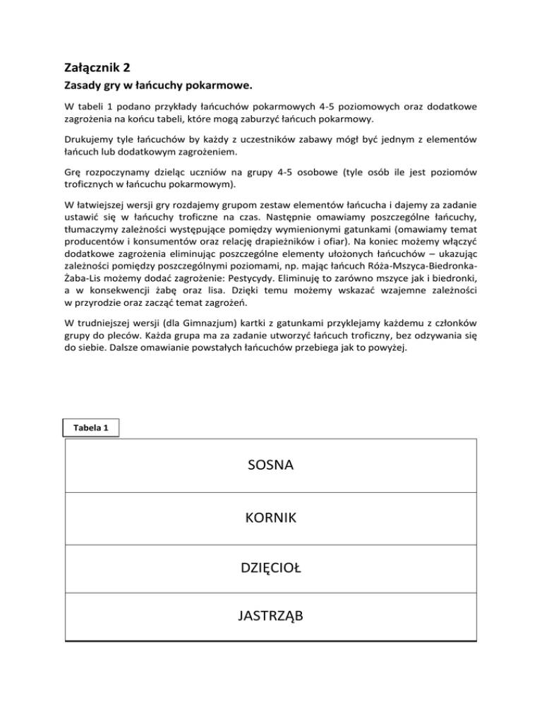 Załącznik 2 Zasady gry w łańcuchy pokarmowe. W tabeli 1 podano przykłady łańcuchów pokarmowych 4-5 poziomowych oraz dodatkowe zagrożenia na końcu tabeli, które mogą zaburzyć łańcuch pokarmowy. Drukujemy tyle łańcuchów by każdy z uczestników zabawy mógł być jednym z elementów łańcuch lub dodatkowym zagrożeniem. Grę rozpoczynamy dzieląc uczniów na grupy 4-5 osobowe (tyle osób ile jest poziomów troficznych w łańcuchu pokarmowym). W łatwiejszej wersji gry rozdajemy grupom zestaw elementów łańcucha i dajemy za zadanie ustawić się w łańcuchy troficzne na czas. Następnie omawiamy poszczególne łańcuchy, tłumaczymy zależności występujące pomiędzy wymienionymi gatunkami (omawiamy temat producentów i konsumentów oraz relację drapieżników i ofiar). Na koniec możemy włączyć dodatkowe zagrożenia eliminując poszczególne elementy ułożonych łańcuchów – ukazując zależności pomiędzy poszczególnymi poziomami, np. mając łańcuch Róża-Mszyca-BiedronkaŻaba-Lis możemy dodać zagrożenie: Pestycydy. Eliminuję to zarówno mszyce jak i biedronki, a w konsekwencji żabę oraz lisa. Dzięki temu możemy wskazać wzajemne zależności w przyrodzie oraz zacząć temat zagrożeń. W trudniejszej wersji (dla Gimnazjum) kartki z gatunkami przyklejamy każdemu z członków grupy do pleców. Każda grupa ma za zadanie utworzyć łańcuch troficzny, bez odzywania się do siebie. Dalsze omawianie powstałych łańcuchów przebiega jak to powyżej. Tabela 1 SOSNA KORNIK DZIĘCIOŁ JASTRZĄB LIŚĆ KAPUSTY BIELINEK KAPUSTNIK PAJĄK RYJÓWKA BOCIAN RÓŻA MSZYCA BIEDRONKA ŻABA LIS KONICZYNA ZAJĄC LIS WILK PĘDY BUKA MYSZ LEŚNA KUNA LEŚNA LIS RYŚ SOSNA KORNIK DZIĘCIOŁ JASTRZĄB PUCHACZ LIŚĆ KAPUSTY BIELINEK KAPUSTNIK PAJĄK RYJÓWKA BOCIAN RÓŻA MSZYCA BIEDRONKA ŻABA LIS KONICZYNA ZAJĄC LIS WILK PĘDY BUKA MYSZ LEŚNA KUNA LEŚNA LIS RYŚ POLOWANIA PESTYCYDY WYCINKA LASÓW ZANIECZYSZCZENIE WÓD POLOWANIA