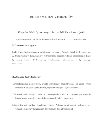 REGULAMIN RADY RODZICÓW Zespołu Szkół Społecznych im. A. Mickiewicza w Jaśle (podstawa prawna: art. 53 ust. 1 Ustawy z dnia 7 września 1991 o systemie oświaty) I. Postanowienia ogólne Rada Rodziców jest organem działającym na terenie Zespołu Szkół Społecznych im. A. Mickiewicza w Jaśle. Stanowi reprezentację rodziców dzieci uczęszczających do Społecznej Szkoły Podstawowej, Społecznego Gimnazjum i Społecznego Przedszkola. II. Zadania Rady Rodziców 1.Współdziałanie z zespołem, w celu jednolitego oddziaływania na dzieci przez rodzinę w procesie opiekuńczym, wychowawczym i dydaktycznym. 2.Uczestniczenie w życiu zespołu, przyczyniające się do ciągłego podnoszenia jakości pracy zespołu i zaspokajania potrzeb dzieci i młodzieży. 3.Prezentowanie wobec dyrektora i Rady Pedagogicznej opinii rodziców we wszystkich istotnych sprawach dotyczących działalności szkół. 4.Przekazywanie rodzicom dzieci, uczęszczających do zespołu informacji o planowanych działaniach na rzecz szkół, udzielanej pomocy oraz działalności finansowej Rady Rodziców. 5.Współorganizacja imprez i uroczystości szkolnych. III. Kompetencje Rady Rodziców 1.Uchwalanie w porozumieniu z Radą Pedagogiczną: programu profilaktyczno – wychowawczego dostosowanego do potrzeb rozwojowych dzieci i młodzieży. 2.Opiniowanie i wybór ofert zajęć dodatkowych. 3.Opiniowanie programu i harmonogramu poprawy efektywności kształcenia lub wychowania. 4.Rada Rodziców może upoważnić dyrektora do podpisania umów na prowadzenie zajęć dodatkowych opłacanych przez rodziców. IV. Tryb powoływania i odwoływania członków Rady Rodziców 1.Wybory do Rady Rodziców przeprowadza się na pierwszym zebraniu grupowym w każdym roku szkolnym. 2.Termin pierwszego zebrania rodziców w każdym roku szkolnym ustala dyrektor placówki. 3.Spośród rodziców wybranych do Rady Oddziałowej wyłania się w drodze tajnych wyborów dwóch przedstawicieli oddziału do Rady Rodziców. 4.W wyborach jedno dziecko reprezentuje jeden rodzic. 5.Kandydaci do Rady Rodziców muszą wyrazić zgodę na kandydowanie. 6.Zgłoszenia kandydatów do Rady Rodziców mogą dokonać jedynie rodzice obecni na zebraniu. 7.Wybory przedstawicieli Rady Oddziałowej do Rady Rodziców przeprowadza wychowawca. 8.Zadania wychowawcy oddziału w przeprowadzeniu głosowania do Rady Rodziców: przygotowanie kart do głosowania, powołanie komisji skrutacyjnej, sporządzenie protokołu z wyników wyborów do Rady Rodziców 9.Zadania komisji skrutacyjnej w przeprowadzeniu głosowania do Rady Rodziców: rozdanie kart do głosowania, na której to rodzice wpisują imię i nazwisko swojego kandydata, mającego reprezentować oddziału w Radzie Rodziców, nadzorowanie przebiegu głosowania, policzenie głosów na kartach do głosowania, rodziców z danego podanie wyników do wiadomości wychowawcy i rodziców. 10.Za wybranych do Rady Rodziców uważa się dwóch pierwszych kandydatów, którzy uzyskali największą liczbę głosów. 11.W przypadku równej liczby głosów otrzymanych przez kandydatów przeprowadza się kolejną turę głosowania. 12.Odstąpienie od udziału w działalności Rady Rodziców może nastąpić w drodze: złożenia rezygnacji, która wymaga akceptacji Rady Rodziców, odwołania na wniosek rodziców lub członków Rady Rodziców, po uprzednim przegłosowaniu zwykłą większością głosów. V. Skład i tryb powoływania Zarządu Rady Rodziców 1.Rada Rodziców składa się z przewodniczącego, zastępcy przewodniczącego – skarbnika oraz komisji rewizyjnej, w skład której wchodzi 2 jej członków. 2.Działalnością Rady Rodziców kieruje przewodniczący. 3.Osoby wymienione w pkt.1 wybierane są spośród członków Rady Rodziców na pierwszym jej posiedzeniu. 4.Wybory przewodniczącego Rady Rodziców przeprowadza się w głosowaniu jawnym poprzez podniesienie ręki. 5.Dopuszcza się przeprowadzenie wyborów przewodniczącego Rady Rodziców w głosowaniu tajnym, na wniosek członka Rady Rodziców przyjęty przez Radę Rodziców w glosowaniu jawnym. 6.Zadania dyrektora przedszkola podczas wyborów przewodniczącego Rady Rodziców: przyjmowanie zgłoszeń kandydatur, przeprowadzenie głosowania, policzenie głosów i podanie wyników głosowania. 7.Zgłoszenia kandydatów na przewodniczącego Rady Rodziców mogą dokonać jedynie członkowie Rady Rodziców obecni na zebraniu. 8.Kandydat na przewodniczącego Rady Rodziców musi wyrazić zgodę na kandydowanie. 9.Wybory przewodniczącego Rady Rodziców odbywają się przy nieograniczonej liczbie kandydatów zgłoszonych przez członków Rady Rodziców. 10.W przypadku nie rozstrzygnięcia wyborów w związku z uzyskaniem równej ilości głosów o wyborze przewodniczącego decyduje kolejna tura głosowania. 11.Przewodniczący przejmuje prowadzenie zebrania i przeprowadza wybór kolejnych osób, wchodzących w skład zarządu Rady Rodziców. 12.Kandydaci na zastępcę przewodniczącego - skarbnika i członków komisji rewizyjnej muszą wyrazić zgodę na kandydowanie. 13.Wybór zastępcy przewodniczącego - skarbnika i komisji rewizyjnej odbywa się w głosowaniu jawnym, poprzez podniesienie ręki. 14.W przypadku nie rozstrzygnięcia wyborów w związku z uzyskaniem równej ilości głosów, o wyborze zastępcy przewodniczącego - skarbnika lub komisji rewizyjnej decyduje kolejna tura głosowania. VI. Zadania członków Rady Rodziców Zadania przewodniczącego: Kierowanie całokształtem prac Rady Rodziców, Współdziałanie ze wszystkimi członkami Rady Rodziców, włączanie ich do realizacji planu pracy. Opracowywanie kwartalnego harmonogramu dyżurów członków Rady Rodziców przy pobieraniu składek na fundusz Rady Rodziców( jeżeli takowy zostanie uchwalony). Zwoływanie i prowadzenie posiedzeń Rady Rodziców. Przekazywanie dyrektorowi opinii i postulatów Rady Rodziców dotyczących działalności szkół. Zadania zastępcy przewodniczącego - skarbnika: