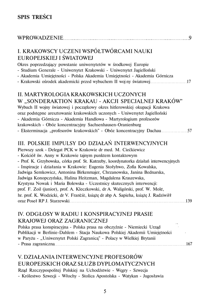 SPIS TREŚCI WPROWADZENIE 9 I. KRAKOWSCY UCZENI WSPÓŁTWÓRCAMI NAUKI EUROPEJSKIEJ I ŚWIATOWEJ Okres poprzedzający powstanie uniwersytetów w środkowej Europie - Studium Generale - Uniwersytet Krakowski - Uniwersytet Jagielloński - Akademia Umiejętności - Polska Akademia Umiejętności - Akademia Górnicza - Krakowski ośrodek akademicki przed wybuchem II woj ny światowej 17 II. MARTYROLOGIA KRAKOWSKICH UCZONYCH W „SONDERAKTION KRAKAU - AKCJI SPECJALNEJ KRAKÓW" Wybuch II wojny światowej i początkowy okres hitlerowskiej okupacji Krakowa oraz podstępne aresztowanie krakowskich uczonych - Uniwersytet Jagielloński - Akademia Górnicza - Akademia Handlowa - Martyrologium profesorów krakowskich - Obóz koncentracyjny Sachsenhausen-Oranienburg - Eksterminacja „profesorów krakowskich" - Obóz koncentracyjny Dachau 57 III. POLSKIE IMPULSY DO DZIAŁAŃ INTERWENCYJNYCH Pierwszy szok - Delegat PCK w Krakowie dr med. M. Ciećkiewicz - Kościół św. Anny w Krakowie tajnym punktem kontaktowym - Prof. K. Grzybowska, córka prof. St. Kutrzeby, koordynatorka działań interwencyjnych - Inspiracje i działania w Krakowie: Eugenia Stołyhwo, Zofia Kowalska, Jadwiga Semkowicz, Antonina Birkenmajer, Chrzanowska, Janina Bednarska, Jadwiga Konopczyńska, Halina Heitzman, Magdalena Kraszewska, Krystyna Nowak i Maria Bolewska - Uczestnicy skutecznych interwencji: prof. F. Zoil (junior), prof. A. Kleczkowski, dr A. Waligórski, prof. W. Mole, hr. prof. K. Wodzicki, dr V. Francie, książę dr abp A. Sapieha, książę J. Radziwiłł oraz Poseł RP J. Starzewski 139 IV. ODGŁOSY W RADIU I KONSPIRACYJNEJ PRASIE KRAJOWEJ ORAZ ZAGRANICZNEJ Polska prasa konspiracyjna - Polska prasa na obczyźnie - Niemiecki Urząd Publikacji w Berlinie-Dahlem - Stacja Naukowa Polskiej Akademii Umiejętności w Paryżu - „Uniwersytet Polski Zagranicą" - Polacy w Wielkiej Brytanii - Prasa zagraniczna V. DZIAŁANIA INTERWENCYJNE PROFESORÓW EUROPEJSKICH ORAZ SŁUŻB DYPLOMATYCZNYCH Rząd Rzeczypospolitej Polskiej na Uchodźstwie - Węgry - Szwecja - Królestwo Szwecji - Włochy - Stolica Apostolska - Watykan - Jugosławia 167 - Bułgaria - Szwajcaria - Hiszpania - Grecja - Austria - Belgia - Francja Stany Zjednoczone Ameryki Północnej - Wielka Brytania - Holandia Irlandia - Kanada - Litwa - Palestyna - Portugalia - Turcja - Meksyk III Rzesza Niemiecka 209 VI. SOLIDARNOŚĆ NIEMIECKICH UCZONYCH W AKCJACH INTERWENCYJNYCH Prekursorzy średniowiecznej polsko-niemieckiej współpracy naukowej - Berlińska Akademia Nauk - Slawista prof. Max Vasmer - Fonetyk prof. Diedrich Westermann - Historyk prof. Robert Holtzmann - Fizyk prof. Max von Laue i fizykochemik prof. Otto Hahn - Slawiści: prof. Bemd von Arnim, doc. Margarete Woltner; Sinolog prof. Erich Haenisch; doc. turkologii Annemarie von Gabain - Prof. Walter Huckel - Matematycy: dr Hasso Harlen, prof. Heinrich Scholz - Profesorowie: Ernst Graeser, Hermann Aubin, Josef Pfitzner, Walter Gross - Zoolodzy: prof. Karl von Frisch, dr Walter Greite 339 VII. POMOCNE DŁONIE EUROPEJCZYKÓW, AMERYKANÓW I KANADYJCZYKÓW Polacy prekursorami terminu gramatycznego „Europiana - europejski" - Średniowieczna jedność europejska - „Naukowa jedność europejska" - Pomocne dłonie Europejczyków, Amerykanów i Kanadyjczyków w układzie chronologicznym - Rok 1939 - Rok 1940 - Rok 1941 - Rok 1942 - Rok 1943 - 1944 - Podsumowanie zbrodniczych działań hitlerowców w „Akcji Specjalnej Kraków" - Solidarne poczucie „naukowej jedności europejskiej" motywem protestów i działań interwencyjnych uczonych niemal z całego świata 405 SUPLEMENT WYKAZ SKRÓTÓW ANEKS 1 CZŁONKOWIE ZAGRANICZNI CZYNNI I KORESPONDENCI AKADEMII UMIEJĘTNOŚCI ORAZ POLSKIEJ AKADEMII UMIEJĘTNOŚCI OD 1872 DO 1939 R., W UKŁADZIE NARODOWOŚCIOWO-ALFABETYCZNYM Anglia - Wielka Brytania - Austria - Belgia - Bułgaria - Chile - Czechosłowacja - Dania - Finlandia - Francja - Holandia - Jugosławia - Kanada - Łotwa - Monaco - Niemcy - III Rzesza Niemiecka - Norwegia - Rumunia - Stany Zjednoczone Ameryki Północnej 485 - Szwajcaria - Szwecja - Stolica Apostolska - Watykan - Węgry - Wiochy - Związek Socjalistycznych Republik Radzieckich 493 ANEKS 2 BIOGRAFIE ZAARESZTOWANYCH W DNIU 6 LISTOPADA 1939 R. W COLLEGIUM NOVUM UNIWERSYTETU JAGIELLOŃSKIEGO W KRAKOWIE UNIWERSYTET JAGIELLOŃSKI - UJ Wydział Teologiczny - Wydział Prawa - Wydział Lekarski - Wydział Filozoficzny-Wydział Rolniczy 507 AKADEMIA GÓRNICZA - AG Wydział Górniczy - Wydział Hutniczy 552 AKADEMIA HANDLOWA - AH 559 PRZYPADKOWE OSOBY 560 ILUSTRACJE, RYCINY I TABELE SPIS ILUSTRACJI 565 SPIS RYCIN 573 SPIS TABEL 574 WYKAZ ŹRÓDEŁ I DOKUMENTÓW 575 NIEDRUKOWANE ŹRÓDŁA ZNAJDUJĄCE SIĘ W ARCHIWACH I BIBLIOTEKACH 575 LITERATURA 577 INDEKS OSOBOWY 605