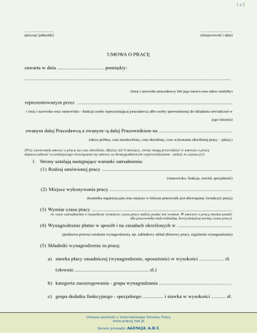 1z2 .............................. (pieczęć jednostki) ................................. (miejscowość i data) UMOWA O PRACĘ zawarta w dniu .................................... pomiędzy: ............................................................................................................................................................... (imię i nazwisko pracodawcy lub jego nazwa oraz adres siedziby) reprezentowanym przez ........................................................................................................................ ( imię i nazwisko oraz stanowisko - funkcja osoby reprezentującej pracodawcę albo osoby upoważnionej do składania oświadczeń w jego imieniu) zwanym dalej Pracodawcą a zwanym/-ą dalej Pracownikiem na ......................................................... (okres próbny, czas nieokreślony, czas określony, czas wykonania określonej pracy – jakiej.) (Przy zawieraniu umowy o pracę na czas określony, dłuższy niż 6 miesięcy, strony mogą przewidzieć w umowie o pracę dopuszczalność wcześniejszego rozwiązania tej umowy za dwutygodniowym wypowiedzeniem - należy to zaznaczyć) 1. Strony ustalają następujące warunki zatrudnienia: (1) Rodzaj umówionej pracy ..................................................................................................... (stanowisko, funkcja, zawód, specjalność) (2) Miejsce wykonywania pracy ............................................................................................... (komórka organizacyjna oraz miejsce w którym pracownik jest obowiązany świadczyć pracę) (3) Wymiar czasu pracy ............................................................................................................. (w razie zatrudnienia w niepełnym wymiarze czasu pracy należy podać ten wymiar. W umowie o pracę można ustalić dla pracownika indywidualną, korzystniejszą normę czasu pracy) (4) Wynagrodzenie płatne w sposób i na zasadach określonych w ........................................... (podstawa prawna ustalania wynagrodzenia, np. zakładowy układ zbiorowy pracy, regulamin wynagradzania) (5) Składniki wynagrodzenia za pracę: a) stawka płacy zasadniczej (wynagrodzenie, uposażenie) w wysokości ................... zł. (słownie ......................................................... zł.) b) kategoria zaszeregowania - grupa wynagradzania ........................................................ c) grupa dodatku funkcyjnego - specjalnego ................ i stawka w wysokości ........... zł. Umowa pochodzi z Internetowego Serwisu Pracy www.pracuj.net.pl Serwis prowadzi Agencja A.R.T. 2z2 (słownie ..........................................................zł.) d) premie i inne dodatki ..................................................................................................... (powołać odpowiedni akt prawny stanowiący podstawę ich ustalania, np. przepisy o wynagrodzeniu, oraz wysokość składników stałych) (6) Inne warunki zatrudnienia ................................................................................................... (ze strony pracodawcy mogą one dotyczyć np. zobowiązania się do zapewnienia pracownikowi mieszkania, zwrotu kosztów najmu, pokrycia kosztów kształcenia, wydłużenia okresu wypowiedzenia, a ze strony pracownika zobowiązanie do niepodejmowania innej pracy w okresie trwania umowy, zgoda na obustronne wydłużenie okresu wypowiedzenia). 2. Strony ustalają, że dniem rozpoczęcia pracy będzie: ................................................................ 3. Pracownik oświadcza, że zapoznał się z treścią: a) obowiązującego u pracodawcy regulaminu pracy, b) przepisów dotyczących zasad postępowania z wiadomościami i dokumentami stanowiącymi tajemnicę (państwową, służbową, zawodową) zawartych w art. 260 264 Kodeksu Karnego oraz w ustawie z dnia 14 grudnia 1982 r. o ochronie tajemnicy państwowej i służbowej (Dz. U. Nr 40, poz. 271 z późniejszymi zmianami, c) przepisów określonych w .............................................................................................. (w zależności od tego, jakie przepisy mają zastosowanie u danego pracodawcy, np. zarządzeniach pracodawcy) ustawie z dnia 23 marca 1991 r. "prawo o publicznym obrocie papierami wartościowymi i funduszach powierniczych" (Dz. U. z 1994 r. Nr 58, poz. 239) dotyczących zwalczania nieuczciwej konkurencji, zawartych w ustawie z dnia 16 kwietnia 1993 r, "o zwalczaniu nieuczciwej konkurencji" (Dz. U. Nr 47, poz. 211 z późniejszymi zmianami Dz. U. z 1996 r. Nr 106, poz. 496 i Nr 156 poz. 775). i zobowiązuje się do ich przestrzegania oraz oświadcza, że znane mu są zasady odpowiedzialności w przypadku naruszenia wyżej wymienionych przepisów. .......................................... ................................................ (data, pieczęć nagłówkowa pracodawcy oraz pieczęć imienna i podpis pracodawcy lub osoby reprezentującej pracodawcę, albo osoby upoważnionej do składania oświadczeń w jego imieniu) (data i podpis Pracownika) Umowa pochodzi z Internetowego Serwisu Pracy www.pracuj.net.pl Serwis prowadzi Agencja A.R.T.