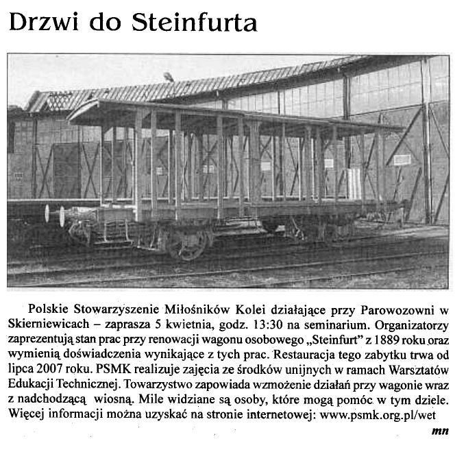 Drzwi do Steinfurta Polskie Stowarzyszenie Mi³oœnikówKolei dzia³aj¹ce przy Parowozowni w Skierniewicach-zaprasza 5 kwietnia, godz. 13:30na seminarium. Organizatorzy zaprezentuj¹stanpracprzy renowacjiwagonuosobowego"Steinfurt" z 1889roku.oraz wymieni¹ doœwiadczenia wynikaj¹ce z tych prac. Restauracjatego zabytku trwa od lipca 2007 roku. PSMK realizuje zajêciaze œrodków unijnych w ramachWarsZtatów EdukacjiTechnicznej.Towarzystwozapowiadawzmo¿eniedzia³añprzy wagoniewraz z nadchodz¹c¹ wiosn¹. Mile widziane s¹ osoby,które mog¹ pomóc w tym dziele. Wiêcej informacji mo¯na uzyskaæna stronie internetowej: www.psmk.org.pl/wet mn