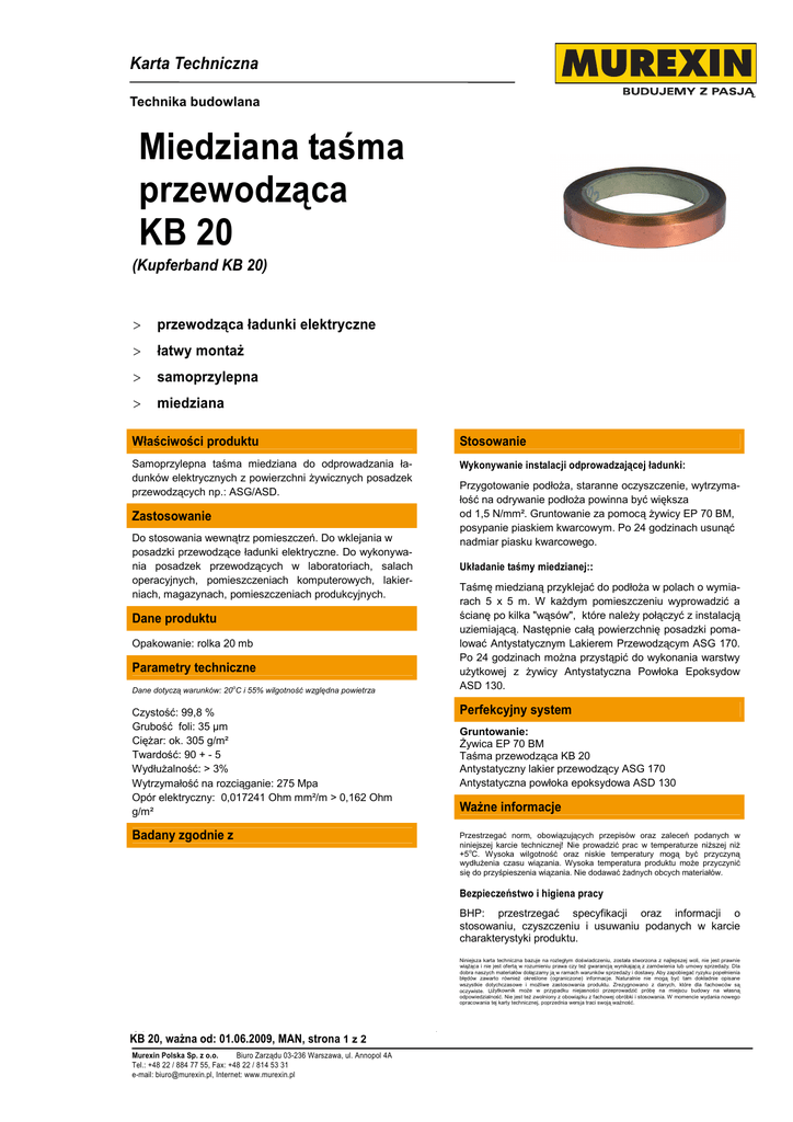 Karta Techniczna Technika budowlana BAT_KB20 Miedziana taśma przewodząca KB 20 (Kupferband KB 20) > przewodząca ładunki elektryczne > łatwy montaŜ > samoprzylepna > miedziana Właściwości produktu Stosowanie Samoprzylepna taśma miedziana do odprowadzania ładunków elektrycznych z powierzchni Ŝywicznych posadzek przewodzących np.: ASG/ASD. Wykonywanie instalacji odprowadzającej ładunki: Przygotowanie podłoŜa, staranne oczyszczenie, wytrzymałość na odrywanie podłoŜa powinna być większa od 1,5 N/mm². Gruntowanie za pomocą Ŝywicy EP 70 BM, posypanie piaskiem kwarcowym. Po 24 godzinach usunąć nadmiar piasku kwarcowego. Zastosowanie Do stosowania wewnątrz pomieszczeń. Do wklejania w posadzki przewodzące ładunki elektryczne. Do wykonywania posadzek przewodzących w laboratoriach, salach operacyjnych, pomieszczeniach komputerowych, lakierniach, magazynach, pomieszczeniach produkcyjnych. Układanie taśmy miedzianej:: Taśmę miedzianą przyklejać do podłoŜa w polach o wymiarach 5 x 5 m. W kaŜdym pomieszczeniu wyprowadzić a ścianę po kilka "wąsów", które naleŜy połączyć z instalacją uziemiającą. Następnie całą powierzchnię posadzki pomalować Antystatycznym Lakierem Przewodzącym ASG 170. Po 24 godzinach moŜna przystąpić do wykonania warstwy uŜytkowej z Ŝywicy Antystatyczna Powłoka Epoksydow ASD 130. Dane produktu Opakowanie: rolka 20 mb Parametry techniczne Dane dotyczą warunków: 20oC i 55% wilgotność względna powietrza Perfekcyjny system Czystość: 99,8 % Grubość foli: 35 µm CięŜar: ok. 305 g/m² Twardość: 90 + - 5 WydłuŜalność: > 3% Wytrzymałość na rozciąganie: 275 Mpa Opór elektryczny: 0,017241 Ohm mm²/m > 0,162 Ohm g/m² Gruntowanie: śywica EP 70 BM Taśma przewodząca KB 20 Antystatyczny lakier przewodzący ASG 170 Antystatyczna powłoka epoksydowa ASD 130 WaŜne informacje Badany zgodnie z Przestrzegać norm, obowiązujących przepisów oraz zaleceń podanych w niniejszej karcie technicznej! Nie prowadzić prac w temperaturze niŜszej niŜ o +5 C. Wysoka wilgotność oraz niskie temperatury mogą być przyczyną wydłuŜenia czasu wiązania. Wysoka temperatura produktu moŜe przyczynić się do przyśpieszenia wiązania. Nie dodawać Ŝadnych obcych materiałów. Bezpieczeństwo i higiena pracy BHP: przestrzegać specyfikacji oraz informacji o stosowaniu, czyszczeniu i usuwaniu podanych w karcie charakterystyki produktu. Niniejsza karta techniczna bazuje na rozległym doświadczeniu, została stworzona z najlepszej woli, nie jest prawnie wiąŜąca i nie jest ofertą w rozumieniu prawa czy teŜ gwarancją wynikającą z zamówienia lub umowy sprzedaŜy. Dla dobra naszych materiałów dołączamy ją w ramach warunków sprzedaŜy i dostawy. Aby zapobiegać ryzyku popełnienia błędów zawarto równieŜ określone (ograniczone) informacje. Naturalnie nie mogą być tam dokładnie opisane wszystkie dotychczasowe i moŜliwe zastosowania produktu. Zrezygnowano z danych, które dla fachowców są oczywiste. UŜytkownik moŜe w przypadku niejasności przeprowadzić próbę na miejscu budowy na własną odpowiedzialność. Nie jest teŜ zwolniony z obowiązku z fachowej obróbki i stosowania. W momencie wydania nowego opracowania tej karty technicznej, poprzednia wersja traci swoją waŜność. 01 20, waŜna od: 01.06.2009, MAN, strona 1 z 2 KB Murexin Polska Sp. z o.o. Biuro Zarządu 03-236 Warszawa, ul. Annopol 4A Tel.: +48 22 / 884 77 55, Fax: +48 22 / 814 53 31 e-mail: [email protected], Internet: www.murexin.pl 1 Karta Techniczna Technika budowlana BAT_KB20 01 20, waŜna od: 01.06.2009, MAN, strona 2 z 2 KB Murexin Polska Sp. z o.o. Biuro Zarządu 03-236 Warszawa, ul. Annopol 4A Tel.: +48 22 / 884 77 55, Fax: +48 22 / 814 53 31 e-mail: [email protected], Internet: www.murexin.pl 2