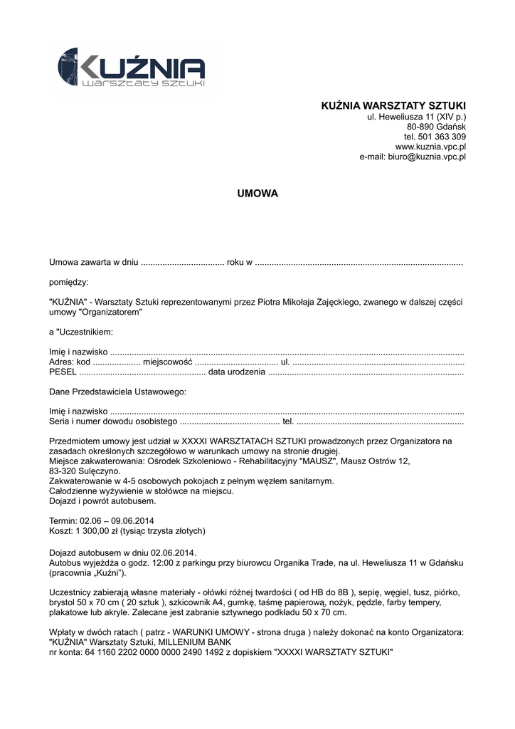 KUŹNIA WARSZTATY SZTUKI ul. Heweliusza 11 (XIV p.) 80-890 Gdańsk tel. 501 363 309 www.kuznia.vpc.pl e-mail: [email protected] UMOWA Umowa zawarta w dniu ................................... roku w ....................................................................................... pomiędzy: "KUŹNIA" - Warsztaty Sztuki reprezentowanymi przez Piotra Mikołaja Zajęckiego, zwanego w dalszej części umowy "Organizatorem" a "Uczestnikiem: Imię i nazwisko .................................................................................................................................................... Adres: kod .................... miejscowość ................................... ul. ........................................................................ PESEL ..................................................... data urodzenia .................................................................................. Dane Przedstawiciela Ustawowego: Imię i nazwisko .................................................................................................................................................... Seria i numer dowodu osobistego .......................................... tel. ...................................................................... Przedmiotem umowy jest udział w XXXXI WARSZTATACH SZTUKI prowadzonych przez Organizatora na zasadach określonych szczegółowo w warunkach umowy na stronie drugiej. Miejsce zakwaterowania: Ośrodek Szkoleniowo - Rehabilitacyjny "MAUSZ", Mausz Ostrów 12, 83-320 Sulęczyno. Zakwaterowanie w 4-5 osobowych pokojach z pełnym węzłem sanitarnym. Całodzienne wyżywienie w stołówce na miejscu. Dojazd i powrót autobusem. Termin: 02.06 – 09.06.2014 Koszt: 1 300,00 zł (tysiąc trzysta złotych) Dojazd autobusem w dniu 02.06.2014. Autobus wyjeżdża o godz. 12:00 z parkingu przy biurowcu Organika Trade, na ul. Heweliusza 11 w Gdańsku (pracownia „Kuźni”). Uczestnicy zabierają własne materiały - ołówki różnej twardości ( od HB do 8B ), sepię, węgiel, tusz, piórko, brystol 50 x 70 cm ( 20 sztuk ), szkicownik A4, gumkę, taśmę papierową, nożyk, pędzle, farby tempery, plakatowe lub akryle. Zalecane jest zabranie sztywnego podkładu 50 x 70 cm. Wpłaty w dwóch ratach ( patrz - WARUNKI UMOWY - strona druga ) należy dokonać na konto Organizatora: "KUŹNIA" Warsztaty Sztuki, MILLENIUM BANK nr konta: 64 1160 2202 0000 0000 2490 1492 z dopiskiem "XXXXI WARSZTATY SZTUKI" WARUNKI UMOWY 1. Zawarcie umowy następuje w momencie podpisania jej przez Uczestnika lub jego Przedstawiciela Ustawowego oraz Organizatora XXXXI WARSZTATÓW SZTUKI. Podpisanie umowy równoznaczne jest z przyjęciem do wiadomości umowy oraz poddaniem się rygorom z niej wynikającym. 2. Podpisanie umowy przez Przedstawiciela Ustawowego równoznaczne jest ze złożeniem przez niego zapewnienia i oświadczenia o tym, że Uczestnik posiada dojrzałość społeczną oraz stopień rozwoju psychofizycznego pozwalający Uczestnikowi na samodzielny udział w XXXXI WARSZTATACH SZTUKI poza miejscem zakwaterowania. 3. Wpisanie na listę uczestników następuje pod warunkiem: - dokonania wpłaty zadatku w kwocie 600,00 zł w dniu podpisania umowy lub do dnia 02.05.2014 - wpłaty pozostałej kwoty w wysokości 700,00 zł do dnia 19.05.2014. 4. W szczególnych przypadkach Organizator może zmienić warunki płatności opisane w pkt 3 po pisemnym zobowiązaniu Uczestnika określającym termin wpłaty. 5. W przypadku nie wpłacenia i nie przysłania przez Uczestnika wymaganych w pkt 3 dokumentów Organizator nie zapewnia dokonania rezerwacji miejsc na XXXXI WARSZTATACH SZTUKI. 6. Rezygnacja z uczestnictwa w XXXXI WARSZTATACH SZTUKI po dokonaniu wpłaty może nastąpić na następujących warunkach: - w przypadku pisemnego powiadomienia Organizatora o odstąpieniu od umowy na co najmniej 21 dni przed rozpoczęciem XXXXI WARSZTATÓW SZTUKI - Organizator potrąca 50% pełnej kwoty - w przypadku pisemnego powiadomienia Organizatora o odstąpieniu od umowy na co najmniej 7 dni przed rozpoczęciem XXXXI WARSZTATÓW SZTUKI - Organizator potrąca 70% pełnej kwoty - w przypadku pisemnego powiadomienia Organizatora o odstąpieniu od umowy w terminie krótszym niż 7 dni przed rozpoczęciem XXXXI WARSZTATÓW SZTUKI bądź zrezygnowania z udziału w nich w trakcie pobytu - Organizator zatrzymuje pełną kwotę, a Uczestnik nie ma prawa domagania się jej zwrotu. 7. Ewentualne reklamacje co do przebiegu i organizacji można pisemnie zgłaszać Organizatorowi bądź wskazanej przez niego osobie, w terminie 7 dni od daty zakończenia XXXXI WARSZTATÓW SZTUKI. 8. Uczestnik przyjmuje do wiadomości, że Uczestnicy w trakcie indywidualnego wyjścia w plener przebywać będą bez stałej opieki Organizatora, który dochowa wszelkiej staranności, by czas pobytu bez opieki ograniczony był do minimum, a zajęcia odbywające się w plenerze odbywały się za dnia na terenie wyznaczonym lub ograniczonym. 9. Organizator dokona grupowego ubezpieczenia uczestników XXXXI WARSZTATÓW SZTUKI. 10. Umowę sporządzono w dwóch jednobrzmiących egzemplarzach, po jednym dla każdej ze stron. Podpis Uczestnika ........................................ Podpis Organizatora ........................................ Podpis Przedstawiciela Ustawowego ........................................