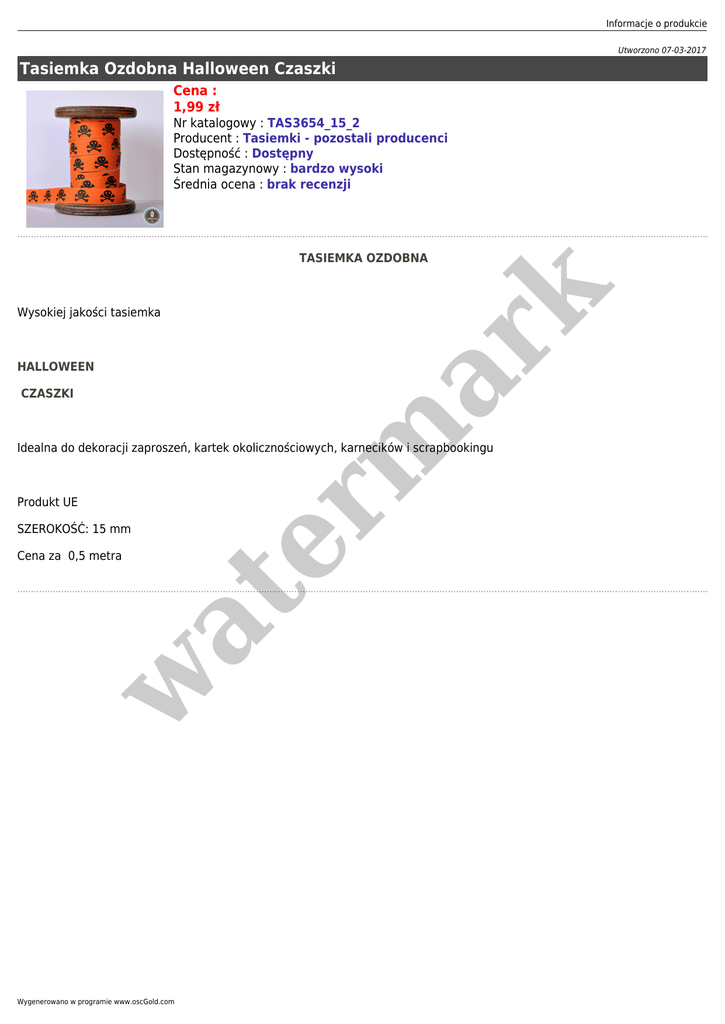 Informacje o produkcie Utworzono 07-03-2017 Tasiemka Ozdobna Halloween Czaszki Cena : 1,99 zł Nr katalogowy : TAS3654_15_2 Producent : Tasiemki - pozostali producenci Dostępność : Dostępny Stan magazynowy : bardzo wysoki Średnia ocena : brak recenzji Wysokiej jakości tasiemka HALLOWEEN CZASZKI er m ar k TASIEMKA OZDOBNA Idealna do dekoracji zaproszeń, kartek okolicznościowych, karnecików i scrapbookingu Produkt UE SZEROKOŚĆ: 15 mm w at Cena za 0,5 metra Wygenerowano w programie www.oscGold.com