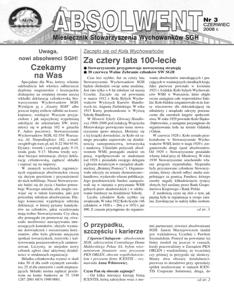 Nr 3 CZERWIEC 2008 r. Miesi´cznik Stowarzyszenia Wychowanków SGH Zacz´∏o si´ od Ko∏a Wychowaƒców Uwaga, nowi absolwenci SGH! Czekamy na Was Specjalnie dla Was, którzy w∏aÊnie odebraliÊcie lub wkrótce odbierzecie dyplomy magisterskie i licencjackie drukujemy na ostatniej stronie naszej wk∏adki deklaracj´ cz∏onkowskà Stowarzyszenia Wychowanków SGH. Wytnijcie jà z „Gazety SGH” albo jeszcze lepiej zróbcie odbitki na kserokopiarce, rozdajcie Waszym przyjacio∏om i jak najszybciej wype∏nionà odeÊlijcie do sekretariatu SW, który mieÊci si´ w pokoju 102 w gmachu F. Adres pocztowy: Stowarzyszenie Wychowanków SGH, 02-554 Warszawa, Al. Niepodleg∏oÊci 162, e-mail: [email protected], tel. 0-22 564 93 91. Dy˝ury: wtorek i czwartek godz. 9-15, Êroda godz. 9-17. Mo˝na wtedy uzyskaç bie˝àce informacje, z∏o˝yç deklaracj´ cz∏onkowskà, zap∏aciç sk∏adki i zapisaç si´ na imprezy. W znanych uczelniach zagranicznych organizacje absolwenckie cieszà si´ du˝ym presti˝em i przynale˝noÊç do nich nobilituje. Nasze Stowarzyszenie budzi si´ do ˝ycia i bardzo potrzebuje Waszego udzia∏u, aby mog∏o rozwijaç si´ w takim kierunku, jaki jest potrzebny m∏odym absolwentom. Dlatego koniecznie wype∏nijcie rubryk´ deklaracji, w której pytamy kandydatów na cz∏onków, jakie oczekiwania majà wobec Stowarzyszenia. Czy chcà, aby pomaga∏o im promowaç si´, stwarza∏o mo˝liwoÊci nawiàzywania interesujàcych kontaktów, s∏u˝y∏o wymianie doÊwiadczeƒ i rozszerzaniu horyzontów, albo by∏o g∏ównie miejscem spotkaƒ towarzyskich, rozrywki i kultywowania pozazawodowych zainteresowaƒ. Liczymy, ˝e niejeden nowy cz∏onek zg∏osi ch´ç aktywnej dzia∏alnoÊci w strukturach organizacji. Sk∏adka cz∏onkowska wynosi w skali roku 50 z∏ dla osób czynnych zawodowo, 25 z∏ dla emerytów i osób niepracujàcych. Sk∏adki mo˝na zap∏aciç przelewem na konto bankowe nr 75 1540 1287 2001 6874 1990 0001. Za cztery lata 100-lecie ● Stowarzyszenie przygotowuje nowoczesnà strategi´ ● 30 czerwca Walne Zebranie cz∏onków SW SGH Czas leci szybko. Ju˝ za cztery lata Stowarzyszenie Wychowanków SGH b´dzie obchodziç swoje setne urodziny. Jest ono tylko o 6 lat m∏odsze od naszej Uczelni. Zacz´∏o si´ od powstania w marcu 1912 r. Ko∏a By∏ych Wychowaƒców Wy˝szych Kursów Handlowych im. Augusta Zieliƒskiego. W roku 1915 Kursy przekszta∏cono w Wy˝szà Szko∏´ Handlowà. W Historii Szko∏y G∏ównej Handlowej 1906-2006 pod redakcjà Wojciecha Morawskiego poÊwi´cono temu stowarzyszeniu sporo miejsca. Mo˝emy si´ z tej ksià˝ki dowiedzieç, ˝e Ko∏o od samego poczàtku zajmowa∏o si´ dzia∏alnoÊcià samopomocowà, towarzyskà i naukowà. Udziela∏o po˝yczek absolwentom WSH, pomaga∏o znaleêç im prac´, wspó∏pracowa∏o ze studentami (od 1928 r. posiada∏o swojego delegata z g∏osem doradczym w zarzàdzie akademickiej „Bratniej Pomocy”). Organizowa∏o odczyty na tematy ekonomiczno-handlowe, wydawa∏o w∏asne publikacje. Jego przedstawiciele bardzo zaanga˝owali si´ w starania o przyznanie WSH pe∏nych praw akademickich i w zdobywanie funduszy na dzia∏alnoÊç Szko∏y. Liczba cz∏onków Ko∏a szybko si´ zwi´ksza∏a. W roku 1922 Ko∏o liczy∏o 146 cz∏onków, w 1928 r. – 264, a w 1932 r. ju˝ 490. Z czasem przystàpiono do organizo- O przypadku, szcz´Êciu i karierze Z Igorem Chalupcem – absolwentem SGH, za∏o˝ycielem Centralnego Domu Maklerskiego Pekao SA, by∏ym wiceministrem finansów oraz prezesem PKN ORLEN, obecnie wspó∏w∏aÊcicielem i prezesem firmy ICENTIS – rozmawia∏a Anna Wiktorowicz. Czym Pan si´ obecnie zajmuje? – Od kilku miesi´cy kieruj´ firmà ICENTIS, którà za∏o˝y∏em wraz z mo- wania absolwentów mieszkajàcych i pracujàcych w wa˝niejszych oÊrodkach kraju. Jako pierwsze powsta∏o w kwietniu 1923 r. ¸ódzkie Ko∏o by∏ych Wychowaƒców WSH w Warszawie, które obj´∏o swym zasi´giem ca∏e województwo ∏ódzkie. Ko∏o ∏ódzkie zorganizowa∏o m.in. kursy wieczorowe dla dokszta∏cajàcej si´ m∏odzie˝y i urzàdza∏o odczyty przeznaczone dla szerokich kr´gów spo∏eczeƒstwa. W roku 1929 powsta∏o Ko∏o Âlàsko-Dàbrowskie, a nast´pnie przystàpiono do organizowania ko∏a na terenie Gdaƒska i Gdyni. W czerwcu 1928 r. Ko∏o zosta∏o przekszta∏cone w Stowarzyszenie Wychowaƒców WSH, które w maju 1929 r. zorganizowa∏o drugi zjazd absolwentów. Od 1929 r. Stowarzyszenie posiada∏o w∏asny lokal przy ul. Miodowej. W roku 1930 Stowarzyszenie uruchomi∏o w∏asny program stypendialny. Stypendia by∏y przyznawane cz∏onkom Stowarzyszenia, którzy chcieli odbyç studia uzupe∏niajàce za granicà. Fundusz, którego zasoby si´ga∏y kilkudziesi´ciu tysi´cy z∏otych, by∏ zasilany przez Bank Gospodarstwa Krajowego i Bank Polski Z zazdroÊcià czyta si´ dziÊ o tym, jak pr´˝nà by∏a ta organizacja u swego zarania. Zawdzi´czaç to nale˝y kilku osobom. cd str. 3 imi partnerami, równie˝ absolwentami SGH: Janem Maciejewiczem (nadal jest wyk∏adowcà Uczelni) i Paw∏em Szymaƒskim. Pomys∏ na powstanie tej firmy zrodzi∏ si´ jeszcze w czasach, kiedy pracowaliÊmy w Zarzàdzie PKN ORLEN i wiedzieliÊmy, ˝e wczeÊniej czy póêniej ta przygoda si´ skoƒczy. Mamy dwa obszary dzia∏alnoÊci: pierwsza to doradztwo przy sprzeda˝y spó∏ek (realizowane w ramach ICENTIS Corporate Solutions), druga, do cd str. 2 O przypadku, szcz´Êciu i karierze cd ze str. 1 Igor Chalupec której si´ przygotowujemy, to zarzàdzanie funduszami private equity, czyli inwestowanie w spó∏ki, przeprowadzanie ich restrukturyzacji i podnoszenie ich wartoÊci, a nast´pnie sprzeda˝. Jest to bardzo m∏oda firma, mo˝na powiedzieç, ˝e dopiero co wysz∏a ona ze stanu embrionalnego, ale mamy ju˝ kilka projektów. Jest Pan powa˝nym biznesmenem. Jakie uczelnie przygotowa∏y Pana do tego zaj´cia? – Ukoƒczy∏em dwie uczelnie