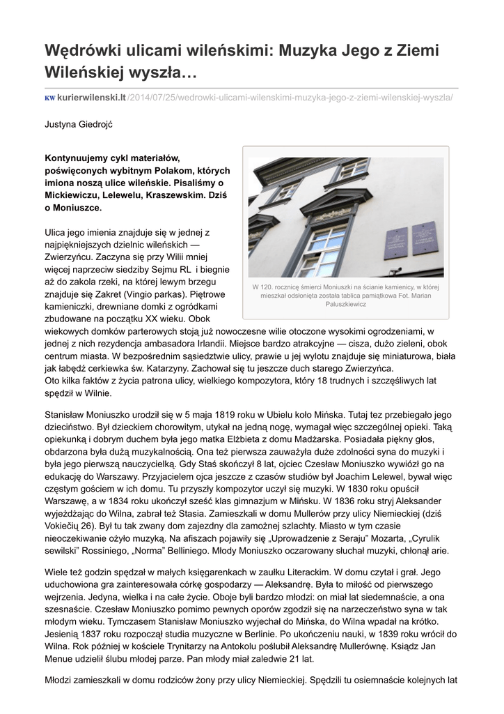 Wędrówki ulicami wileńskimi: Muzyka Jego z Ziemi Wileńskiej wyszła… kurierwilenski.lt /2014/07/25/wedrowki-ulicami-wilenskimi-muzyka-jego-z-ziemi-wilenskiej-wyszla/ Justyna Giedrojć Kontynuujemy cykl materiałów, poświęconych wybitnym Polakom, których imiona noszą ulice wileńskie. Pisaliśmy o Mickiewiczu, Lelewelu, Kraszewskim. Dziś o Moniuszce. Ulica jego imienia znajduje się w jednej z najpiękniejszych dzielnic wileńskich — Zwierzyńcu. Zaczyna się przy Wilii mniej więcej naprzeciw siedziby Sejmu RL i biegnie aż do zakola rzeki, na której lewym brzegu W 120. rocznicę śmierci Moniuszki na ścianie kamienicy, w której znajduje się Zakret (Vingio parkas). Piętrowe mieszkał odsłonięta została tablica pamiątkowa Fot. Marian Paluszkiewicz kamieniczki, drewniane domki z ogródkami zbudowane na początku XX wieku. Obok wiekowych domków parterowych stoją już nowoczesne wilie otoczone wysokimi ogrodzeniami, w jednej z nich rezydencja ambasadora Irlandii. Miejsce bardzo atrakcyjne — cisza, dużo zieleni, obok centrum miasta. W bezpośrednim sąsiedztwie ulicy, prawie u jej wylotu znajduje się miniaturowa, biała jak łabędź cerkiewka św. Katarzyny. Zachował się tu jeszcze duch starego Zwierzyńca. Oto kilka faktów z życia patrona ulicy, wielkiego kompozytora, który 18 trudnych i szczęśliwych lat spędził w Wilnie. Stanisław Moniuszko urodził się w 5 maja 1819 roku w Ubielu koło Mińska. Tutaj tez przebiegało jego dzieciństwo. Był dzieckiem chorowitym, utykał na jedną nogę, wymagał więc szczególnej opieki. Taką opiekunką i dobrym duchem była jego matka Elżbieta z domu Madżarska. Posiadała piękny głos, obdarzona była dużą muzykalnością. Ona też pierwsza zauważyła duże zdolności syna do muzyki i była jego pierwszą nauczycielką. Gdy Staś skończył 8 lat, ojciec Czesław Moniuszko wywiózł go na edukację do Warszawy. Przyjacielem ojca jeszcze z czasów studiów był Joachim Lelewel, bywał więc częstym gościem w ich domu. Tu przyszły kompozytor uczył się muzyki. W 1830 roku opuścił Warszawę, a w 1834 roku ukończył sześć klas gimnazjum w Mińsku. W 1836 roku stryj Aleksander wyjeżdżając do Wilna, zabrał też Stasia. Zamieszkali w domu Mullerów przy ulicy Niemieckiej (dziś Vokiečių 26). Był tu tak zwany dom zajezdny dla zamożnej szlachty. Miasto w tym czasie nieoczekiwanie ożyło muzyką. Na afiszach pojawiły się „Uprowadzenie z Seraju” Mozarta, „Cyrulik sewilski” Rossiniego, „Norma” Belliniego. Młody Moniuszko oczarowany słuchał muzyki, chłonął arie. Wiele też godzin spędzał w małych księgarenkach w zaułku Literackim. W domu czytał i grał. Jego uduchowiona gra zainteresowała córkę gospodarzy — Aleksandrę. Była to miłość od pierwszego wejrzenia. Jedyna, wielka i na całe życie. Oboje byli bardzo młodzi: on miał lat siedemnaście, a ona szesnaście. Czesław Moniuszko pomimo pewnych oporów zgodził się na narzeczeństwo syna w tak młodym wieku. Tymczasem Stanisław Moniuszko wyjechał do Mińska, do Wilna wpadał na krótko. Jesienią 1837 roku rozpoczął studia muzyczne w Berlinie. Po ukończeniu nauki, w 1839 roku wrócił do Wilna. Rok później w kościele Trynitarzy na Antokolu poślubił Aleksandrę Mullerównę. Ksiądz Jan Menue udzielił ślubu młodej parze. Pan młody miał zaledwie 21 lat. Młodzi zamieszkali w domu rodziców żony przy ulicy Niemieckiej. Spędzili tu osiemnaście kolejnych lat swojego życia, aż do wyjazdu do Warszawy. Doczekali się dziesięciorga dzieci. Posada organisty w kościele św. Janów i prywatne lekcje muzyki (płacono po rublu za godzinę) stanowiły źródło dochodów. Materialnie — głównie przysyłając produkty ze wsi — wspomagali młodych rodzice. Zachowały się ślady korespondencji. W jednym z listów matka pisała ze wsi, że wysłała do Wilna „dwie faski masła, bruśnice smażone na miodzie, po dziesięć indyków, gęsi, kaczek, pud grzybów suszonych”. Kilka lat później Moniuszko został dyrygentem w Teatrze Wileńskim. Skomponował wiele operetek i wodewili dla sceny wileńskiej, ponad 300 pieśni, cztery „Litanie Ostrobramskie”, wydawał „Śpiewniki domowe”. Ale kompozytor marzył o operze. Brak było jednak libretta. Nareszcie trafił mu się poemat Włodzimierza Wolskiego „Halszka”. Uznał, że stanie się on tematem libretta do opery „Halka”. Pisał ją z ogromną pasją i natchnieniem. Niestety Warszawa — pomimo obietnic — „Halki” nie wystawiła. Rozgoryczony Moniuszko pisał: „Po co zatem pisać opery, skoro Wilno ich wystawić nie może, a Warszawa nie chce!”. Reklama Ale Wilno chciało i na Nowy Rok 1848 odbyło się w Wilnie w salonie teściów skromne przedstawienie fragmentów „Halki”. Teatralna zaś premiera „Halki” odbyła się w Wilnie 16 lutego 1854 roku w gmachu obecnego Ratusza, w którym od 1845 roku był teatr. „Halka” i jej autor musieli czekać dziesięć lat od chwili napisania opery na warszawską premierę, która odbyła się dopiero w 1858 roku. Po premierze, w liście do żony Moniuszko pisał: „Powodzenie zupełne. Dziś grają »Halkę«, jutro, pojutrze… Mnie wybaczcie, że bez sensu piszę. Nie pojmuję, co się ze mną dzieje…”. Ulica Moniuszki na Zwierzyńcu Fot. Marian Paluszkiewicz Ogromne powodzenie opery przesądziło o wyprowadzce z Wilna. W tym też roku Moniuszko zostaje dyrygentem Opery Warszawskiej. Jego opery „Flis”, „Hrabina”, „Verbum nobile”, „Straszny dwór” weszły na zawsze do złotej skarbnicy muzyki polskiej. Zmarł w Warszawie 4 czerwca 1872 roku. Zaledwie miesiąc wcześniej skończył 54 lata. Kiedy Moniuszko zmarł, jego trumnę odprowadziło na Powązki 70 tysięcy osób, Warszawa wtedy liczyła około 350 tysięcy mieszkańców. Na wielkiej czerwonej płycie nagrobnej kompozytora wyryto tylko jedno słowo — „Moniuszko”. W Wilnie Moniuszko mieszkał przy u