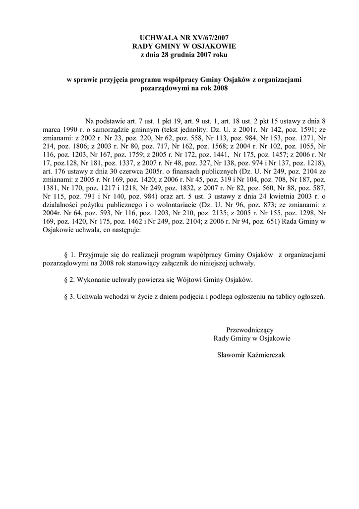 UCHWAŁA NR XV/67/2007 RADY GMINY W OSJAKOWIE z dnia 28