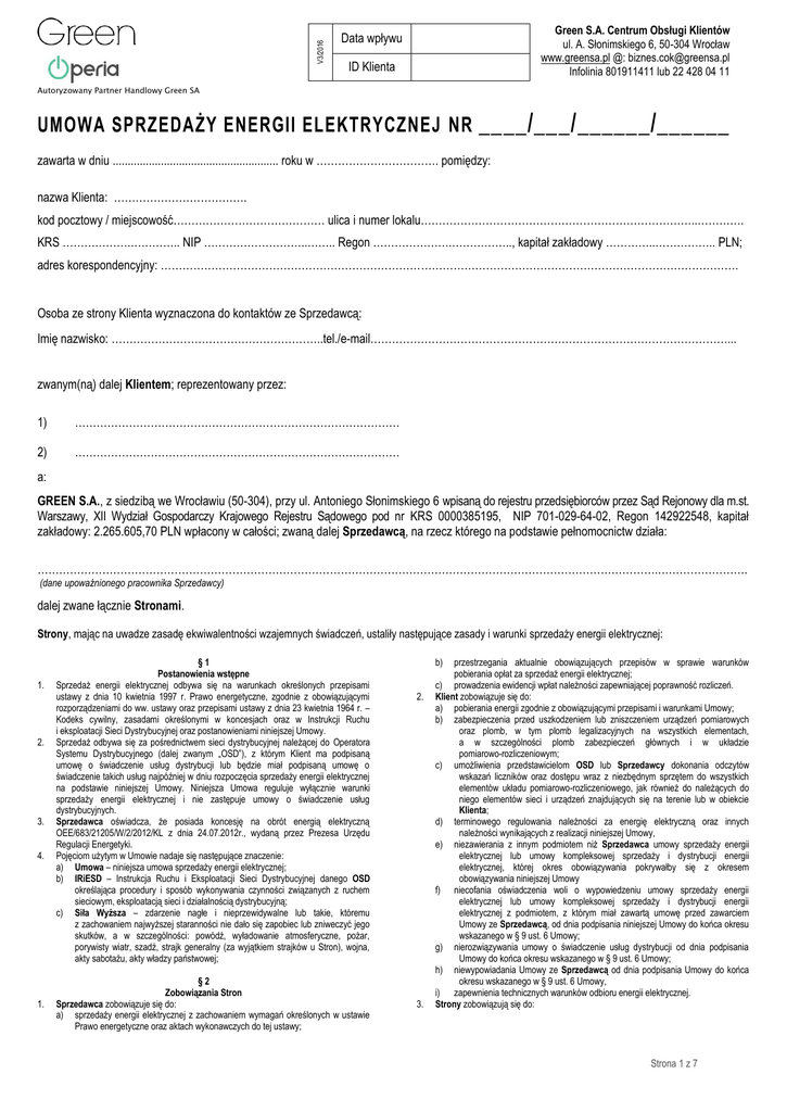 V3/2016 Green S.A. Centrum Obsługi Klientów ul. A. Słonimskiego 6, 50-304 Wrocław www.greensa.pl @: [email protected] Infolinia 801911411 lub 22 428 04 11 Data wpływu ID Klienta Autoryzowany Partner Handlowy Green SA UMOWA SPRZEDAŻY ENERGII ELEKTRYCZNEJ NR ____/___/______/______ zawarta w dniu ....................................................... roku w ……………………………. pomiędzy: nazwa Klienta: ………………………………. kod pocztowy / miejscowość…………………………………… ulica i numer lokalu…………………………………………………………………..…………. KRS ……………….………….. NIP ………………………..…….. Regon ………………….…………….., kapitał zakładowy …………..…………….. PLN; adres korespondencyjny: ……………………………………………………………………………………………………………………………………………. Osoba ze strony Klienta wyznaczona do kontaktów ze Sprzedawcą: Imię nazwisko: …………………………………………………..tel./e-mail………………………………………………………………………………………... zwanym(ną) dalej Klientem; reprezentowany przez: 1) ……………………………………………………………………………… 2) ……………………………………………………………………………… a: GREEN S.A., z siedzibą we Wrocławiu (50-304), przy ul. Antoniego Słonimskiego 6 wpisaną do rejestru przedsiębiorców przez Sąd Rejonowy dla m.st. Warszawy, XII Wydział Gospodarczy Krajowego Rejestru Sądowego pod nr KRS 0000385195, NIP 701-029-64-02, Regon 142922548, kapitał zakładowy: 2.265.605,70 PLN wpłacony w całości; zwaną dalej Sprzedawcą, na rzecz którego na podstawie pełnomocnictw działa: ……………………………………………………………………………………………………………………………………………………….……………………. (dane upoważnionego pracownika Sprzedawcy) dalej zwane łącznie Stronami. Strony, mając na uwadze zasadę ekwiwalentności wzajemnych świadczeń, ustaliły następujące zasady i warunki sprzedaży energii elektrycznej: 1. 2. 3. 4. 1. §1 Postanowienia wstępne Sprzedaż energii elektrycznej odbywa się na warunkach określonych przepisami ustawy z dnia 10 kwietnia 1997 r. Prawo energetyczne, zgodnie z obowiązującymi rozporządzeniami do ww. ustawy oraz przepisami ustawy z dnia 23 kwietnia 1964 r. – Kodeks cywilny, zasadami określonymi w koncesjach oraz w Instrukcji Ruchu i eksploatacji Sieci Dystrybucyjnej oraz postanowieniami niniejszej Umowy. Sprzedaż odbywa się za pośrednictwem sieci dystrybucyjnej należącej do Operatora Systemu Dystrybucyjnego (dalej zwanym „OSD”), z którym Klient ma podpisaną umowę o świadczenie usług dystrybucji lub będzie miał podpisaną umowę o świadczenie takich usług najpóźniej w dniu rozpoczęcia sprzedaży energii elektrycznej na podstawie niniejszej Umowy. Niniejsza Umowa reguluje wyłącznie warunki sprzedaży energii elektrycznej i nie zastępuje umowy o świadczenie usług dystrybucyjnych. Sprzedawca oświadcza, że posiada koncesję na obrót energią elektryczną OEE/683/21205/W/2/2012/KL z dnia 24.07.2012r., wydaną przez Prezesa Urzędu Regulacji Energetyki. Pojęciom użytym w Umowie nadaje się następujące znaczenie: a) Umowa – niniejsza umowa sprzedaży energii elektrycznej; b) IRiESD – Instrukcja Ruchu i Eksploatacji Sieci Dystrybucyjnej danego OSD określająca procedury i sposób wykonywania czynności związanych z ruchem sieciowym, eksploatacją sieci i działalnością dystrybucyjną; c) Siła Wyższa – zdarzenie nagłe i nieprzewidywalne lub takie, któremu z zachowaniem najwyższej staranności nie dało się zapobiec lub zniweczyć jego skutków, a w szczególności: powódź, wyładowanie atmosferyczne, pożar, porywisty wiatr, szadź, strajk generalny (za wyjątkiem strajków u Stron), wojna, akty sabotażu, akty władzy państwowej; §2 Zobowiązania Stron Sprzedawca zobowiązuje się do: a) sprzedaży energii elektrycznej z zachowaniem wymagań określonych w ustawie Prawo energetyczne oraz aktach wykonawczych do tej ustawy; b) 2. 3. przestrzegania aktualnie obowiązujących przepisów w sprawie warunków pobierania opłat za sprzedaż energii elektrycznej; c) prowadzenia ewidencji wpłat należności zapewniającej poprawność rozliczeń. Klient zobowiązuje się do: a) pobierania energii zgodnie z obowiązującymi przepisami i warunkami Umowy; b) zabezpieczenia przed uszkodzeniem lub zniszczeniem urządzeń pomiarowych oraz plomb, w tym plomb legalizacyjnych na wszystkich elementach, a w szczególności plomb zabezpieczeń głównych i w układzie pomiarowo-rozliczeniowym; c) umożliwienia przedstawicielom OSD lub Sprzedawcy dokonania odczytów wskazań liczników oraz dostępu wraz z niezbędnym sprzętem do wszystkich elementów układu pomiarowo-rozliczeniowego, jak również do należących do niego elementów sieci i urządzeń znajdujących się na terenie lub w obiekcie Klienta; d) terminowego regulowania należności za energię elektryczną oraz innych należności wynikających z realizacji niniejszej Umowy, e) niezawierania z innym podmiotem niż Sprzedawca umowy sprzedaży energii elektrycznej lub umowy kompleksowej sprzedaży i dystrybucji energii elektrycznej, której okres obowiązywania pokrywałby się z okresem obowiązywania niniejszej Umowy f) niecofania oświadczenia woli o wypowiedzeniu umowy sprzedaży energii elektrycznej lub umowy kompleksowej sprzedaży i dystrybucji energii elektrycznej z podmiotem, z którym miał zawartą umowę przed zawarciem Umowy ze Sprzedawcą, od dnia podpisania niniejszej Umowy do końca okresu wskazanego w § 9 ust. 6 Umowy; g) nierozwiązywania umowy o świa