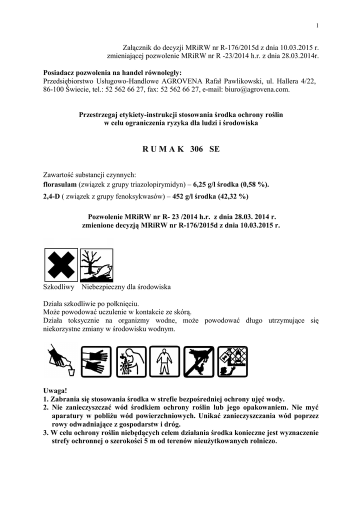 1 Załącznik do decyzji MRiRW nr R-176/2015d z dnia 10.03.2015 r. zmieniającej pozwolenie MRiRW nr R -23/2014 h.r. z dnia 28.03.2014r. Posiadacz pozwolenia na handel równoległy: Przedsiębiorstwo Usługowo-Handlowe AGROVENA Rafał Pawlikowski, ul. Hallera 4/22, 86-100 Świecie, tel.: 52 562 66 27, fax: 52 562 66 27, e-mail: [email protected]. Przestrzegaj etykiety-instrukcji stosowania środka ochrony roślin w celu ograniczenia ryzyka dla ludzi i środowiska R U M A K 306 SE Zawartość substancji czynnych: florasulam (związek z grupy triazolopirymidyn) – 6,25 g/l środka (0,58 %). 2,4-D ( związek z grupy fenoksykwasów) – 452 g/l środka (42,32 %) Pozwolenie MRiRW nr R- 23 /2014 h.r. z dnia 28.03. 2014 r. zmienione decyzją MRiRW nr R-176/2015d z dnia 10.03.2015 r. Szkodliwy Niebezpieczny dla środowiska Działa szkodliwie po połknięciu. Może powodować uczulenie w kontakcie ze skórą. Działa toksycznie na organizmy wodne, może powodować długo utrzymujące się niekorzystne zmiany w środowisku wodnym. Uwaga! 1. Zabrania się stosowania środka w strefie bezpośredniej ochrony ujęć wody. 2. Nie zanieczyszczać wód środkiem ochrony roślin lub jego opakowaniem. Nie myć aparatury w pobliżu wód powierzchniowych. Unikać zanieczyszczania wód poprzez rowy odwadniające z gospodarstw i dróg. 3. W celu ochrony roślin niebędących celem działania środka konieczne jest wyznaczenie strefy ochronnej o szerokości 5 m od terenów nieużytkowanych rolniczo . 2 I OPIS DZIAŁANIA Środek chwastobójczy w formie koncentratu stałych cząstek i małych kapsułek do rozcieńczania wodą, stosowany nalistnie, przeznaczony do wiosennego zwalczania jednorocznych i wieloletnich chwastów dwuliściennych w pszenicy ozimej, jęczmieniu ozimym, życie, pszenżycie ozimym, jęczmieniu jarym, pszenicy jarej, pszenżycie jarym, mieszankach zbożowych i w kukurydzy. Tarpan 306 SE jest herbicydem zawierającym dwie substancjeaktywne: florasulam oraz 2,4-D (tzn. w formie estru etyloheksylowego). Tarpan 306 SE jest herbicydem o działaniu układowym, pobierany jest przez liście chwastów, a następnie szybko przemieszczany w całej roślinie powodując jej deformację i zahamowanie wzrostu, co w efekcie powoduje zamieranie całego chwastu. Florasulam blokuje działanie enzymów podczas syntezy aminokwasów; 2,4D hamuje działanie hormonów roślinnych odpowiedzialnych za wzrost roślin oraz zakłóca proces rozwoju komórek. W warunkach optymalnych, to jest podczas ciepłej i wilgotnej pogody efekt działania środka Tarpan 306 SE jest szybszy, w warunkach niskich temperatur (około 5oC) całkowite zniszczenie chwastów następuje po około 3 tygodniach. Środek zwalcza chwasty, gdy minimalna temperatura dobowa w ciągu 6 dni po wykonaniu zabiegu wynosi powyżej 5 oC. Środek najskuteczniej niszczy chwasty znajdujące się w fazie 2-6 liści. Przytulię czepną zwalcza skutecznie do wysokości 20 cm, a chwasty rumianowate do wysokości 25 cm. Tarpan 306 SE skutecznie niszczy chwasty odporne na atrazynę np.: komosa biała, psianka czarna, szarłat szorstki. Chwasty wrażliwe : chaber bławatek, gorczyca polna, gwiazdnica pospolita, jasnota różowa, komosa biała, mak polny, maruna bezwonna, niezapominajka polna, przytulia czepna (do fazy 7-8 okółków), psianka czarna, rdest kolankowy, rdest powojowy, rumian polny, samosiewy rzepaku, stulicha psia, szarłat szorstki, tasznik pospolity, tobołki polne. Chwasty średnio wrażliwe: bratek polny, dymnica pospolita, ostrożeń polny, przetacznik bluszczykowy, przytulia czepna (od fazy 9 okółków). Chwasty średnio odporne: jasnota purpurowa. Chwasty odporne: czyściec błotny, krwawnik pospolity, chwasty jednoliścienne. II ZAKRES STOSOWANIA 1. ZBOŻA OZIME PSZENICA OZIMA, JĘCZMIEŃ OZIMY, PSZENŻYTO OZIME, ŻYTO Termin zabiegu: wiosną od fazy 2-3 liści do fazy drugiego kolanka. Zalecana dawka: 0,4-0,6 l/ha. 2. ZBOŻA JARE JĘCZMIEŃ JARY, PSZENICA JARA, ZBOŻOWE (Z WYŁĄCZENIEM OWSA) PSZENŻYTO Termin zabiegu: wiosną od fazy 2-3 liści do fazy drugiego kolanka. Zalecana dawka: 0,4-0,6 l/ha. Zalecana ilość wody: 200-300 l/ha. JARE, MIESZANKI 3 Zalecane opryskiwanie: średniokropliste. 3. KUKURYDZA Termin zabiegu: w fazie 2-6 liści kukurydzy. Zalecana dawka: 0,6 l/ha. W celu jednoczesnego zwalczania chwastów prosowatych i innych jednoliściennych można stosować: Tarpan 306 SE 0,6 l/ha + Titus 25 WG 30 – 60 g/ha + adiuwant Trend 90 EC w stężeniu 0,1%. W celu jednoczesnego zwalczenia perzu, chwastów prosowatych i innych chwastów jednoliściennych można stosować: Tarpan 306 SE 0,6 l/ha + Maister 310 WG 100-150 g/ha + adiuwant Actirob 842 EC 1,5 l/ha. Zalecana ilość wody: 200-400 l/ha. Zalecane opryskiwanie: średniokropliste. UWAGI: 1.W przypadku silnego zachwaszczenia oraz chwastów znajdujących się w fazie powyżej 6 liści (okółków) stosować dawkę 0,6 l/ha. 2.W przypadku występowania chwastów średnio wrażliwych stosować dawkę 0,6 l/ha. 3. Środek powoduje zahamowanie rozwoju roślin fiołka polnego i jasnot w danej fazie. Zniszczenie ocenia się wówczas do 80 % skuteczności po zastosowaniu dawki 0,6 l/ha. 4. W niesprzyjających warunkach pogodowych (np. susza), po kilku dniach od zastosowania, środek może spowodować na niektórych odmianach kukurydzy przemijające odbarwienia liści, które nie mają negatywnego wpływu na jakość i wielkość plonu. 5. Przed użyciem herbicydu Tarpan 306 SE i jego mieszanin z herbicydem Titus 25 WG i z herbicydem Maister 310 WG w kukurydzy należy skontaktować się z hodowcą odmiany lub producentem środka Tarpan 306 SE aby upewnić się czy uprawiana odmiana kukurydzy nie reaguje ujemnie na te herbicydy. 6. W przypadku stosowania mieszanin zbiornikowych należy stosować się do zaleceń stosowania wszystkich środków mieszanych. NASTĘPSTWO ROŚLIN Środek rozkłada się w glebie w ciągu okresu wegetacji nie stwarzając zagrożenia dla roślin uprawianych na
