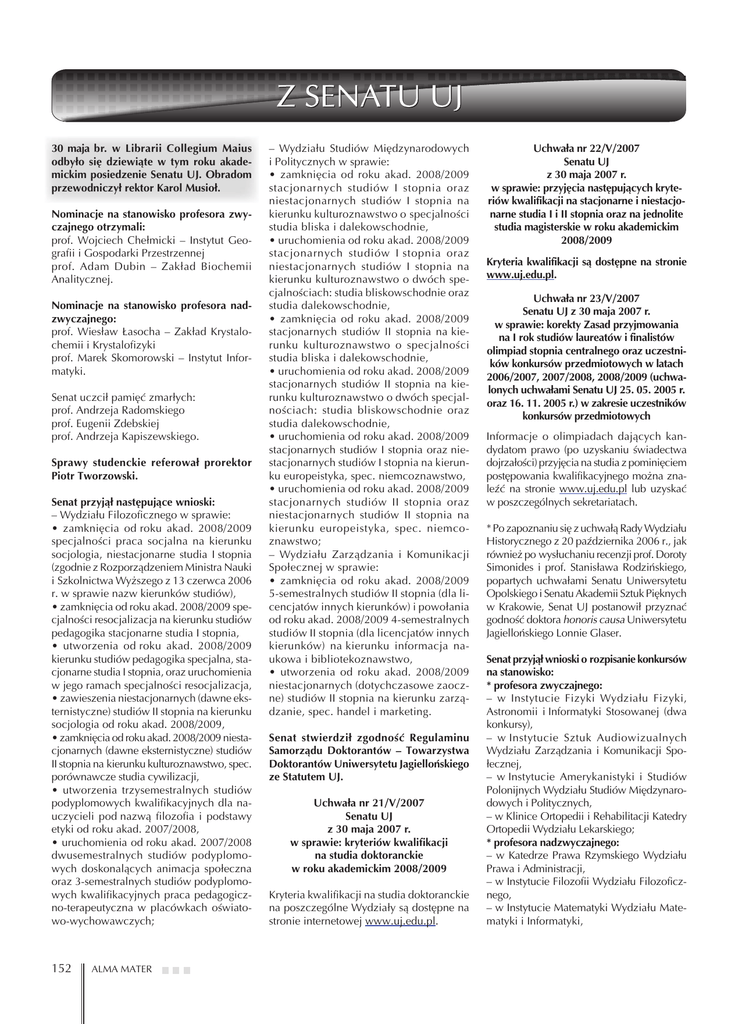 30 maja br. w Librarii Collegium Maius odbyło się dziewiąte w tym roku akademickim posiedzenie Senatu UJ. Obradom przewodniczył rektor Karol Musioł. Nominacje na stanowisko profesora zwyczajnego otrzymali: prof. Wojciech Chełmicki – Instytut Geografii i Gospodarki Przestrzennej prof. Adam Dubin – Zakład Biochemii Analitycznej. Nominacje na stanowisko profesora nadzwyczajnego: prof. Wiesław Łasocha – Zakład Krystalochemii i Krystalofizyki prof. Marek Skomorowski – Instytut Informatyki. Senat uczcił pamięć zmarłych: prof. Andrzeja Radomskiego prof. Eugenii Zdebskiej prof. Andrzeja Kapiszewskiego. Sprawy studenckie referował prorektor Piotr Tworzowski. Senat przyjął następujące wnioski: – Wydziału Filozoficznego w sprawie: • zamknięcia od roku akad. 2008/2009 specjalności praca socjalna na kierunku socjologia, niestacjonarne studia I stopnia (zgodnie z Rozporządzeniem Ministra Nauki i Szkolnictwa Wyższego z 13 czerwca 2006 r. w sprawie nazw kierunków studiów), • zamknięcia od roku akad. 2008/2009 specjalności resocjalizacja na kierunku studiów pedagogika stacjonarne studia I stopnia, • utworzenia od roku akad. 2008/2009 kierunku studiów pedagogika specjalna, stacjonarne studia I stopnia, oraz uruchomienia w jego ramach specjalności resocjalizacja, • zawieszenia niestacjonarnych (dawne eksternistyczne) studiów II stopnia na kierunku socjologia od roku akad. 2008/2009, • zamknięcia od roku akad. 2008/2009 niestacjonarnych (dawne eksternistyczne) studiów II stopnia na kierunku kulturoznawstwo, spec. porównawcze studia cywilizacji, • utworzenia trzysemestralnych studiów podyplomowych kwalifikacyjnych dla nauczycieli pod nazwą filozofia i podstawy etyki od roku akad. 2007/2008, • uruchomienia od roku akad. 2007/2008 dwusemestralnych studiów podyplomowych doskonalących animacja społeczna oraz 3-semestralnych studiów podyplomowych kwalifikacyjnych praca pedagogiczno-terapeutyczna w placówkach oświatowo-wychowawczych; 152 ALMA MATER – Wydziału Studiów Międzynarodowych i Politycznych w sprawie: • zamknięcia od roku akad. 2008/2009 stacjonarnych studiów I stopnia oraz niestacjonarnych studiów I stopnia na kierunku kulturoznawstwo o specjalności studia bliska i dalekowschodnie, • uruchomienia od roku akad. 2008/2009 stacjonarnych studiów I stopnia oraz niestacjonarnych studiów I stopnia na kierunku kulturoznawstwo o dwóch specjalnościach: studia bliskowschodnie oraz studia dalekowschodnie, • zamknięcia od roku akad. 2008/2009 stacjonarnych studiów II stopnia na kierunku kulturoznawstwo o specjalności studia bliska i dalekowschodnie, • uruchomienia od roku akad. 2008/2009 stacjonarnych studiów II stopnia na kierunku kulturoznawstwo o dwóch specjalnościach: studia bliskowschodnie oraz studia dalekowschodnie, • uruchomienia od roku akad. 2008/2009 stacjonarnych studiów I stopnia oraz niestacjonarnych studiów I stopnia na kierunku europeistyka, spec. niemcoznawstwo, • uruchomienia od roku akad. 2008/2009 stacjonarnych studiów II stopnia oraz niestacjonarnych studiów II stopnia na kierunku europeistyka, spec. niemcoznawstwo; – Wydziału Zarządzania i Komunikacji Społecznej w sprawie: • zamknięcia od roku akad. 2008/2009 5-semestralnych studiów II stopnia (dla licencjatów innych kierunków) i powołania od roku akad. 2008/2009 4-semestralnych studiów II stopnia (dla licencjatów innych kierunków) na kierunku informacja naukowa i bibliotekoznawstwo, • utworzenia od roku akad. 2008/2009 niestacjonarnych (dotychczasowe zaoczne) studiów II stopnia na kierunku zarządzanie, spec. handel i marketing. Senat stwierdził zgodność Regulaminu Samorządu Doktorantów – Towarzystwa Doktorantów Uniwersytetu Jagiellońskiego ze Statutem UJ. Uchwała nr 21/V/2007 Senatu UJ z 30 maja 2007 r. w sprawie: kryteriów kwalifikacji na studia doktoranckie w roku akademickim 2008/2009 Kryteria kwalifikacji na studia doktoranckie na poszczególne Wydziały są dostępne na stronie internetowej www.uj.edu.pl. Uchwała nr 22/V/2007 Senatu UJ z 30 maja 2007 r. w sprawie: przyjęcia następujących kryteriów kwalifikacji na stacjonarne i niestacjonarne studia I i II stopnia oraz na jednolite studia magisterskie w roku akademickim 2008/2009 Kryteria kwalifikacji są dostępne na stronie www.uj.edu.pl. Uchwała nr 23/V/2007 Senatu UJ z 30 maja 2007 r. w sprawie: korekty Zasad przyjmowania na I rok studiów laureatów i finalistów olimpiad stopnia centralnego oraz uczestników konkursów przedmiotowych w latach 2006/2007, 2007/2008, 2008/2009 (uchwalonych uchwałami Senatu UJ 25. 05. 2005 r. oraz 16. 11. 2005 r.) w zakresie uczestników konkursów przedmiotowych Informacje o olimpiadach dających kandydatom prawo (po uzyskaniu świadectwa dojrzałości) przyjęcia na studia z pominięciem postępowania kwalifikacyjnego można znaleźć na stronie www.uj.edu.pl lub uzyskać w poszczególnych sekretariatach. * Po zapoznaniu się z uchwałą Rady Wydziału Historycznego z 20 października 2006 r., jak również po wysłuchaniu recenzji prof. Doroty Simonides i prof. Stanisława Rodzińskiego, popartych uchwałami Senatu Uniwersytetu Opolskiego i Senatu Akademii Sztuk Pięknych w Krakowie, Senat UJ postanowił przyznać godność doktora honoris causa Uniwersytetu Jagiellońskiego Lonnie Glaser. Senat przyjął wnioski o rozpisanie konkursów na stanowisko: * profesora zwyczajnego: – w Instytucie Fizyki Wydziału Fizyki, Astronomii i Informatyki Stosowanej (dwa konkursy), – w Instytucie Sztuk Audiowizualnych Wydziału Zarządzania i Komunikacji Społecznej, – w Instytucie Amerykanistyki i Studiów Polonijnych Wydziału Studiów Międzynarodowych i Politycznych, – w Klinice Ortopedii i Rehabilitacji Katedry Ortopedii Wydziału Lekarskiego; * profesora nadzwyczajnego: – w Katedrze Prawa Rzymskiego Wydziału Prawa i Administracji, – w Instytucie Filozofii Wydziału Filozoficznego, – w Instytucie Matematyki Wydzi