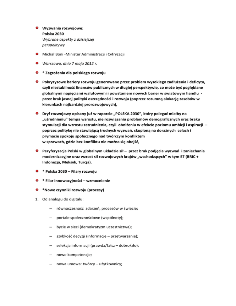 Wyzwania rozwojowe: Polska 2030 Wybrane aspekty z dzisiejszej perspektywy Michał Boni -Minister Administracji i Cyfryzacji Warszawa, dnia 7 maja 2012 r. * Zagrożenia dla polskiego rozwoju Pokryzysowe bariery rozwoju generowane przez problem wysokiego zadłużenia i deficytu, czyli niestabilność finansów publicznych w długiej perspektywie, co może być pogłębiane globalnymi napięciami walutowymi i powstaniem nowych barier w światowym handlu przez brak jasnej polityki oszczędności i rozwoju (poprzez rozumną alokację zasobów w kierunkach najbardziej prorozwojowych), Dryf rozwojowy opisany już w raporcie „POLSKA 2030”, który polegać miałby na „uśrednieniu” tempa wzrostu, nie rozwiązaniu problemów demograficznych oraz braku stymulacji dla wzrostu zatrudnienia, czyli obniżeniu w efekcie poziomu ambicji i aspiracji – poprzez politykę nie stawiającą trudnych wyzwań, skupioną na doraźnych celach i prymacie spokoju społecznego nad twórczym konfliktem w sprawach, gdzie bez konfliktu nie można się obejść, Peryferyzacja Polski w globalnym układzie sił – przez brak podjęcia wyzwań i zaniechania modernizacyjne oraz wzrost sił rozwojowych krajów „wschodzących” w tym E7 (BRIC + Indonezja, Meksyk, Turcja). * Polska 2030 – Filary rozwoju * Filar innowacyjności – wzmocnienie *Nowe czynniki rozwoju (procesy) 1. Od analogu do digitalu: – równoczesność zdarzeń, procesów w świecie; – portale społecznościowe (wspólnoty); – bycie w sieci (demokratyzm uczestnictwa); – szybkość decyzji (informacje – przetwarzanie); – selekcja informacji (prawda/fałsz – dobro/zło); – nowe kompetencje; – nowa umowa: twórcy – użytkownicy; – przejrzystość uzgadniania rozwiązań (nowego prawa) w relacji władza: partnerzy – interesariusze (decyzje, stanowienie prawa, konsultacje). 2. Nowe generacje a postulat nowego obywatelstwa: – międzypokoleniowe zmiany społeczne (luka, konflikt, solidarność); – aspiracje społeczne (nowy konsumizm: mieć, aby być); – wolność – Internet jako dom, możliwość wyboru; – uczestnictwo (demokracja partycypacyjna); – wpływ na rzeczywistość (kontakty on line); – open government; – nie tylko dla obywatela, ale z obywatelem. 3. Model „państwa optimum”: – selektywna interwencja; – nierówność: od dochodów do dostępu; – rząd – samorząd (nowa harmonia). *Państwo optimum Uniknąć nadmiaru państwa (zbyt opiekuńcze, zbyt regulujące); Uniknąć modelu „państwa minimum”; Nowa definicja odpowiedzialności i interwencji; Interwencja w sferze „DOSTĘPU”; Zmiana modelu przeciwdziałania nierównościom: od problemu „dochodów” do problemu „dostępu”; Dobra publiczne (dostęp): edukacja, zdrowie, zabezpieczenie na starość, Internet (szerzej: wiedza i kultura); Równowaga własności i wolności; „Chwytanie” zmian cywilizacyjnych; Władza publiczna: rząd – samorząd (dawna synergia, potencjalny konflikt, harmonia kooperacji). *Modele państwa / obywatelskości *Kompetencje XXI wieku *Cyfrowa szkoła, cyfrowe otoczenie Źródło: Wiered.com *Pozycja samorządu w administracji publicznej Samorząd terytorialny stanowi integralną część administracji publicznej i jest podstawowym podmiotem zajmującym się wykonywaniem zadań publicznych, w związku z tym zamierzamy podnieść jego rangę w zarządzaniu publicznym. Po ponad 20 latach od wprowadzenia samorządu terytorialnego stoimy przed zadaniem przeprowadzenia rzetelnej i systemowej debaty na temat kondycji ustrojowej samorządu. *Sprawne Państwo a samorząd MAC będzie podmiotem odpowiedzialnym za realizację Strategii Sprawne Państwo: Doskonalenie ustroju terytorialnego: zwiększenia efektywności realizacji zadań publicznych; usprawnienie mechanizmów współpracy między jst. Racjonalny podział terytorialny państwa: ocena skuteczności działań urzędów; zwiększenie zachęt do łączenia w większej jednostki jst. *Polityka miejska i ustawa metropolitalna XXI wiek należy do metropolii. Obszary metropolitalne są podstawowymi ośrodkami wzrostu, co wynika także z krajowych dokumentów strategicznych – Polska 2030, KPZK. W związku z tym zamierzamy: Przeprowadzić debatę i wypracować rozwiązania ustrojowe dot. obszarów metropolitalnych (przygotowanie Zielonej Księgi dot. debaty metropolitalnej); Razem z MRR podjąć działania na rzecz wprowadzenia Krajowej Polityki Miejskiej. *Rozwój sieci metropolitalnej (decyzja nr 18 - DSRK Polska 2030) Przyjąć rozwiązania prawne i organizacyjne do 2015 r. przyspieszające integrację sieci metropolitalnej i wzrost potencjału rozwojowego, kreatywnego i innowacyjnego metropolii, a także zwiększające spójność otaczającej je przestrzeni metropolitarnej i krąg ich oddziaływania regionalnego, dotyczących dziedzin innowacji, komunikacji, podatków (większy udział miast w wpływach z podatków), inwestycji, usług dla obywateli. *Propozycje OECD dot. struktur metropolitalnych (Zielona Księga – debata) *Struktury organizacyjne metropolii (Zielona Księga – debata) *Finanse samorządowe Realizacja zasady decentralizacji władzy wymaga większej swobody finansowej jst: Uelastycznienie wydatków jst; Zmiany w prawie umożliwiające oszczędności, np. w zamówieniach publicznych; Nowe źródła dochodów jst bez pogorszenia sytuacji budżetowej państwa; Budżet partycypacyjny – projekt pilotażowy. *Nowe relacje rząd-samorząd Skuteczne i sprawne zarządzanie usługami publicznymi wymaga systematycznej współpracy pomiędzy szczeblem rządowym i samorządowym, dlatego zamierzamy: Systematycznie prowadzić konsultacje z korporacjami samorządowymi (co kwartał) na temat bieżącego funkcjonowania; MAC jako rzecznik jst w rządzie, samorząd jako rzecznik reform w kraju; Realistyczne projekty reform pod kątem możliwości finansowych budżetu państwa i jst. Dlaczego wciąż się nie udaje… brak koordynacji projektów 