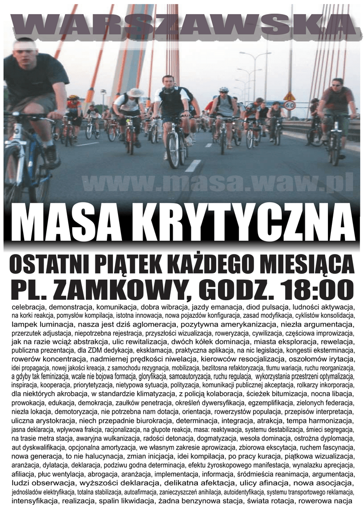 WARSZAWSKA www.masa.waw.pl MASA KRYTYCZNA OSTATNI PIĄTEK KAŻDEGO MIESIĄCA PL. ZAMKOWY, GODZ. 18:00 celebracja, demonstracja, komunikacja, dobra wibracja, jazdy emanacja, diod pulsacja, ludności aktywacja, na korki reakcja, pomysłów kompilacja, istotna innowacja, nowa pojazdów konfiguracja, zasad modyfikacja, cyklistów konsolidacja, lampek luminacja, nasza jest dziś aglomeracja, pozytywna amerykanizacja, niezła argumentacja, przerzutek adjustacja, niepotrzebna rejestracja, przyszłości wizualizacja, roweryzacja, cywilizacja, częściowa improwizacja, jak na razie wciąż abstrakcja, ulic rewitalizacja, dwóch kółek dominacja, miasta eksploracja, rewelacja, publiczna prezentacja, dla ZDM dedykacja, eksklamacja, praktyczna aplikacja, na nic legislacja, kongestii eksterminacja, rowerów koncentracja, nadmiernej prędkości niwelacja, kierowców resocjalizacja, oszołomów irytacja, idei propagacja, nowej jakości kreacja, z samochodu rezygnacja, mobilizacja, bezlitosna refaktoryzacja, tłumu wariacja, ruchu reorganizacja, a gdyby tak feminizacja, wcale nie bojowa formacja, gloryfikacja, samoautoryzacja, ruchu regulacja, wykorzystania przestrzeni optymalizacja, inspiracja, kooperacja, priorytetyzacja, nietypowa sytuacja, polityzacja, komunikacji publicznej akceptacja, rolkarzy inkorporacja, dla niektórych akrobacja, w standardzie klimatyzacja, z policją kolaboracja, ścieżek bitumizacja, nocna libacja, prowokacja, edukacja, demokracja, zaułków penetracja, określeń dywersyfikacja, egzemplifikacja, zielonych federacja, niezła lokacja, demotoryzacja, nie potrzebna nam dotacja, orientacja, rowerzystów populacja, przepisów interpretacja, uliczna arystokracja, niech przepadnie biurokracja, determinacja, integracja, atrakcja, tempa harmonizacja, jasna deklaracja, wpływowa frakcja, racjonalizacja, na głupote reakcja, masa: reaktywacja, systemu destabilizacja, śmieci segregacja, na trasie metra stacja, awaryjna wulkanizacja, radości detonacja, dogmatyzacja, wesoła dominacja, ostrożna dyplomacja, aut dyskwalifikacja, opcjonalna amortyzacja, we własnym zakresie aprowizacja, zbiorowa ekscytacja, ruchem fascynacja, nowa generacja, to nie halucynacja, zmian inicjacja, idei kompilacja, po pracy kuracja, piątkowa wizualizacja, aranżacja, dylatacja, deklaracja, podziwu godna determinacja, efektu żyroskopowego manifestacja, wynalazku aprecjacja, afiliacja, płuc wentylacja, abrogacja, aranżacja, implementacja, informacja, śródmieścia reanimacja, argumentacja, ludzi obserwacja, wyższości deklaracja, delikatna afektacja, ulicy afinacja, nowa asocjacja, jednośladów elektryfikacja, totalna stabilizacja, autoafirmacja, zanieczyszczeń anihilacja, autoidentyfikacja, systemu transportowego reklamacja, intensyfikacja, realizacja, spalin likwidacja, żadna benzynowa stacja, świata rotacja, rowerowa nacja