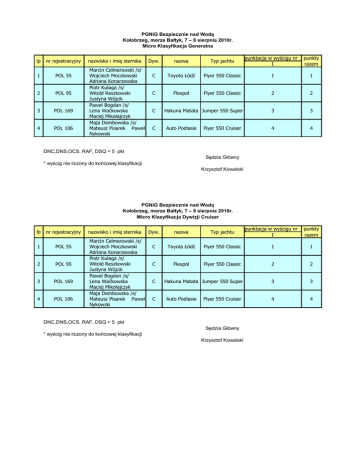 PGNiG Bezpiecznie nad Wodą Kołobrzeg, morze Bałtyk, 7 – 8 sierpnia 2010r. Micro Klasyfikacja Generalna lp nr rejestracyjny 1 POL 55 2 POL 95 3 POL 169 4 POL 106 nazwisko i imię sternika Marcin Celmerowski /s/ Wojciech Moczkowski Adriana Konarzewska Piotr Kułaga /s/ Witold Reszkowski Justyna Wójcik Paweł Bogdan /s/ Lena Waćkowska Maciej Mikołajczyk Maja Dembowska /s/ Mateusz Pisarek Paweł Nykowski punktacja w wyścigu nr I punkty razem Dyw. nazwa Typ jachtu C Toyota Łódź Flyer 550 Classic 1 1 C Flexpol Flyer 550 Classic 2 2 3 3 4 4 C C Hakuna Matata Jumper 550 Super Auto Podlasie Flyer 550 Cruiser DNC,DNS,OCS, RAF, DSQ = 5 pkt Sędzia Główny * wyścig nie liczony do końcowej klasyfikacji Krzysztof Kowalski PGNiG Bezpiecznie nad Wodą Kołobrzeg, morze Bałtyk, 7 – 8 sierpnia 2010r. Micro Klasyfikacja Dywizji Cruiser lp nr rejestracyjny 1 POL 55 2 POL 95 3 POL 169 4 POL 106 nazwisko i imię sternika Marcin Celmerowski /s/ Wojciech Moczkowski Adriana Konarzewska Piotr Kułaga /s/ Witold Reszkowski Justyna Wójcik Paweł Bogdan /s/ Lena Waćkowska Maciej Mikołajczyk Maja Dembowska /s/ Mateusz Pisarek Paweł Nykowski punktacja w wyścigu nr I punkty razem Dyw. nazwa Typ jachtu C Toyota Łódź Flyer 550 Classic 1 1 C Flexpol Flyer 550 Classic 2 2 3 3 4 4 C C Hakuna Matata Jumper 550 Super Auto Podlasie Flyer 550 Cruiser DNC,DNS,OCS, RAF, DSQ = 5 pkt Sędzia Główny * wyścig nie liczony do końcowej klasyfikacji Krzysztof Kowalski
