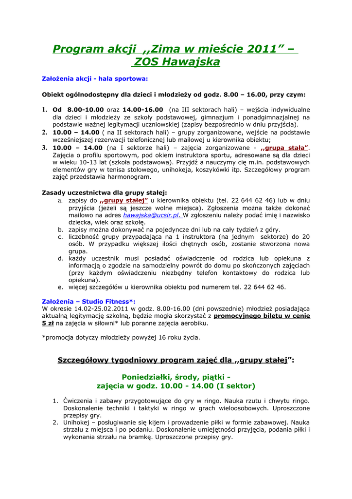 Program akcji ,,Zima w mieście 2011” – ZOS Hawajska Założenia akcji - hala sportowa: Obiekt ogólnodostępny dla dzieci i młodzieży od godz. 8.00 – 16.00, przy czym: 1. Od 8.00-10.00 oraz 14.00-16.00 (na III sektorach hali) – wejścia indywidualne 2. 3. dla dzieci i młodzieży ze szkoły podstawowej, gimnazjum i ponadgimnazjalnej na podstawie ważnej legitymacji uczniowskiej (zapisy bezpośrednio w dniu przyjścia). 10.00 – 14.00 ( na II sektorach hali) – grupy zorganizowane, wejście na podstawie wcześniejszej rezerwacji telefonicznej lub mailowej u kierownika obiektu; 10.00 – 14.00 (na I sektorze hali) – zajęcia zorganizowane - ,,grupa stała”. Zajęcia o profilu sportowym, pod okiem instruktora sportu, adresowane są dla dzieci w wieku 10-13 lat (szkoła podstawowa). Przyjdź a nauczymy cię m.in. podstawowych elementów gry w tenisa stołowego, unihokeja, koszykówki itp. Szczegółowy program zajęć przedstawia harmonogram. Zasady uczestnictwa dla grupy stałej: a. zapisy do ,,grupy stałej” u kierownika obiektu (tel. 22 644 62 46) lub w dniu przyjścia (jeżeli są jeszcze wolne miejsca). Zgłoszenia można także dokonać mailowo na adres [email protected]. W zgłoszeniu należy podać imię i nazwisko dziecka, wiek oraz szkołę. b. zapisy można dokonywać na pojedyncze dni lub na cały tydzień z góry. c. liczebność grupy przypadająca na 1 instruktora (na jednym sektorze) do 20 osób. W przypadku większej ilości chętnych osób, zostanie stworzona nowa grupa. d. każdy uczestnik musi posiadać oświadczenie od rodzica lub opiekuna z informacją o zgodzie na samodzielny powrót do domu po skończonych zajęciach (przy każdym oświadczeniu niezbędny telefon kontaktowy do rodzica lub opiekuna). e. więcej szczegółów u kierownika obiektu pod numerem tel. 22 644 62 46. Założenia – Studio Fitness*: W okresie 14.02-25.02.2011 w godz. 8.00-16.00 (dni powszednie) młodzież posiadająca aktualną legitymację szkolną, będzie mogła skorzystać z promocyjnego biletu w cenie 5 zł na zajęcia w siłowni* lub poranne zajęcia aerobiku. *promocja dotyczy młodzieży powyżej 16 roku życia. Szczegółowy tygodniowy program zajęć dla ,,grupy stałej”: Poniedziałki, środy, piątki zajęcia w godz. 10.00 - 14.00 (I sektor) 1. Ćwiczenia i zabawy przygotowujące do gry w ringo. Nauka rzutu i chwytu ringo. Doskonalenie techniki i taktyki w ringo w grach wieloosobowych. Uproszczone przepisy gry. 2. Unihokej – posługiwanie się kijem i prowadzenie piłki w formie zabawowej. Nauka strzału z miejsca i po podaniu. Doskonalenie umiejętności przyjęcia, podania piłki i wykonania strzału na bramkę. Uproszczone przepisy gry. 3. Tenis stołowy – oswajanie z rakietką i piłeczką w formie zabaw sportowych. Nauka i doskonalenie podstawowych uderzeń z bekhendu i forhendu, nauka serwisu. Mini gry i turnieje. Przepisy gry. Wtorki i czwartki – zajęcia w godz. 10.00 - 14.00 (I sektor) 1. Nauczanie oraz doskonalenie uderzenia i przyjęcia piłki wewnętrzną częścią stopy oraz wewnętrznym podbiciem. Strzały na bramkę. Doskonalenie techniki przyjęcia i podania piłki wewnętrzna częścią stopy w grach i zabawach ruchowych. Mini gra w piłkę nożną. Przepisy gry. 2. Zajęcia taneczne przy muzyce z instruktorem w godz. 10.00-11.30.? 3. Nauka i doskonalenie przewrotu w przód, nauka i doskonalenie skoku rozkrocznego przez kozła. Proste układy gimnastyczne. 4. Nauka i doskonalenie podań i chwytów w koszykówce, nauka i doskonalenie kozłowania piłki oraz dwutaktu. Mini gry. Przepisy gry. Zajęcia taneczne z instruktorem odbywają się w poniedziałki, środy i piątki w godz. 10.00-11.00 na sali aerobowej. Zajęcia są skierowane głównie do grup zorganizowanych. Zajęcia odbywać się będą wyłącznie, jeśli zostaną poprzedzone rezerwacją terminu przez opiekuna grupy (minimum 10 osób, maksymalnie 25 osób). Zapisy na zajęcia odbywają się codziennie w godz. 8.00-16.00, podczas trwania akcji ,,Zima w mieście”, telefonicznie (22 644 62 46) lub mailowo [email protected] u kierownika obiektu.