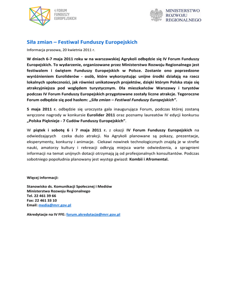 Siła zmian – Festiwal Funduszy Europejskich Informacja prasowa, 20 kwietnia 2011 r. W dniach 6-7 maja 2011 roku w na warszawskiej Agrykoli odbędzie się IV Forum Funduszy Europejskich. To wydarzenie, organizowane przez Ministerstwo Rozwoju Regionalnego jest festiwalem i świętem Funduszy Europejskich w Polsce. Zostanie ono poprzedzone wyróżnieniem Euroliderów - osób, które wykorzystując unijne środki działają na rzecz lokalnych społeczności, jak również unikatowych projektów, dzięki którym Polska staje się atrakcyjniejsza pod względem turystycznym. Dla mieszkańców Warszawy i turystów podczas IV Forum Funduszy Europejskich przygotowane zostały liczne atrakcje. Tegoroczne Forum odbędzie się pod hasłem: „Siła zmian – Festiwal Funduszy Europejskich”. 5 maja 2011 r. odbędzie się uroczysta gala inaugurująca Forum, podczas której zostaną wręczone nagrody w konkursie Eurolider 2011 oraz poznamy laureatów IV edycji konkursu „Polska Pięknieje - 7 Cudów Funduszy Europejskich”. W piątek i sobotę 6 i 7 maja 2011 r. z okazji IV Forum Funduszy Europejskich na odwiedzających czeka dużo atrakcji. Na Agrykoli planowane są pokazy, prezentacje, eksperymenty, konkursy i animacje. Ciekawi nowinek technologicznych znajdą je w strefie nauki, amatorzy kultury i rekreacji odkryją miejsca warte odwiedzenia, a spragnieni informacji na temat unijnych dotacji otrzymają ją od profesjonalnych konsultantów. Podczas sobotniego popołudnia planowany jest występ gwiazd: Kombii i Afromental. Więcej informacji: Stanowisko ds. Komunikacji Społecznej i Mediów Ministerstwa Rozwoju Regionalnego Tel. 22 461 39 66 Fax: 22 461 33 10 Email: [email protected] Akredytacje na IV FFE: [email protected] Program IV Forum Funduszy Europejskich (część oficjalna i otwarta) Część oficjalna: 5 maja 2011 (czwartek) – Pałac Kultury i Nauki: Gala wręczenia nagród laureatom konkursów EUROLIDER 2011 i Polska Pięknieje - 7 Cudów Funduszy Europejskich (godz. 14.00) Odsłonięcie wystawy „Polska Pięknieje” (godz. 16.30) 6 maja 2011 (piątek) – hotel Novotel Centrum: PANEL I - „Polityka spójności dziś i jutro – sukcesy i porażki”(godz. 10.00) PANEL II - „Partnerstwo i dialog jako podstawa skutecznej polityki spójności” (godz. 14.00) Część otwarta: 6-7 maja 2011 roku, Agrykola Na warszawskiej Agrykoli w godzinach od 11.00 do 18.00 przewidziane są specjalne atrakcje dla mieszkańców Warszawy i turystów. Będzie to m.in.: 100 wystawców z całej Polski, reprezentujących instytucje i beneficjentów realizujących projekty unijne, Centrum informacyjne dla wszystkich, którzy chcą się dowiedzieć, kto i na co może jeszcze uzyskać unijne wsparcie oraz jak to zrobić. Doświadczeni konsultanci z Centralnego Punktu Informacyjnego będą do dyspozycji zwiedzających przez obydwa dni, Interaktywna edukacja, czyli różnorodne strefy tematyczne z pewnością zainteresują dzieci i młodzież, a każdy, niezależnie od wieku znajdzie w nich coś ciekawego dla siebie. Planujemy lekcje europejskie, doświadczenia w strefie nauki, naukę tańca, konkursy oraz pokazy pierwszej pomocy. W sobotę, na pożegnanie z miasteczkiem europejskim wielki finał i dwie gwiazdy polskiej muzyki – Afromental i Kombii. Szczegółowe informacje znajdują się na stronie: www.funduszeeuropejskie.gov.pl/4FFE