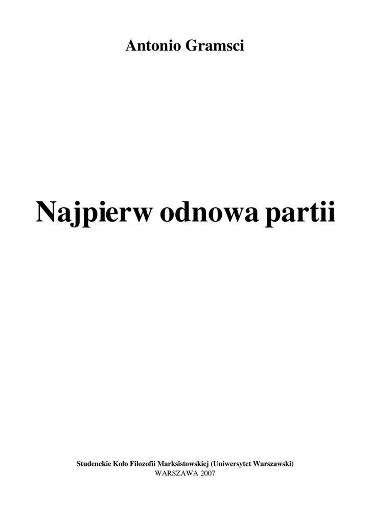 Antonio Gramsci Najpierw odnowa partii Studenckie Koło Filozofii Marksistowskiej (Uniwersytet Warszawski) WARSZAWA 2007 Antonio Gramsci – Najpierw odnowa partii (1920 rok) Artykuł Antonio Gramsciego „Najpierw odnowa partii” ukazał się bez podpisu w piśmie „L'Ordine Nuovo” I, nr 35 z 2431 stycznia 1920 r., w rubryce „Tydzień w polityce”. Podstawa niniejszego wydania: Antonio Gramsci, „Pisma wybrane”, tom 1, wyd. Książka i Wiedza, Warszawa 1961. Tłumaczenie z języka włoskiego: Barbara Sieroszewska. – 2 – © Studenckie Koło Filozofii Marksistowskiej (UW) www.skfmuw.w.pl Antonio Gramsci – Najpierw odnowa partii (1920 rok) Partia Socjalistyczna jest partią robotników i biednych chłopów. Powstała ona na gruncie demokracji liberalnej (na gruncie konkurencji politycznej, będącej odbiciem procesu rozwoju kapitalistycznego) jako jedna z sił społecznych dążących do stworzenia sobie bazy dla objęcia rządów i zdobycia władzy w państwie po to, aby obrócić tę władzę na własną korzyść. Zadanie partii polega na zorganizowaniu robotników i biednych chłopów w klasę panującą, na badaniu i tworzeniu warunków sprzyjających zaprowadzeniu demokracji proletariackiej. Włoska Partia Socjalistyczna potrafiła spełnić najłatwiejszą i najbardziej elementarną część jej historycznego zadania. Udało jej się poruszyć masy aż do ich najgłębszych warstw, udało się jej skupić uwagę ludu pracującego na programie rewolucji i państwa robotniczego, udało się jej stworzyć aparat rządowy obejmujący trzy miliony obywateli, który – w razie skonsolidowania się i zmaterializowania w postaci trwałych instytucji rewolucyjnych – wystarczyłby do zdobycia władzy państwowej. Ale Partii Socjalistycznej nie powiodło się spełnienie najważniejszych części jej historycznego zadania: nie udało jej się nadać trwałych i mocnych form aparatowi, który potrafiła stworzyć dzięki poruszeniu mas. Nie potrafiła iść naprzód, tym samym więc popadła w kryzys, w letarg. Stworzony w celu zdobycia władzy, pomyślany jako skupienie sił bojowych gotowych do bitwy, aparat rządowy Partii Socjalistycznej kruszy się i rozprzęga. Partia z każdym dniem traci kontakt z rozkołysanymi szerokimi masami. Następują ważne wydarzenia, a partia nie bierze w nich udziału; kraj wstrząsany jest dreszczem gorączki, rozkładowe siły demokracji burżuazyjnej i ustroju kapitalistycznego nie zaprzestają swego nieubłaganego, bezlitosnego działania, a partia nie interweniuje, nie oświeca szerokich mas robotniczych i chłopskich, nie usprawiedliwia ani tego, co robi, ani tego, czego nie robi, nie rzuca haseł, które uspokoiłyby niecierpliwość i powstrzymały demoralizację, które utrzymałyby zwartość w szeregach armii robotniczej i chłopskiej. Partia, która stała się największą historyczną siłą narodu włoskiego, popadła w kryzys infantylizmu politycznego i jest dzisiaj najsłabszym elementem społecznym narodu włoskiego. Nic dziwnego, że w tak sprzyjających warunkach bakcyle rozbicia sił rewolucyjnych – oportunistyczny i reformistyczny nihilizm oraz pseudorewolucyjna frazeologia anarchistyczna (dwa aspekty tendencji drobnomieszczańskiej) – mnożą się i rozwijają z ogromną szybkością. Międzynarodowe i narodowe warunki rewolucji proletariackiej coraz jaśniej i wyraźniej rysują się i konsolidują. I oto właśnie w momencie, który mógłby być momentem decydującym, Partia Socjalistyczna – najpotężniejsze narzędzie włoskiej rewolucji proletariackiej – rozpada się, atakowana i usidlana podstępnie przez parlamentarnych politykierów i funkcjonariuszy Konfederacji Pracy, przez osobników domagających się władzy przedstawicielskiej, mimo że nie ma ona poważnej i konkretnej podstawy, mimo że opiera się ona na nieporozumieniu, na braku ciągłości działania i na tchórzostwie umysłowym, które cechują zarówno robotników, jak i wszystkich pozostałych Włochów. A ze strony komunistów, ze strony rewolucjonistów, ze strony ośrodków kierowniczych mianowanych przez rewolucyjną większość nie widać żadnych prób wspólnej akcji, która by położyła tamę temu rozkładowi, uzdrowiła partię, dopomogła jej odzyskać zwartość wewnętrzną, która wdrożyłaby ją jako jedną z sekcji III Międzynarodówki w światowy system sił rewolucyjnych rzeczywiście dążących do realizacji tez komunizmu. Siła oporu bloku imperialistycznego, który zdołał podporządkować świat kilku kasom pancernym, została złamana i rozproszona dzięki militarnym zwycięstwom robotniczego państwa rosyjskiego. System międzynarodowej rewolucji proletariackiej, utwierdzony przez istnienie robotniczego państwa rosyjskiego i jego rozwój jako potęgi światowej, posiada dzisiaj armię dwu milionów bagnetów, armię pełną bojowego zapału, bo zwycięską i świadomą tego, że jest bohaterką historii współczesnej. Zwycięstwa i postępy armii III Międzynarodówki wstrząsają podstawami ustroju kapitalistycznego, przyspieszają proces rozkładu państw burżuazyjnych, zaostrzają konflikty w łonie demokracji zachodnich. Anglicy niepokoją się o Indie, Turcję, Persję, Afganistan i Chiny, w których mnożą się – 3 – © Studenckie Koło Filozofii Marksistowskiej (UW) www.skfmuw.w.pl Antonio Gramsci – Najpierw odnowa partii (1920 rok) ogniska rewolty, i przy pomocy lekkiej presji zmuszają Clemenceau do usunięcia się z areny politycznej. Upadek antybolszewickiego straszaka ujawnia natychmiast pęknięcia w reakcyjnym bloku francuskim i zapoczątkowuje rozprzężenie państwa politycznego. W ruchu robotniczym natomiast wzmagają się tendencje nieprzejednania komunistycznego. Zagadnienie rosyjskie powoduje ścieranie się oportunizmu Lloyd George'a z nieprzejednanym kontrrewolucjonizmem Winstona Churchilla, ale teren brytyjskiej demokracji, to znakomite niegdyś pole działania dla radykaln