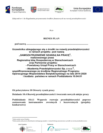 Załącznik nr 1 do Regulaminu przyznawania środków finansowych na rozwój przedsiębiorczości Wzór BIZNES PLAN pod nazwą ...................................................................................................... Uczestnika ubiegającego się o środki na rozwój przedsiębiorczości w ramach projektu pod nazwą „SAMOZATRUDNIENIE SZANSĄ NA PRACĘ1, realizowanego przez Regionalną Izbę Gospodarczą w Starachowicach oraz Partnerów projektu: - Powiatowy Urząd Pracy w Starachowicach - Akademię Przedsiębiorczości Sp. z o.o.2, współfinansowanego ze środków Regionalnego Programu Operacyjnego Województwa Świętokrzyskiego na lata 2014-2020 i budżetu państwa w ramach Poddziałania 10.04.01 Oś priorytetowa 10 Otwarty rynek pracy Działanie 10.4 Rozwój przedsiębiorczości i tworzenie nowych miejsc pracy Poddziałanie zastosowanie konkursowe) 1Należy podać 2Należy podać 10.4.1 Wsparcie rozwoju przedsiębiorczości poprzez instrumentów zwrotnych i bezzwrotnych (projekty nazwę Projektu. pełną nazwę Beneficjenta realizującego projekt, w ramach którego przyznawane są środki na rozwój przedsiębiorczości SPIS TREŚCI 1.1 PODSTAWOWE DANE ..................................................................................................... 3 1.2 DODSTAWOWE INFORMACJE ...................................................................................... 3 2. SKRÓCONY OPIS PRZEDSIĘWZIĘCIA .................................................................... 3 2.1 RODZAJ PROPONOWANEJ DZIAŁALNOŚCI ............................................................... 3 2.2 SKRÓCONE DANE DOTYCZĄCE PROPONOWANEJ INICJATYWY ........................ 4 3. PROJEKT PRZEDSIĘWZIĘCIA .................................................................................. 4 3.1 PRZEDSTAWIENIE PROJEKTU ...................................................................................... 4 3.2 OFERTA .............................................................................................................................. 5 3.3 Rynek ................................................................................................................................... 5 3.4 KONKURENCJA ................................................................................................................ 5 3.5 CENA ................................................................................................................................... 6 3.6 SPRZEDAŻ I PRZYCHÓD ................................................................................................. 6 3.7 PROCES PRODUKCJI/DOSTARCZANIA ........................................................................ 6 3.8 ZAGROŻENIA I MOŻLIWOŚCI ....................................................................................... 7 4. PLAN WYDATKÓW .......................................................................................................... 7 4.1 UZASADNIENIE WYDATKÓW W PROWADZONEJ DZIAŁALNOŚCI GOSPODARCZEJ ..................................................................................................................... 7 4.2 CHARAKTERYSTYKA PROWADZONEJ DZIAŁALNOŚCI GOSPODARCZEJ ........ 7 4.3 ZESTAWIENIE WYDATKÓW W PROWADZONEJ DZIAŁALNOŚCI GOSPODARCZEJ ..................................................................................................................... 8 4.4 ZASOBY LUDZKIE ............................................................................................................ 8 4.5 LOKALIZACJA I ZAPLECZE TECHNICZNE ................................................................. 8 5. PLAN EKONOMICZNO-FINANSOWY .......................................................................... 9 5.1 KALKULACJA KOSZTÓW PODJĘCIA DZIAŁALNOŚCI ............................................. 9 5.2 ŹRÓDŁA POKRYCIA WYDATKÓW ............................................................................. 10 5.3 PROGNOZA EKONOMICZNA DZIAŁALNOŚCI PRZEDSIĘBIORSTWA ................ 10 2 z DANE WNIOSKODAWCY 1.1 PODSTAWOWE DANE Nazwisko i imiona PESEL, miejsce urodzenia NIP Adres zamieszkania Telefon E-mail 1.2 DODSTAWOWE INFORMACJE W tym miejscu należy opisać zdobyte wykształcenie, ewentualne odbyte kursy szkoleniowe i doskonalące, dotychczasowe doświadczenie zawodowe i wszelkie dodatkowe posiadane umiejętności oraz, jeśli to możliwe, wskazać i ocenić ich wagę i znaczenie w stosunku do zaproponowanego w niniejszym biznes planie przedsięwzięcia. Wykształcenie Kursy i szkolenia Doświadczenie zawodowe Dodatkowe umiejętności Stan przygotowań do podjęcia działalności gospodarczej 2. SKRÓCONY OPIS PRZEDSIĘWZIĘCIA 2.1 RODZAJ PROPONOWANEJ DZIAŁALNOŚCI Należy zaznaczyć tylko jeden, przeważający typ działalności prowadzonej w ramach proponowanego przedsięwzięcia. HANDLOWA USŁUGOWA PRODUKCYJNA 3 z 2.2 SKRÓCONE DANE DOTYCZĄCE PROPONOWANEJ INICJATYWY Przedmiot inicjatywy (maksymalnie 200 znaków) Przedmiot i zakres planowanej działalności (według PKD lub EKD wraz z opisem) Lokalizacja przedsięwzięcia Powiat Gmina Obszar wiejski/miejski Czy wnioskodawca prowadził działalność gospodarczą? Jeśli tak, to kiedy i jaką, i czy korzystał z pomocy publicznej? Całkowity koszt przedsięwzięcia Kwota netto VAT Kwota brutto Wnioskowana kwota dotacji na rozpoczęcie działalności gospodarczej Źródła finansowania poza dotacją 3. PROJEKT PRZEDSIĘWZIĘCIA 3.1 PRZEDSTAWIENIE PROJEKTU Należy jak najdokładniej opisać działalność będącą przedmiotem inicjatywy, przyczyny, które skłoniły wnioskodawcę do takiego a nie innego wyboru oraz aspekty najlepiej charakteryzujące dany rynek. Poniższy opis powinien zawierać również określenie wielkości niezbędnych środków na rozpoczęcie działalności gospodarczej i plan ich wykorzystania, koncepcję prowadzenia i rozwoju firmy oraz przewidywane w związku z tym efekty. [Miejsce na opis] 4 z 3.2 OFERTA Prosz