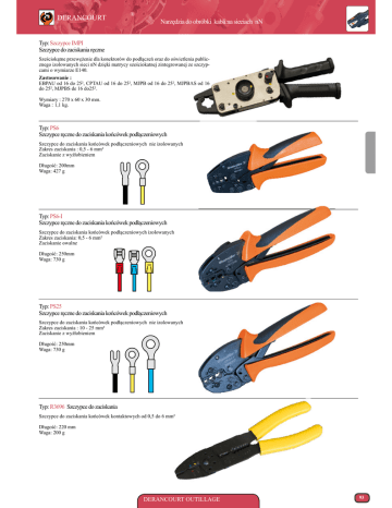DERANCOURT ® Narzędzia do obróbki kabli na sieciach nN Typ: Szczypce IMPI Szczypce do zaciskania ręczne Sześciokątne przewężenie dla konektorów do podłączeń oraz do oświetlenia publicznego izolowanych sieci nN dzięki matrycy sześciokatnej zintegrowanej ze szczypcami o wymiarze E140. Zastosowanie : EBPAU od 16 do 25², CPTAU od 16 do 25², MJPB od 16 do 25², MJPBAS AS od 16 do 25², MJPBS de 16 do25². Wymiary : 270 x 60 x 30 mm. Waga : 1,1 kg. Typ: PS6 Szczypce ręczne do zaciskania końcówek podłączeniowych Szczypce do zaciskania końcówek podłączeniowych nie izolowanych Zakres zaciskania : 0,5 - 6 mm² Zaciskanie z wyżłobieniem Długość: 200mm Waga: 427 g Typ: PS6-I Szczypce ręczne do zaciskania końcówek podłączeniowych Szczypce do zaciskania końcówek podłączeniowych izolowanych Zakres zaciskania: 0,5 - 6 mm² Zaciskanie owalne Długość: 250mm Waga: 730 g Typ: PS25 Szczypce ręczne do zaciskania końcówek podłączeniowych Szczypce do zaciskania końcówek podłączeniowych nie izolowanych Zakres zaciskania : 10 - 25 mm² Zaciskanie z wyżłobieniem Długość: 250mm Waga: 730 g Typ: R3696 Szczypce do zaciskania Szczypce do zaciskania końcówek kontaktowych od 0,5 do 6 mm² Długość: 220 mm Waga: 200 g DERANCOURT OUTILLAGE 93 NARZĘDZIA DO OBRÓBKI KABLI NA SIECIACH nN Typ: STRIPAX Narzędzie do odizolowywania i cięcia od 0,08 do 6 mm² Dla linek i drutów w izolacji PCV Automatyczne Rozw. szczęk po zdjęciu izolacji Długość odizolowywania ustawiana ogranicznikiem Charakterystyki: Odizolowanie : linki w izolacji PCV od 0,08 do 6 mm² Cięcie : linki w izolacji PCV od 0,08 do6 mm² Odizolowanie w jednej operacji linek, przewodów w w cienkiej taśmie oraz wieloprzewodowych. Bez uszkodzenia przewodu dzięki specjalnej konstrukcji ostrza Długość: 190 mm - Waga: 155 g Typ: STRIPAX 2 Narzędzie do odizolowywania i cięcia od 6 do 16 mm² Dla linek i drutów w izolacji PCV Automatyczne Rozw. szczęk po zdjęciu izolacji Długość odizolowywania ustawiana ogranicznikiem Charakterystyki: Odizolowanie : linki w izolacji PCV od 6 do 16 mm² Cięcie : linki i druty w izolacji PCV aż do 6 mm² Bez uszkodzenia przewodu dzięki specjalnej konstrukcji ostrza Długość: 190 mm - Waga: 155 g Typ: AM Narzędzie do odizolowywania kabli okrągłych w PCV Cięcie okrężne i wzdłużne Uchwyt ściskający samo-naciągający. Pokrętło do regulacji głębokości cięcia Dźwignia do przekręcenia ostrza w celu wykonania cięcia wzdłużnego Ostrza zapasowe w dolnej części rączki Typ AM1 AM2 Ø przewodu 4.5 do 25 mm 25 do 36 mm Długość 135 mm 140 mm Waga 135 g 135 g Typ: SES 30 51 Narzędzie do odizolowywania z chowanym ostrzem ze stopką. Ostzre chowane wyposażone w stopkę prowadzącą do cięcia wzdłużnego izolacji przewodu o grubości maksymalnej 3,5 mm. Rączka izolacyjna z tworzywa (Polyamide) Homologacja EDF do PPN: "narzędzie do zdejmowania izolacji FT-BT n°536" Długość: 170 mm - Waga: 90 g Typ: R3840 Narzędzie do zdejmowania izolacji od Ø 8 do 28 mm Głębokość cięcia regulowana pokrętłem Cięcie okrężne i wzdłużne Zapasowe ostrze w rękojeści Długość: 130 mm - Waga: 70 g 94 DERANCOURT OUTILLAGE DERANCOURT ®