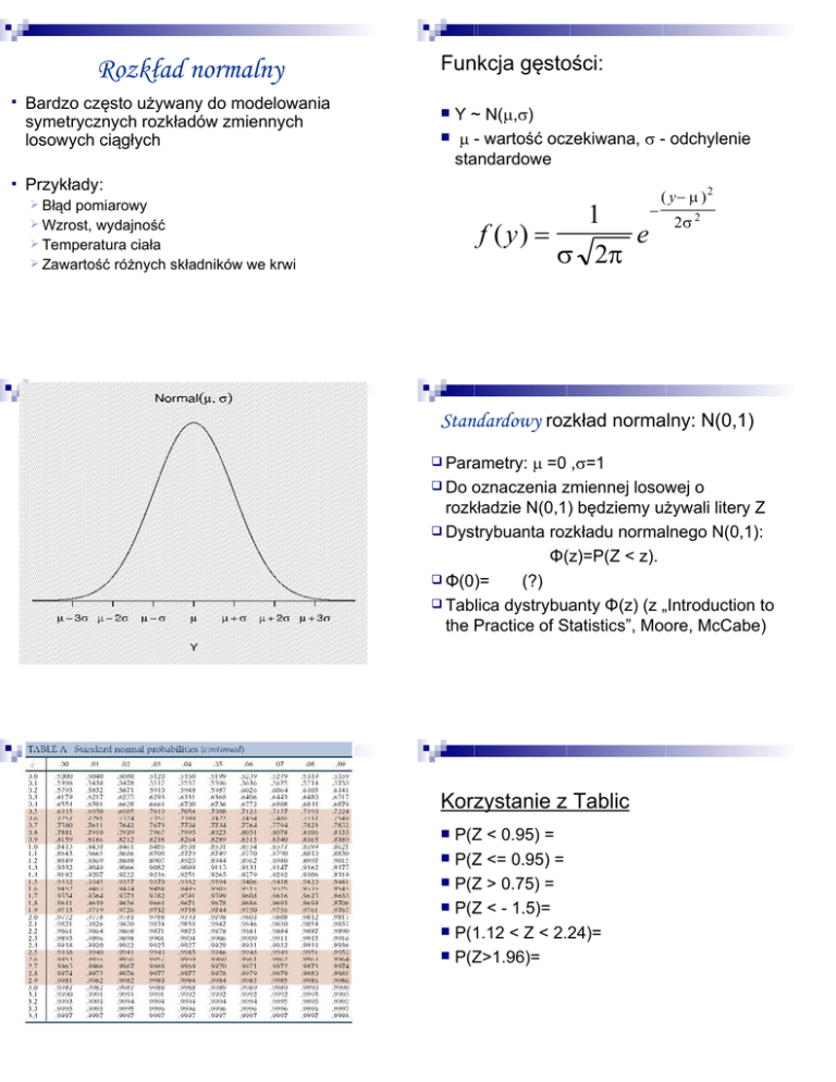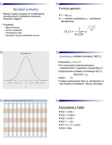 Rozkład normalny Bardzo często używany do modelowania symetrycznych rozkładów zmiennych losowych ciągłych Przykłady: Funkcja gęstości: Y ~ N(,) - wartość oczekiwana, - odchylenie standardowe Błąd pomiarowy Wzrost, wydajność Temperatura ciała Zawartość różnych składników we krwi 1 f ( y) e 2 ( y )2 2 2 Standardowy rozkład normalny: N(0,1) =0 ,=1 Do oznaczenia zmiennej losowej o rozkładzie N(0,1) będziemy używali litery Z Dystrybuanta rozkładu normalnego N(0,1): Φ(z)=P(Z < z). Φ(0)= (?) Tablica dystrybuanty Φ(z) (z „Introduction to the Practice of Statistics”, Moore, McCabe) Parametry: Korzystanie z Tablic P(Z < 0.95) = P(Z <= 0.95) = P(Z > 0.75) = P(Z < - 1.5)= P(1.12 < Z < 2.24)= P(Z>1.96)= Pożyteczne wzory: Φ(-z) = P(Z > z) = P(z1 < Z < z2) = Ćwiczenie: Pr(|Z| > 1.96) = Dowolny rozkład normalny: N(, ) Załóżmy, że poziom cholesterolu w pewnej populacji ma rozkład normalny o średniej = 220 i odchyleniu std. = 40. Y ma rozkład N(220, 40) Jaka część populacji ma poziom cholesterolu powyżej 240? Standaryzacja: Y ~ N(,) (Y-)/ ma rozkład normalny! Oznaczmy Z= (Y-)/. Mamy: EZ= Var(Z)= Zatem Z~ N(0,1)! Przykład cd. P (Y > 240)=... tj. P(Y>y), gdzie y=240. Oznaczamy z = (y-)/ = (240-220)/40 = 0.5. P(Y > 240) = P(Z > 0.5)= Jakie jest p-stwo, że u losowo wybranej osoby cholesterol będzie pomiędzy 200 a 260? y1 = 200; z1 = (200-220)/40 = -0.5; y2 = 260; z2 = (260-220)/40 = 1.0; P(200 < Y < 260) = P(-0.5 < Z < 1.0) = Oblicz P(Y < 170) Reguła 68%–95%–99.7% (reguła 3 ) Jeżeli zmienna X ma rozkład normalny, to P(-<X<+)= P(-2<X<+2)= P(-3<X<+3)= Kwantyle W jakim punkcie y dystrybuanta osiąga zadaną wartość p? Przykłady: Mediana to kwantyl rzędu 50%. Trzeci kwartyl to kwantyl rzędu 75%. Kwantyle Y~N(μ, σ) Kwantyle rozkładu N(0,1) yp= μ+σzp Znajdź trzeci kwartyl rozkładu poziomu cholesterolu. Znajdź kwantyl rzędu 0.1 dla rozkładu poziomu cholesterolu. z0.1= z0.9= Ocena normalności 68 70 Data :61.0 62.5 63.0 64.0 64.5 65.0 66.5 67.0 68.0 68.5 70.5 66 a Policzmy procent obserwacji, które znajdują się w odległości 1s, 2s and 3s od y . Przykład: poziomy serum CK n = 36, y = 98.28 i s = 40.38. 26/36 = 72% obserwacji jest w przedziale y 1s 34/36 = 94% obserwacji jest w przedziale y 2s 36/36 = 100% obserwacji jest w przedziale y 3s To w przybliżeniu odpowiada wartościom dla rozkładu normalnego. OK. 64 Wykres kwantyl-kwantyl (QQ plot) 62 Reguła 3 Znaczna część procedur statystycznych, które poznamy w dalszej części kursu wymaga założenia, że próba pochodzi z populacji o rozkładzie normalnym. Założenie to można sprawdzać to przez pewne proste (orientacyjne) obliczenia lub rysując wykres kwantyl-kwantyl... -1 0 Quantiles of Standard Normal 1