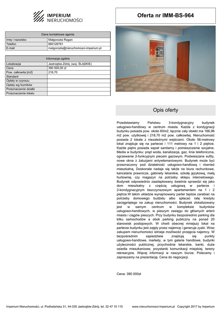 Oferta nr IMM-BS-964 Dane kontaktowe agenta Imię i nazwisko Telefon E-mail Małgorzata Ragan 660126761 [email protected] Informacje ogólne Lokalizacja Cena Pow. całkowita [m2] Standard Opłaty w czynszu Opłaty wg liczników Przeznaczenie działki Przeznaczenie lokalu Jastrzębie-Zdrój, (woj. ŚLĄSKIE) 390 000,00 zł 218,70 Opis oferty Przedstawiamy Państwu 3-kondygnacyjny budynek usługowo-handlowy w centrum miasta. Każda z kondygnacji budynku posiada pow. około 60m2, łącznie cały obiekt ma 166,96 m2 pow. użytkowej i 218,70 m2 pow. całkowitej. Nieruchomość posiada 2 lokale z niezależnymi wejściami. Około 56-metrowy lokal znajduje się na parterze i 111 metrowy na 1 i 2 piętrze. Każde piętro posiada węzeł sanitarny i pomieszczenie socjalne. Media w budynku: prąd woda, kanalizacja, gaz, linia telefoniczna, ogrzewanie 2-funkcyjnym piecem gazowym. Podwieszane sufity, nowe okna z żaluzjami antywłamaniowymi. Budynek może być przeznaczony pod działalność usługowo-handlową i również mieszkalną. Doskonale nadaje się także na biura rachunkowe, kancelarie prawnicze, gabinety lekarskie, szkołę językową, małą hurtownię, czy magazyn na potrzeby sklepu internetowego. Budynek odpowiednio zaadaptowany świetnie sprawdzi się jako dom mieszkalny z częścią usługową w parterze i 2-kondygnacyjnym bezczynszowym apartamentem na 1 i 2 piętrze.W takim układzie wynajmowany parter będzie zarabiać na potrzeby domowego budżetu albo spłacać ratę kredytu zaciągniętego na zakup nieruchomości. Budynek zlokalizowany jest w samym centrum w kompleksie budynków usługowo-handlowych, w pieszym zasięgu do głównych arterii miasta i ciągów pieszych. Przy budynku bezpośrednio parking dla kilku samochodów a obok parking publiczny na ponad 20 stanowisk postojowych. W chwili obecnej mniejszy lokal na parterze budynku jest zajęty przez najemcę i generuje zyski. Wraz zakupem nieruchomości istnieje możliwość przejęcia najemcy. W bezpośrednim sąsiedztwie znajdują się punkty usługowo-handlowe, markety, w tym galerie handlowe, budynki użyteczności publicznej, przychodnie lekarskie, banki, duże osiedla mieszkaniowe, przystanki komunikacji miejskiej, tereny rekreacyjne. Więcej informacji w naszym biurze. Polecamy i zapraszamy na prezentację. Cena do negocjacji. Cena: 390 000zł Imperium Nieruchomości, ul. Podhalańska 31, 44-335 Jastrzębie-Zdrój, tel. 32 47 10 115 www.nieruchomosci-imperium.pl Copyright 2017 by Imperium